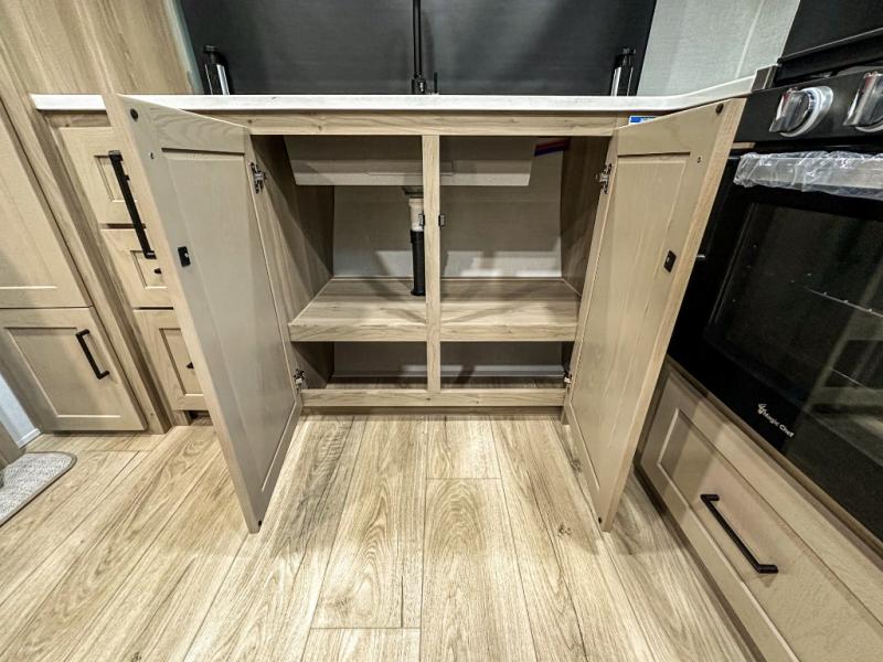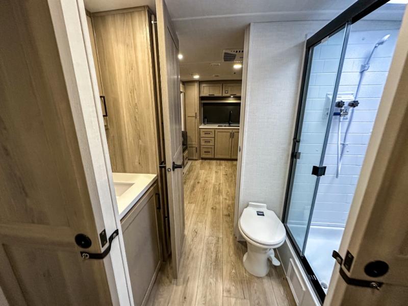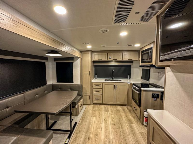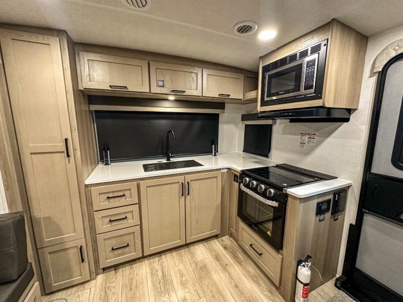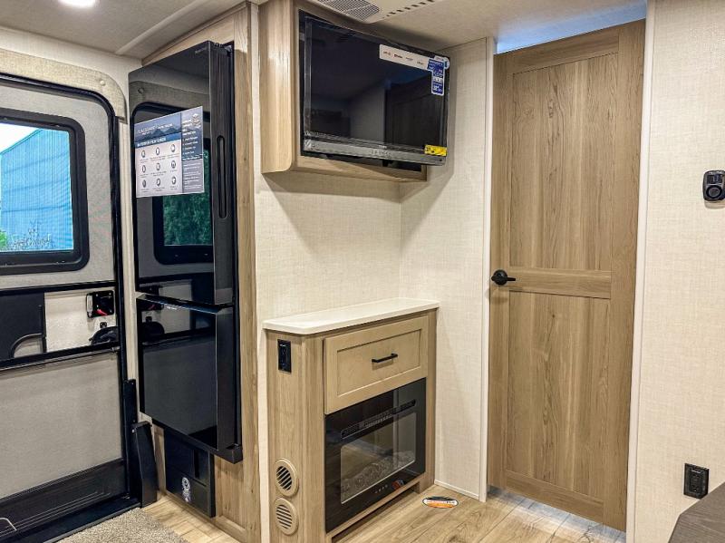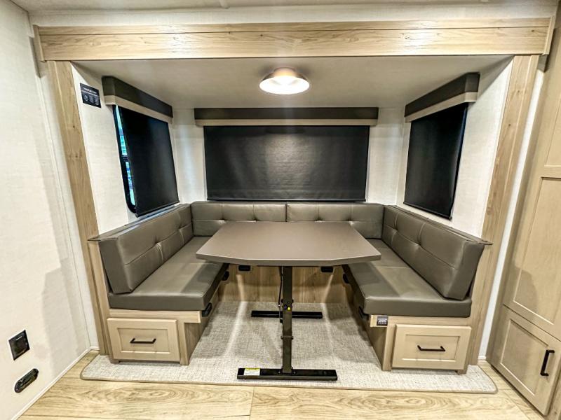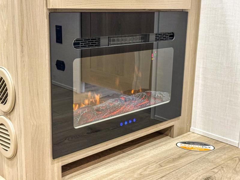 With dual entry doors and a front kitchen with generous counter space, this trailer is perfect for weekends at the campground! A U-shaped dinette slides provides more floor space inside, and it's in great view of the TV and fireplace. You'll find that the walk-thru bath is easily accessible, and the rear master bedroom will feel just like home with its RV queen bed and flip-up storage!