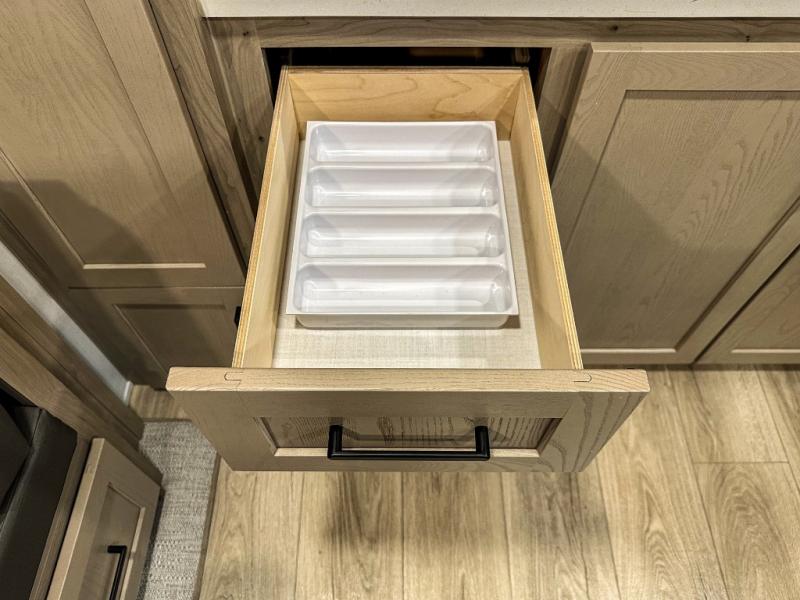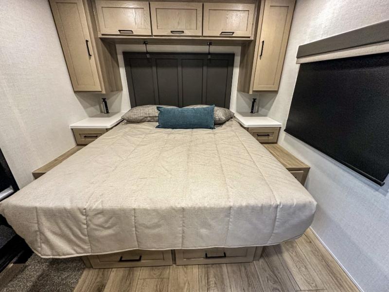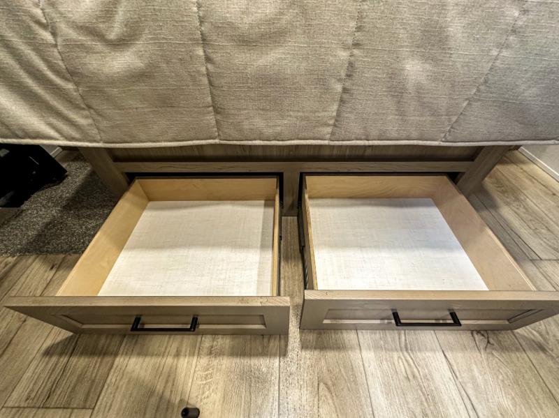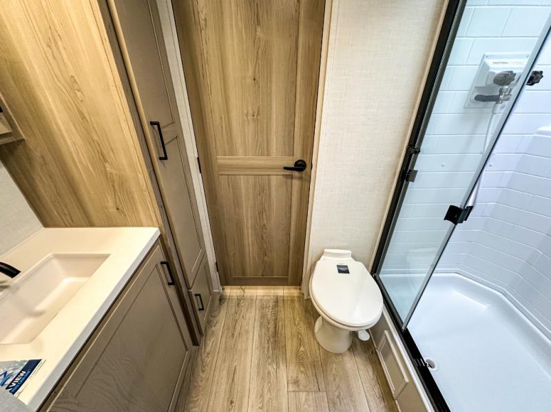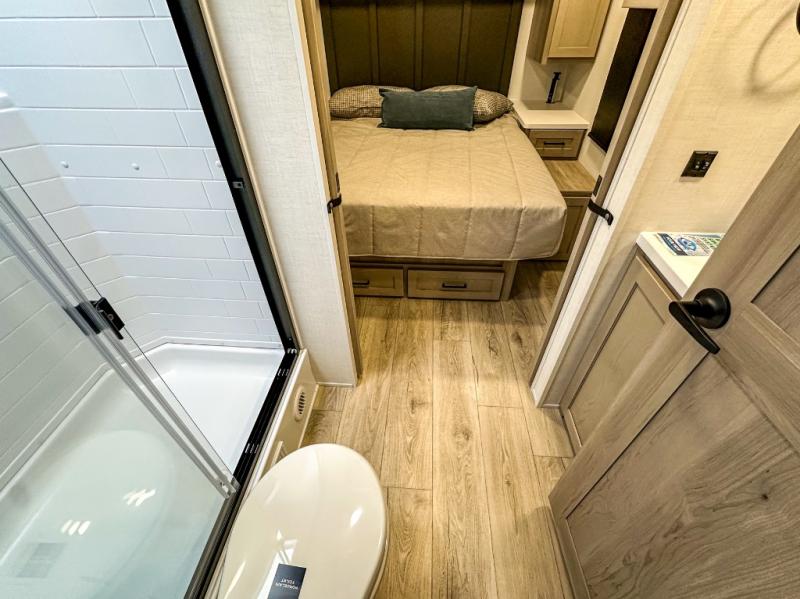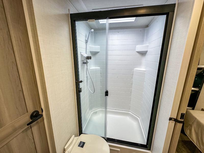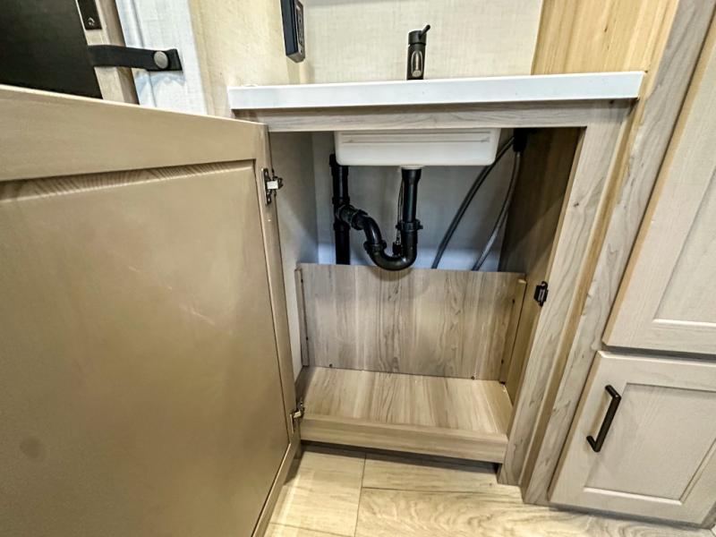 With dual entry doors and a front kitchen with generous counter space, this trailer is perfect for weekends at the campground! A U-shaped dinette slides provides more floor space inside, and it's in great view of the TV and fireplace. You'll find that the walk-thru bath is easily accessible, and the rear master bedroom will feel just like home with its RV queen bed and flip-up storage!