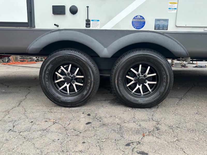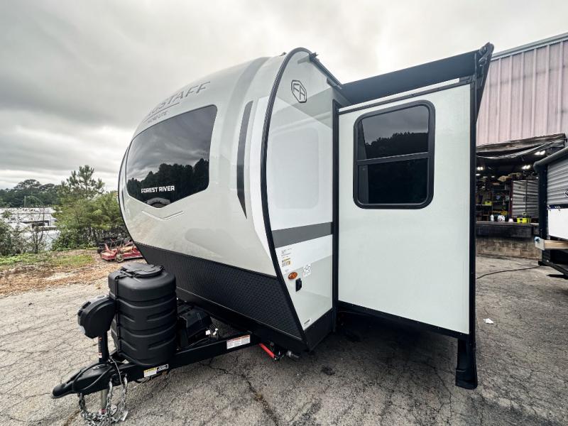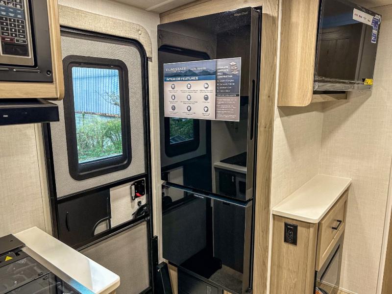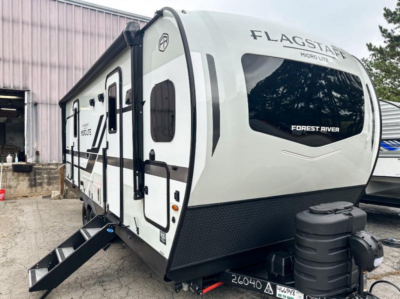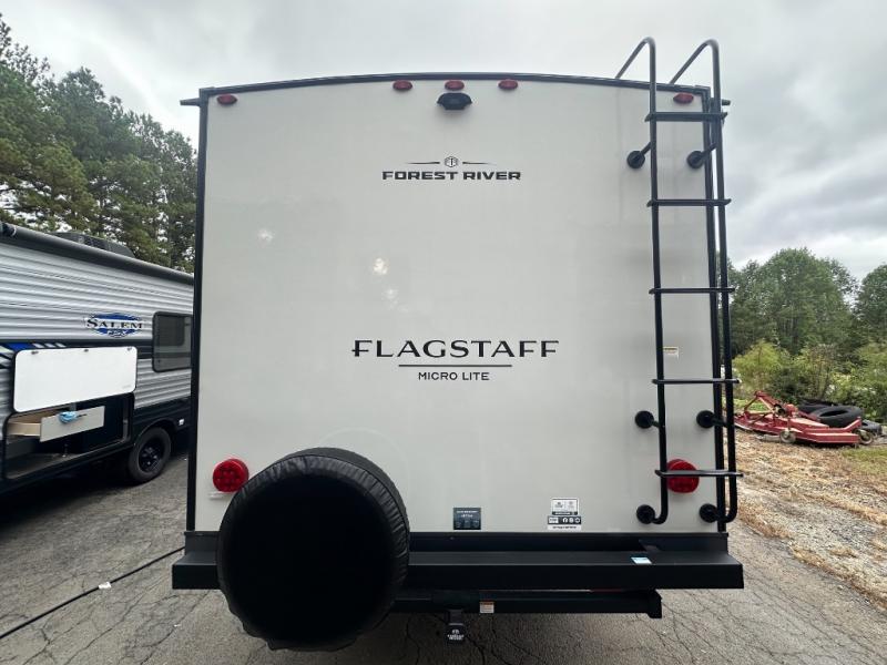 With any Flagstaff Micro Lite travel trailer by Forest River you will enjoy lightweight towing, durable construction, and added interior comforts to make each trip memorable! Each model features RoadTech tire pressure monitoring, Dexter Torflex axles, and nitrogen-filled Goodyear endurance tires for smooth towing from home to campground. The 6-sided aluminum framed construction provides a strong foundation so you can enjoy your RV for years to come, plus the radiant foil in the front cap, underbelly and slides help insulate your trailer. Additional exterior features include a 200W solar panel, back-up camera prep, frameless windows, and slam baggage doors. Each model includes the Great Expectations Package with roller shades, solid surface kitchen countertops, and hidden hinge cabinet doors. There is also an exterior hot/cold water port, outside speakers, a power tongue jack and stabilizer jacks, plus many more conveniences.