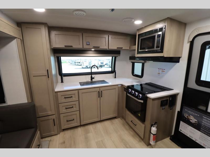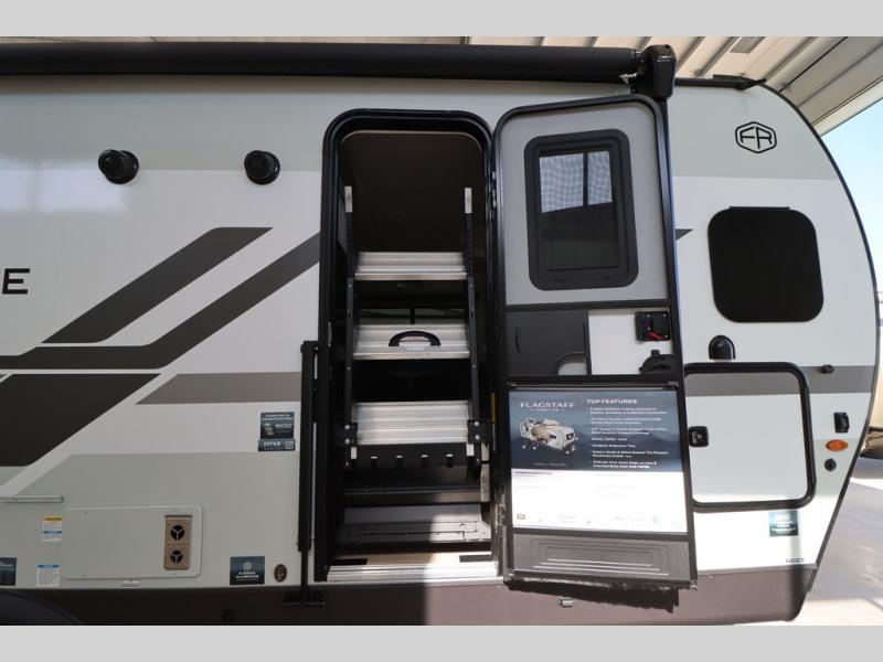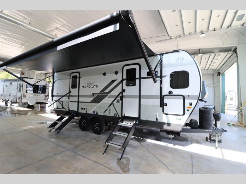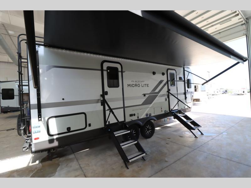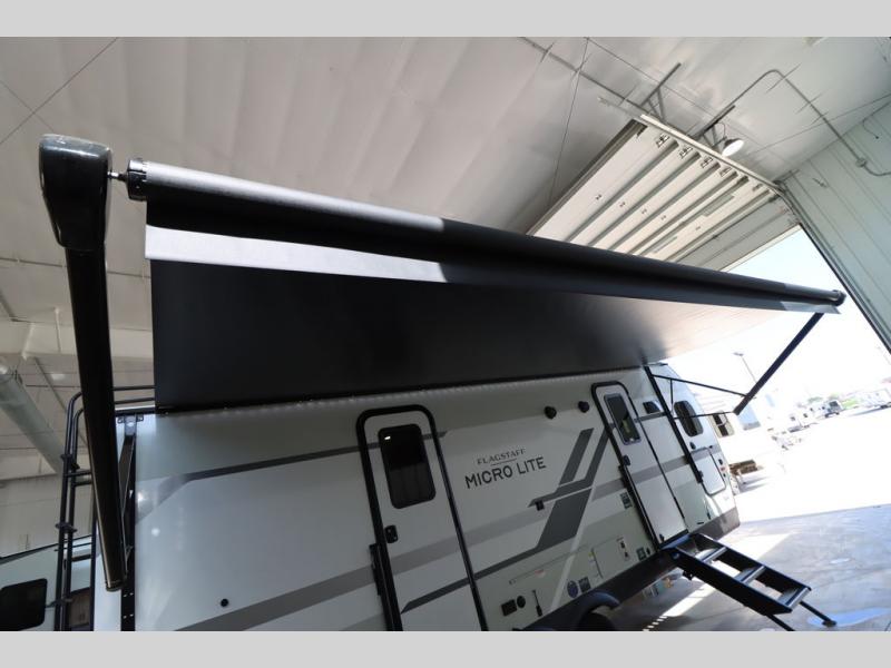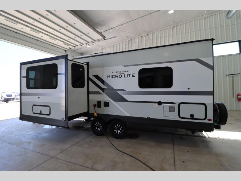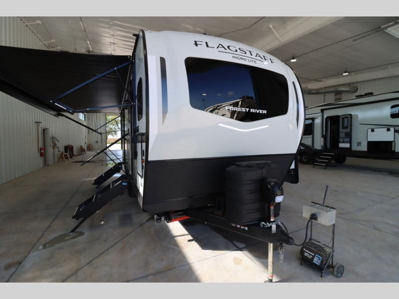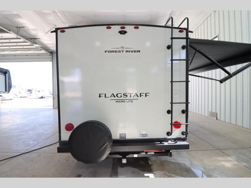 With any Flagstaff Micro Lite travel trailer by Forest River you will enjoy lightweight towing, durable construction, and added interior comforts to make each trip memorable! Each model features RoadTech tire pressure monitoring, Dexter Torflex axles, and nitrogen-filled Goodyear endurance tires for smooth towing from home to campground. The 6-sided aluminum framed construction provides a strong foundation so you can enjoy your RV for years to come, plus the radiant foil in the front cap, underbelly and slides help insulate your trailer. Additional exterior features include a 200W solar panel, back-up camera prep, frameless windows, and slam baggage doors. Each model includes the Great Expectations Package with roller shades, solid surface kitchen countertops, and hidden hinge cabinet doors. There is also an exterior hot/cold water port, outside speakers, a power tongue jack and stabilizer jacks, plus many more conveniences.