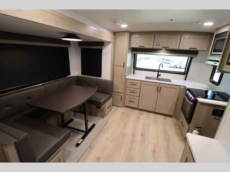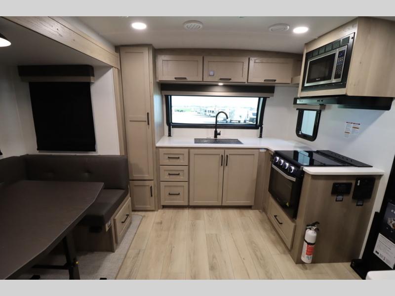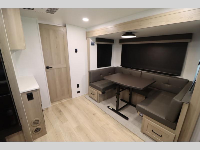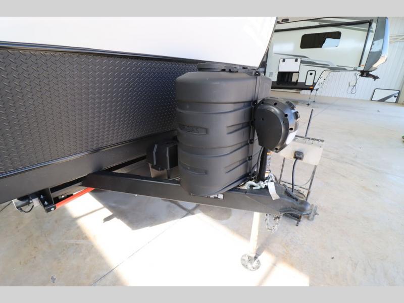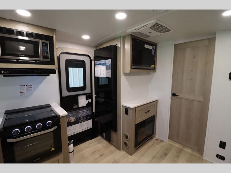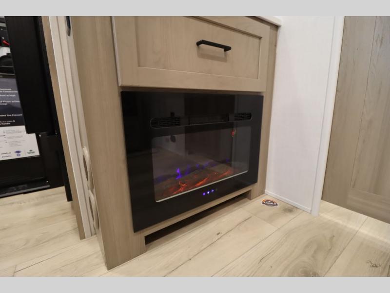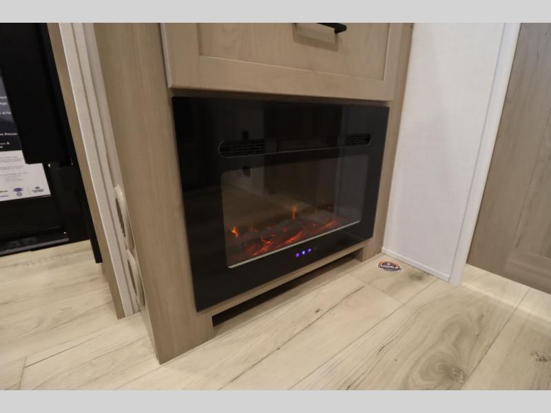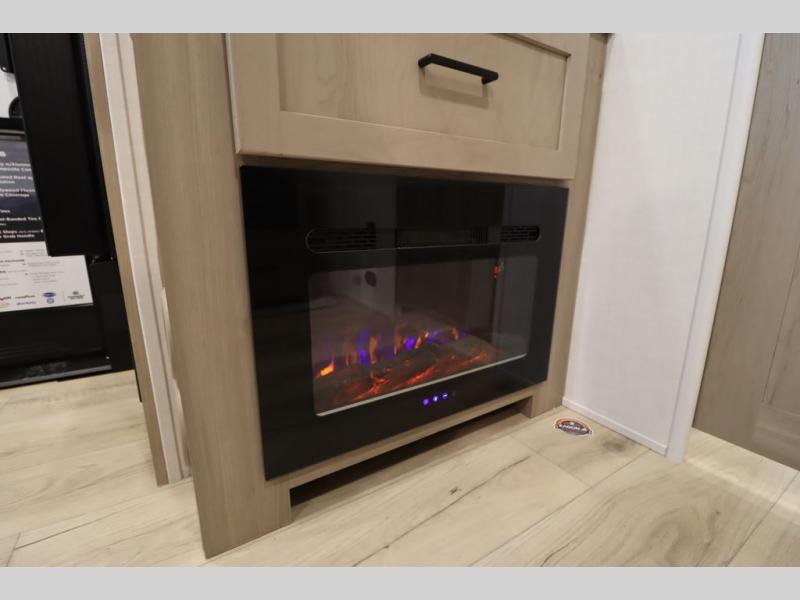 With dual entry doors and a front kitchen with generous counter space, this trailer is perfect for weekends at the campground! A U-shaped dinette slides provides more floor space inside, and it's in great view of the TV and fireplace. You'll find that the walk-thru bath is easily accessible, and the rear master bedroom will feel just like home with its RV queen bed and flip-up storage!