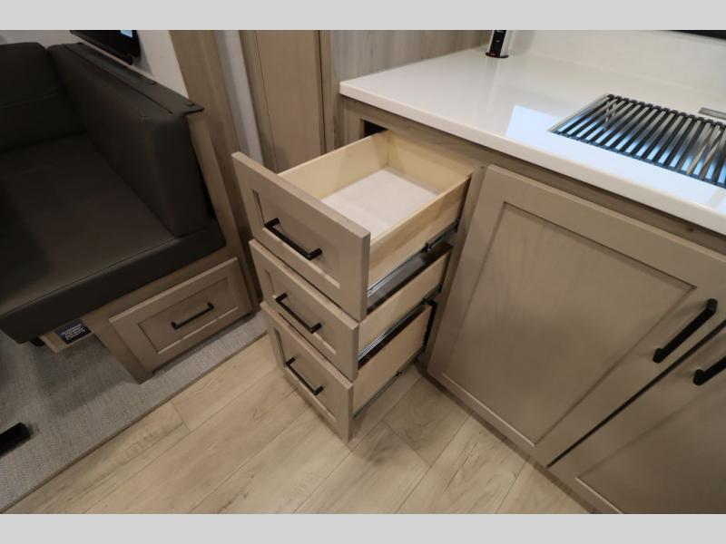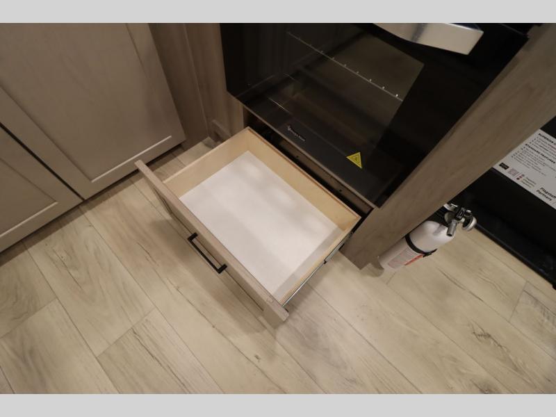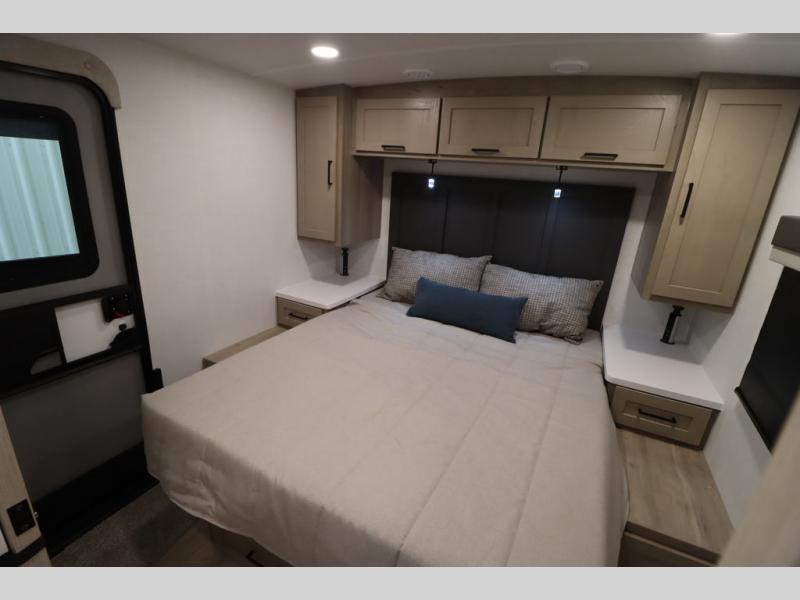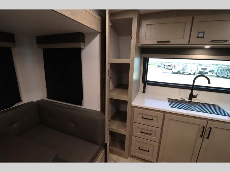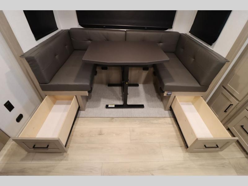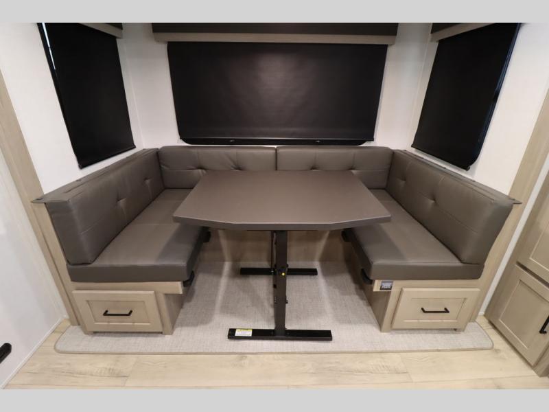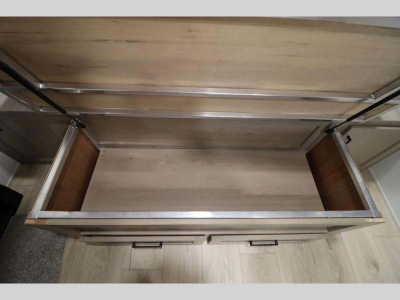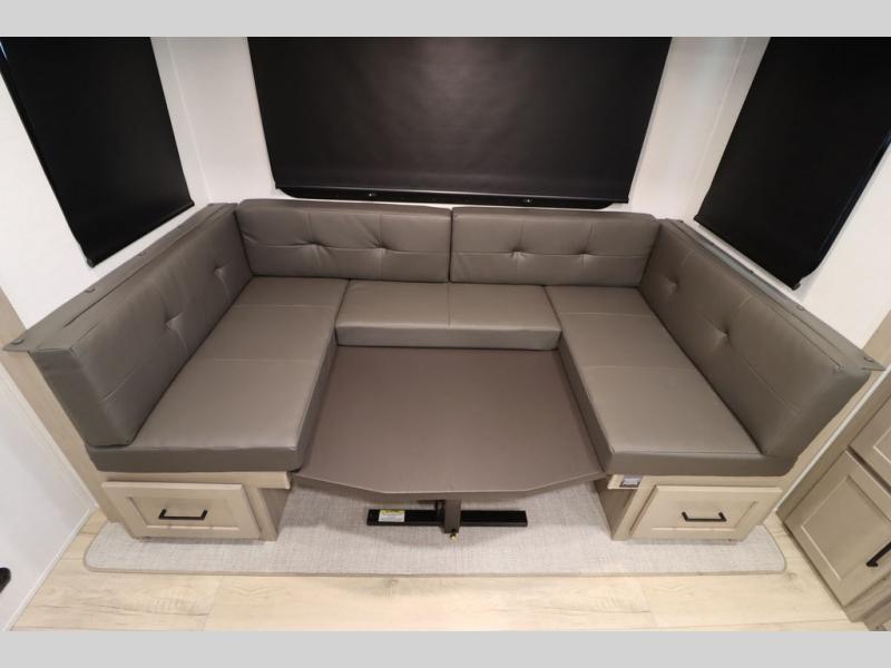 With dual entry doors and a front kitchen with generous counter space, this trailer is perfect for weekends at the campground! A U-shaped dinette slides provides more floor space inside, and it's in great view of the TV and fireplace. You'll find that the walk-thru bath is easily accessible, and the rear master bedroom will feel just like home with its RV queen bed and flip-up storage!