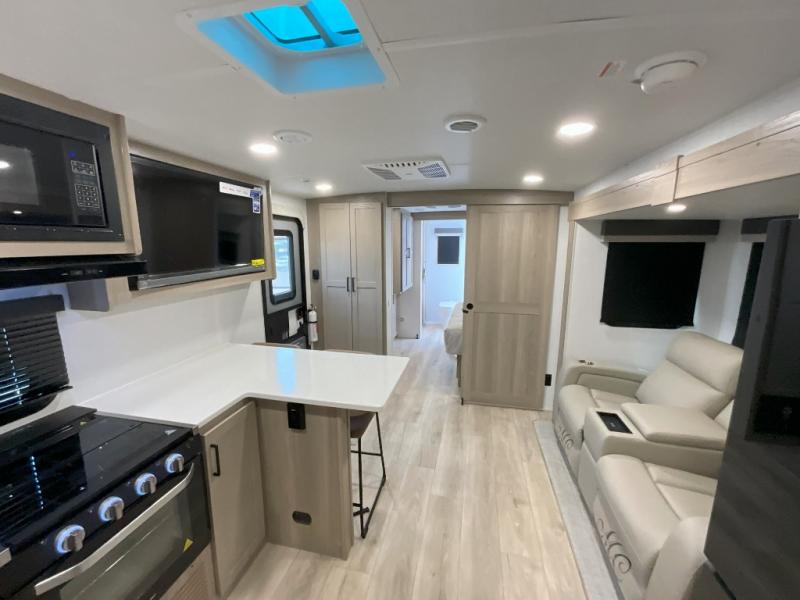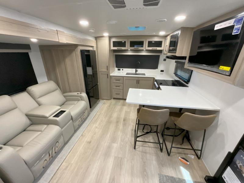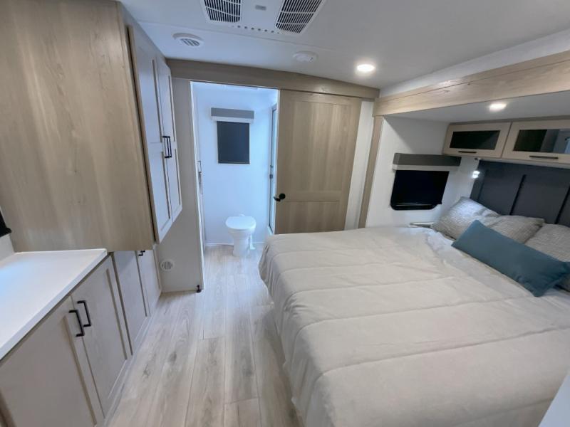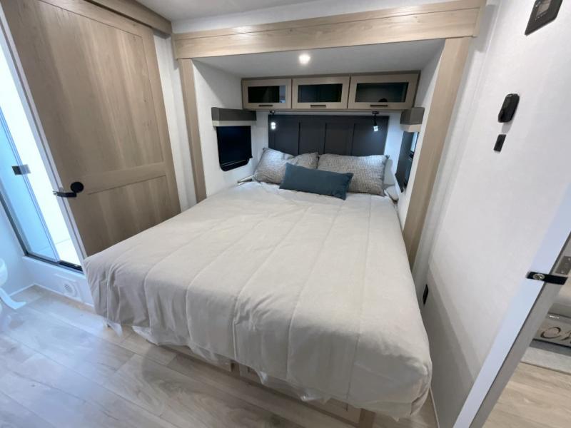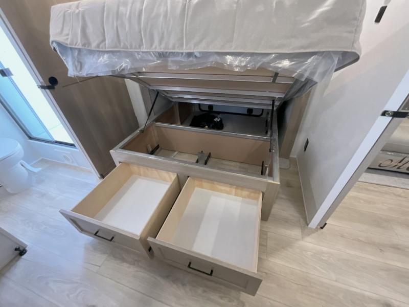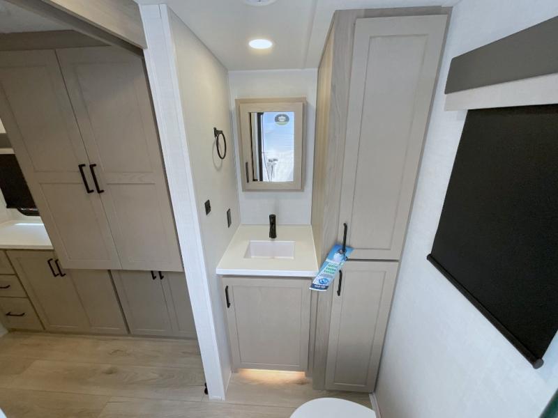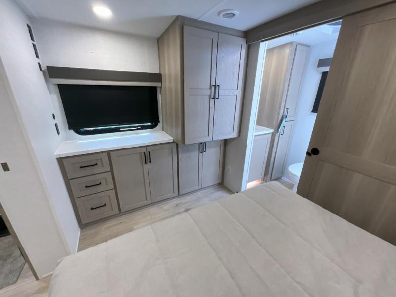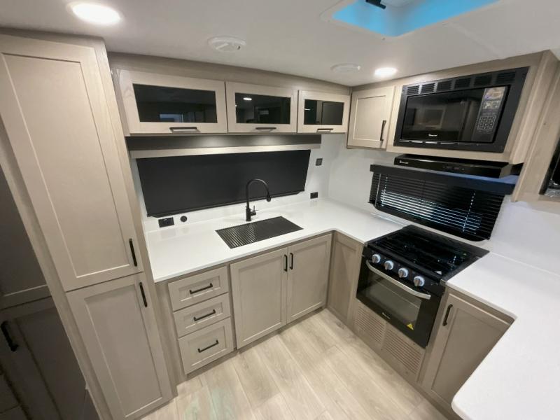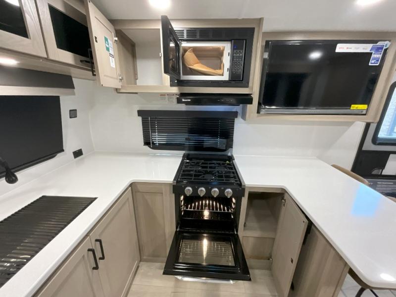 This front kitchen travel trailer is sure to make all your camping wishes come true. It's perfect for a couple since there is a master bedroom with a 60" x 80" queen bed, plus a theater seat in the main living area. If you're needing additional sleeping spaces, just choose the optional hide-a-bed sofa in place of the theater seat. The generous counter space in the kitchen will give you plenty of space to prep meals, and there is a bartop with stools where you can dine together. Along with the queen bed slide, the bedroom also includes a dresser, a TV option, plus a wardrobe with washer and dryer prep if you choose to add these appliances. And don't overlook the full rear bath to freshen up each day!