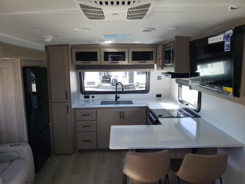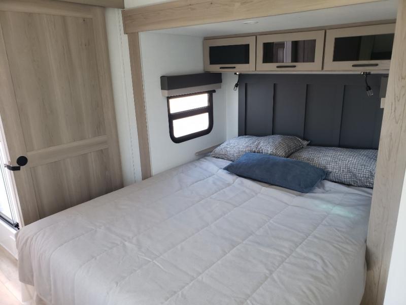 This front kitchen travel trailer is sure to make all your camping wishes come true. It's perfect for a couple since there is a master bedroom with a 60" x 80" queen bed, plus a theater seat in the main living area. If you're needing additional sleeping spaces, just choose the optional hide-a-bed sofa in place of the theater seat. The generous counter space in the kitchen will give you plenty of space to prep meals, and there is a bartop with stools where you can dine together. Along with the queen bed slide, the bedroom also includes a dresser, a TV option, plus a wardrobe with washer and dryer prep if you choose to add these appliances. And don't overlook the full rear bath to freshen up each day!