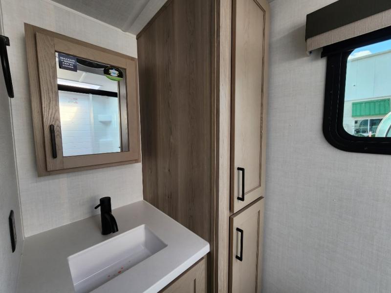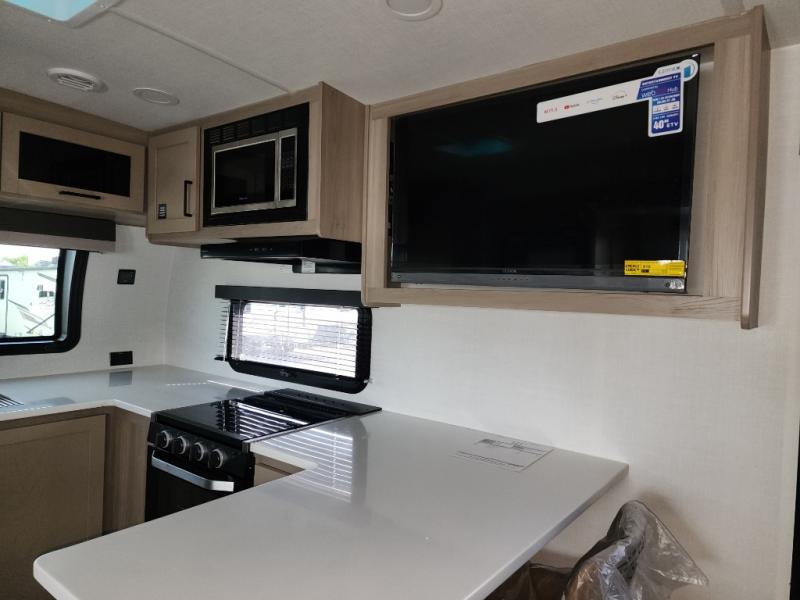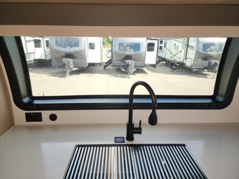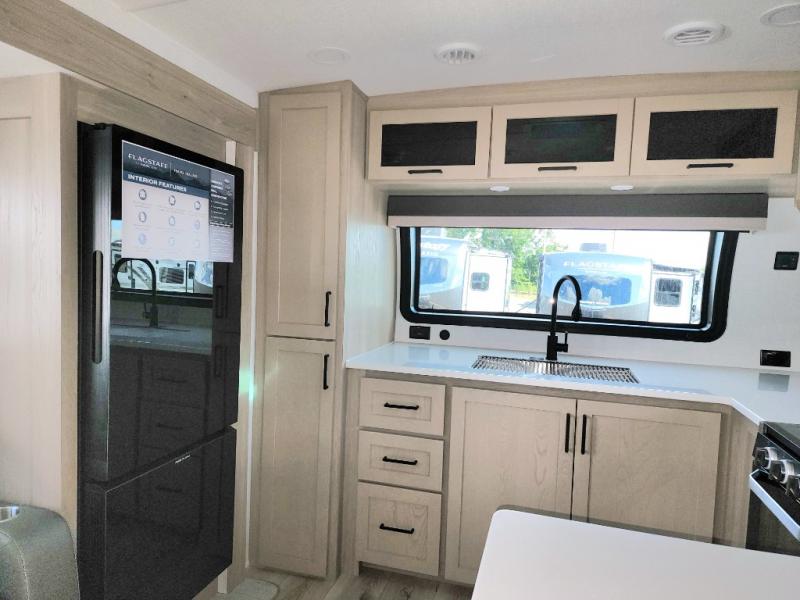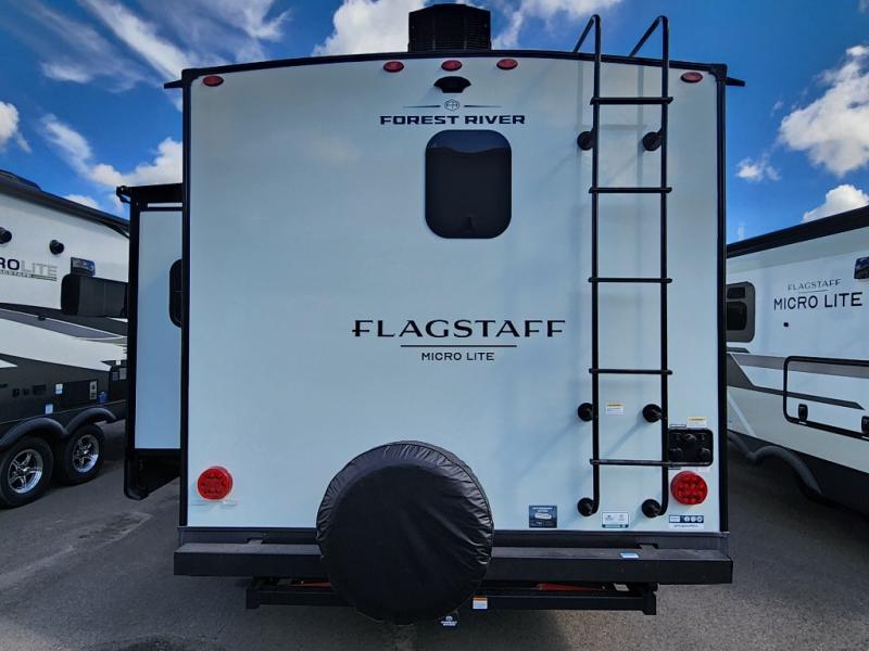 With any Flagstaff Micro Lite travel trailer by Forest River you will enjoy lightweight towing, durable construction, and added interior comforts to make each trip memorable! Each model features RoadTech tire pressure monitoring, Dexter Torflex axles, and nitrogen-filled Goodyear endurance tires for smooth towing from home to campground. The 6-sided aluminum framed construction provides a strong foundation so you can enjoy your RV for years to come, plus the radiant foil in the front cap, underbelly and slides help insulate your trailer. Additional exterior features include a 200W solar panel, back-up camera prep, frameless windows, and slam baggage doors. Each model includes the Great Expectations Package with roller shades, solid surface kitchen countertops, and hidden hinge cabinet doors. There is also an exterior hot/cold water port, outside speakers, a power tongue jack and stabilizer jacks, plus many more conveniences.