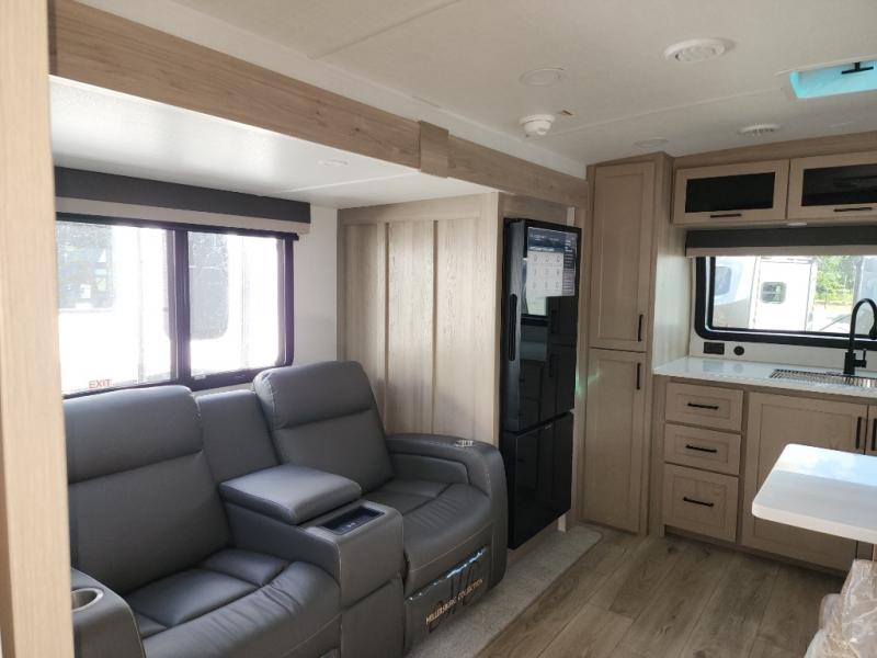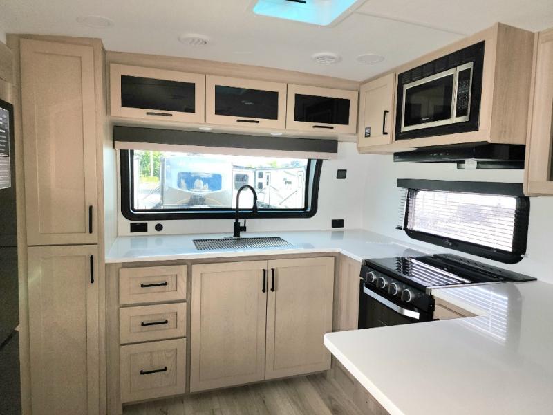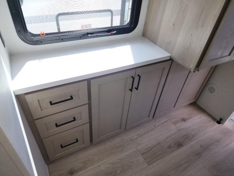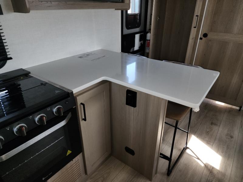 This front kitchen travel trailer is sure to make all your camping wishes come true. It's perfect for a couple since there is a master bedroom with a 60" x 80" queen bed, plus a theater seat in the main living area. If you're needing additional sleeping spaces, just choose the optional hide-a-bed sofa in place of the theater seat. The generous counter space in the kitchen will give you plenty of space to prep meals, and there is a bartop with stools where you can dine together. Along with the queen bed slide, the bedroom also includes a dresser, a TV option, plus a wardrobe with washer and dryer prep if you choose to add these appliances. And don't overlook the full rear bath to freshen up each day!