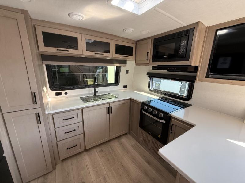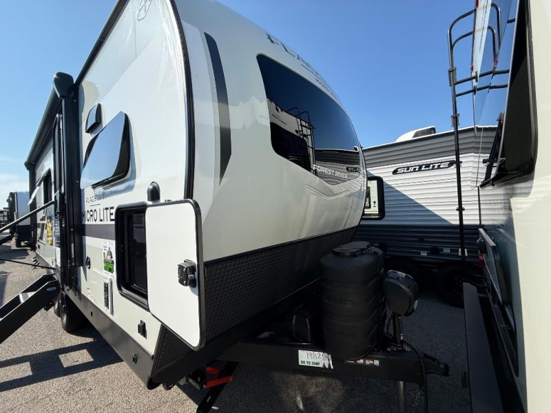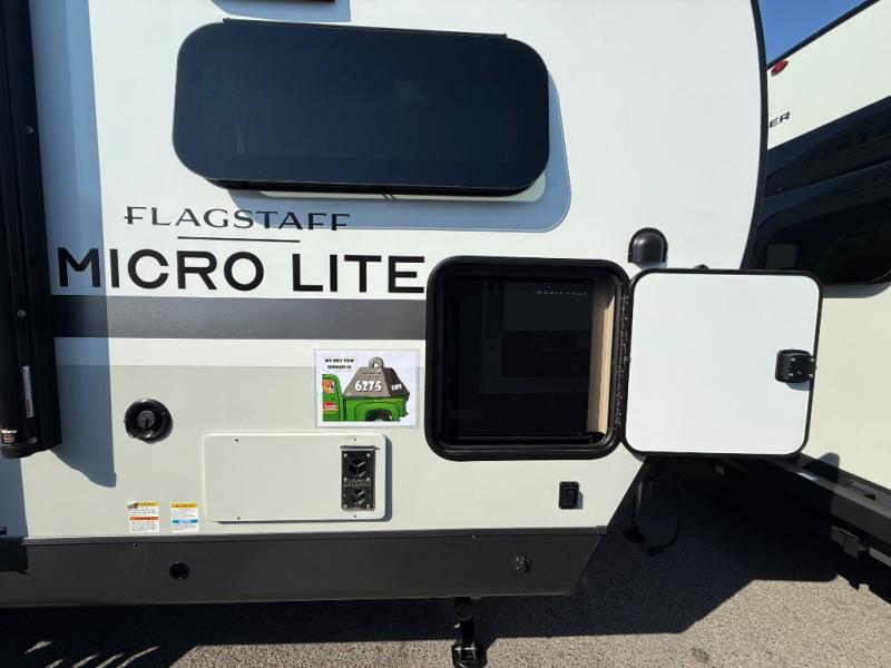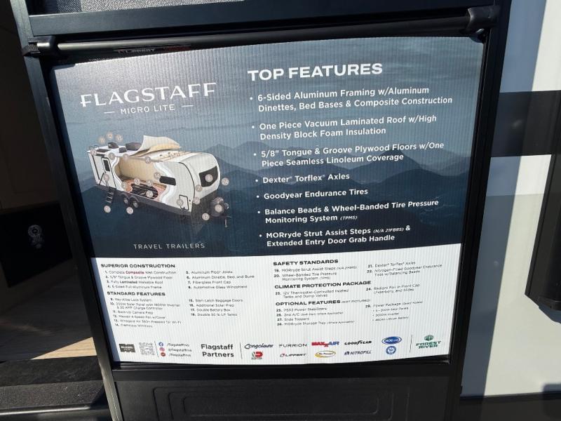 With any Flagstaff Micro Lite travel trailer by Forest River you will enjoy lightweight towing, durable construction, and added interior comforts to make each trip memorable! Each model features RoadTech tire pressure monitoring, Dexter Torflex axles, and nitrogen-filled Goodyear endurance tires for smooth towing from home to campground. The 6-sided aluminum framed construction provides a strong foundation so you can enjoy your RV for years to come, plus the radiant foil in the front cap, underbelly and slides help insulate your trailer. Additional exterior features include a 200W solar panel, back-up camera prep, frameless windows, and slam baggage doors. Each model includes the Great Expectations Package with roller shades, solid surface kitchen countertops, and hidden hinge cabinet doors. There is also an exterior hot/cold water port, outside speakers, a power tongue jack and stabilizer jacks, plus many more conveniences.
