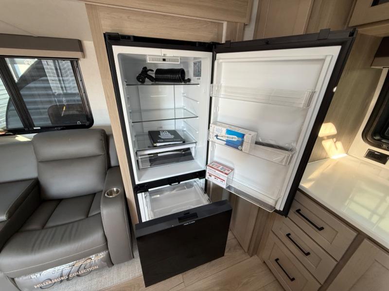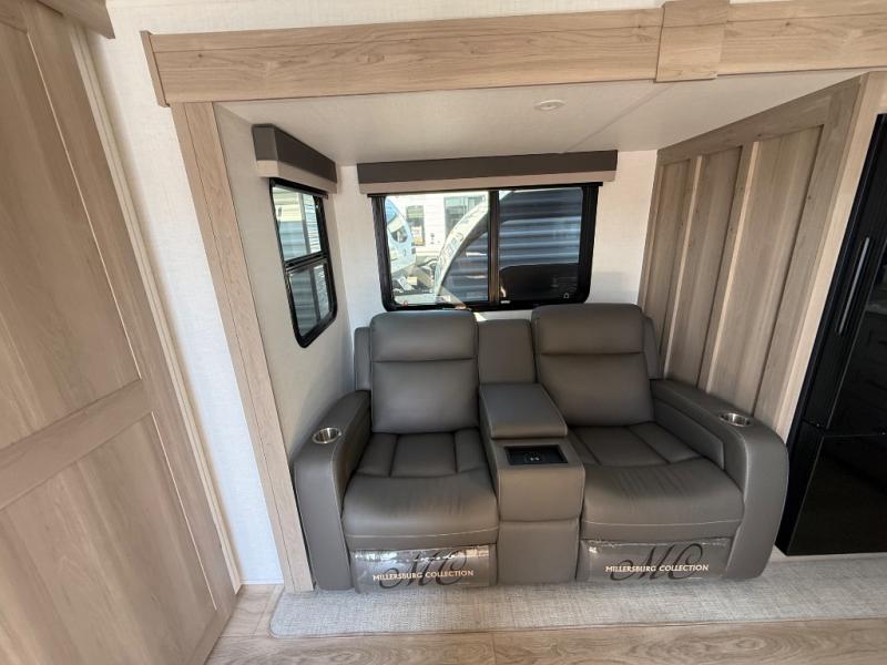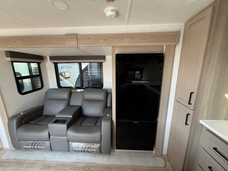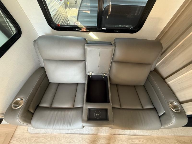 This front kitchen travel trailer is sure to make all your camping wishes come true. It's perfect for a couple since there is a master bedroom with a 60" x 80" queen bed, plus a theater seat in the main living area. If you're needing additional sleeping spaces, just choose the optional hide-a-bed sofa in place of the theater seat. The generous counter space in the kitchen will give you plenty of space to prep meals, and there is a bartop with stools where you can dine together. Along with the queen bed slide, the bedroom also includes a dresser, a TV option, plus a wardrobe with washer and dryer prep if you choose to add these appliances. And don't overlook the full rear bath to freshen up each day!