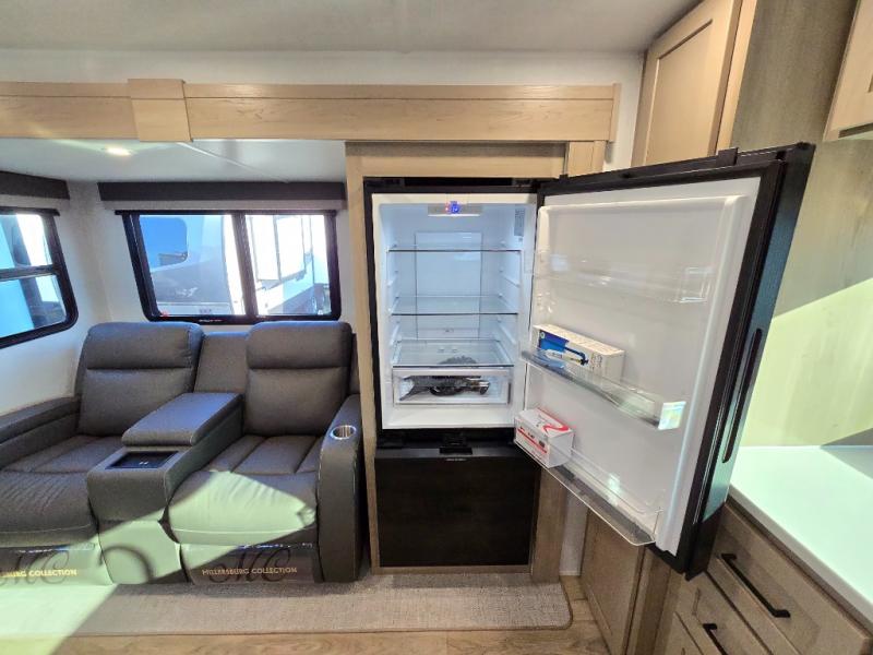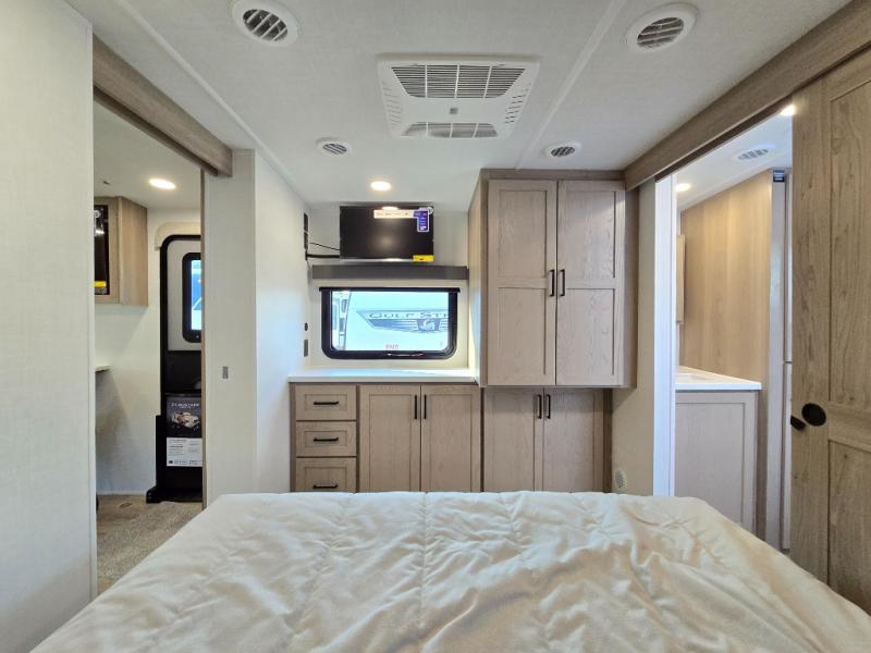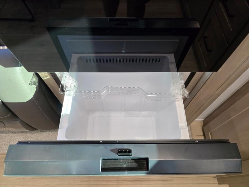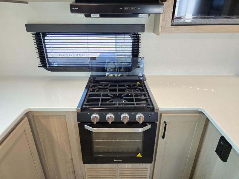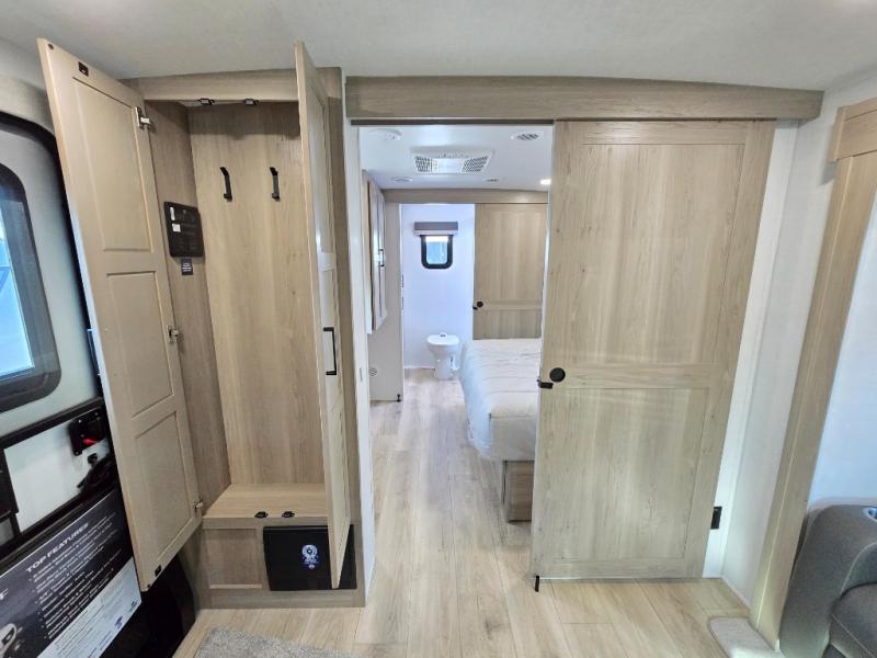 This front kitchen travel trailer is sure to make all your camping wishes come true. It's perfect for a couple since there is a master bedroom with a 60" x 80" queen bed, plus a theater seat in the main living area. If you're needing additional sleeping spaces, just choose the optional hide-a-bed sofa in place of the theater seat. The generous counter space in the kitchen will give you plenty of space to prep meals, and there is a bartop with stools where you can dine together. Along with the queen bed slide, the bedroom also includes a dresser, a TV option, plus a wardrobe with washer and dryer prep if you choose to add these appliances. And don't overlook the full rear bath to freshen up each day!