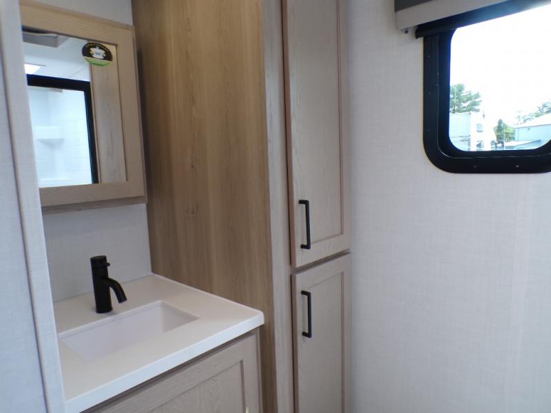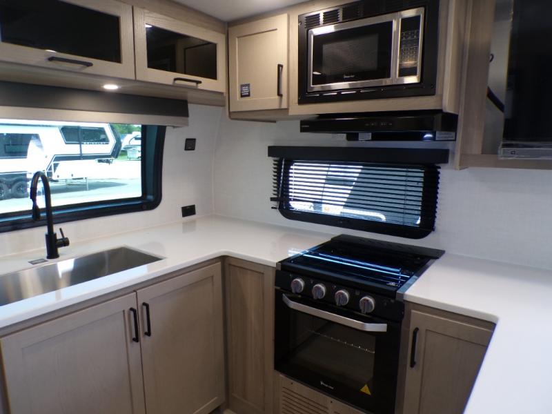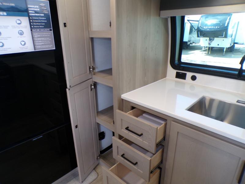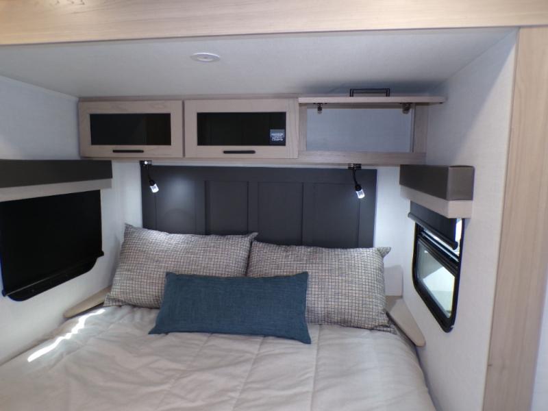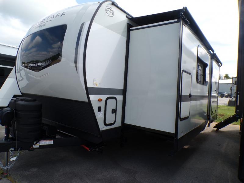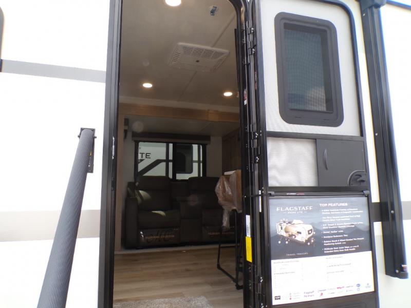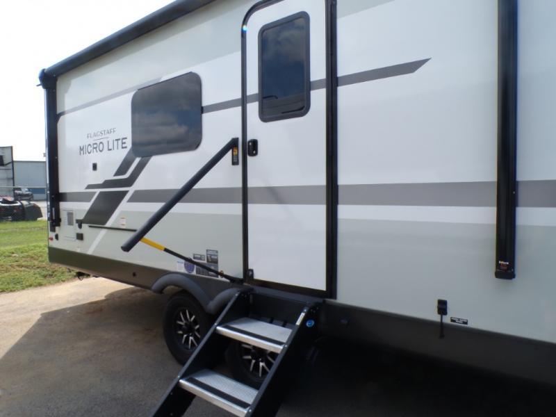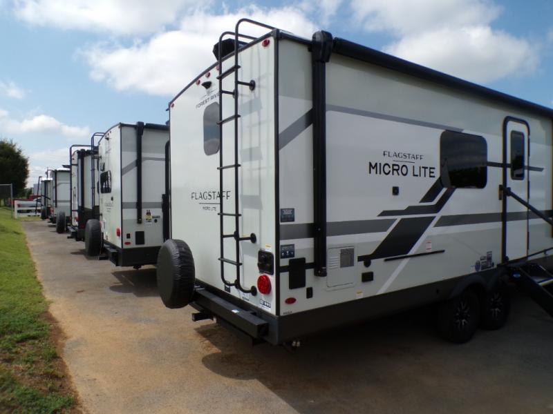 With any Flagstaff Micro Lite travel trailer by Forest River you will enjoy lightweight towing, durable construction, and added interior comforts to make each trip memorable! Each model features RoadTech tire pressure monitoring, Dexter Torflex axles, and nitrogen-filled Goodyear endurance tires for smooth towing from home to campground. The 6-sided aluminum framed construction provides a strong foundation so you can enjoy your RV for years to come, plus the radiant foil in the front cap, underbelly and slides help insulate your trailer. Additional exterior features include a 200W solar panel, back-up camera prep, frameless windows, and slam baggage doors. Each model includes the Great Expectations Package with roller shades, solid surface kitchen countertops, and hidden hinge cabinet doors. There is also an exterior hot/cold water port, outside speakers, a power tongue jack and stabilizer jacks, plus many more conveniences.