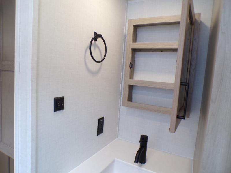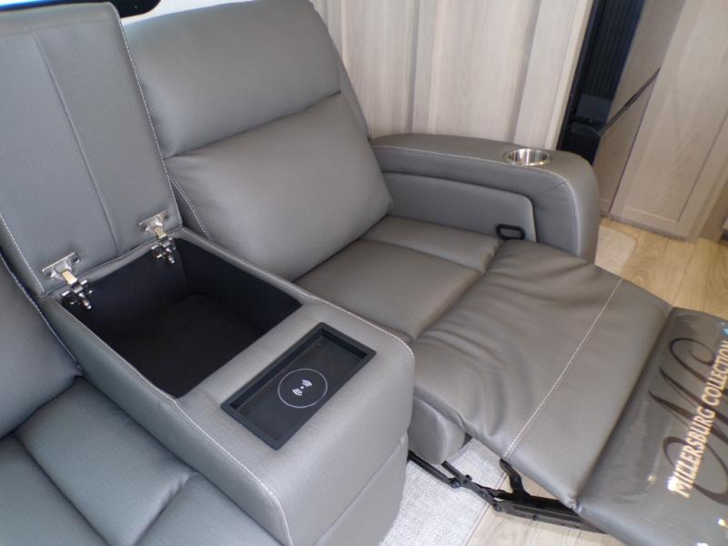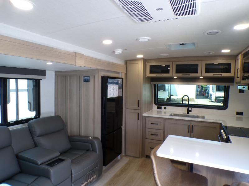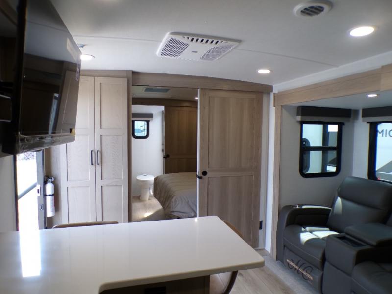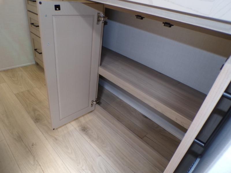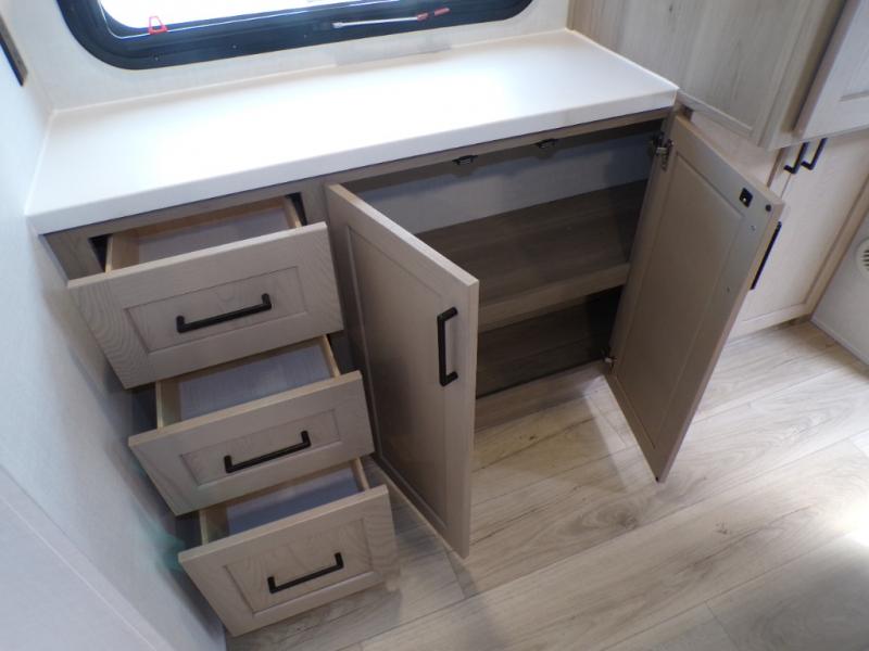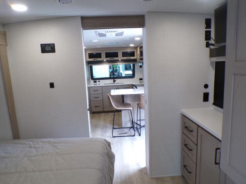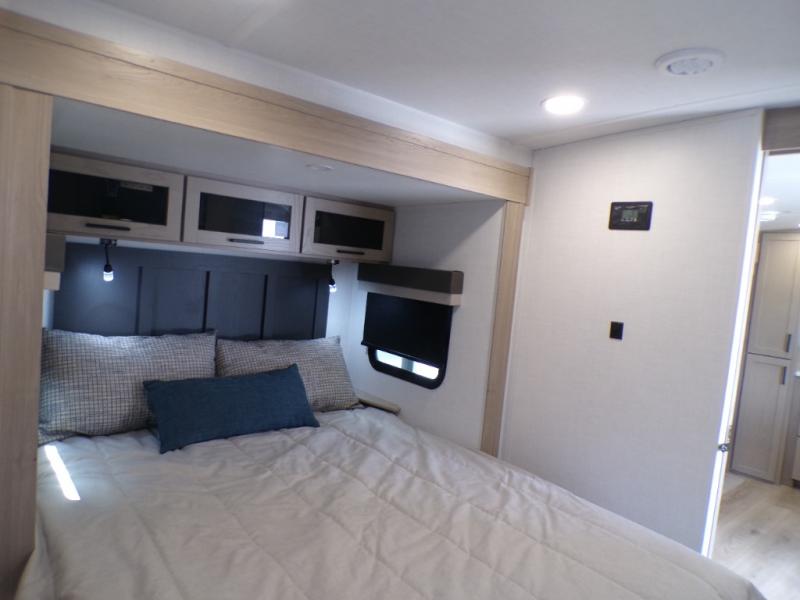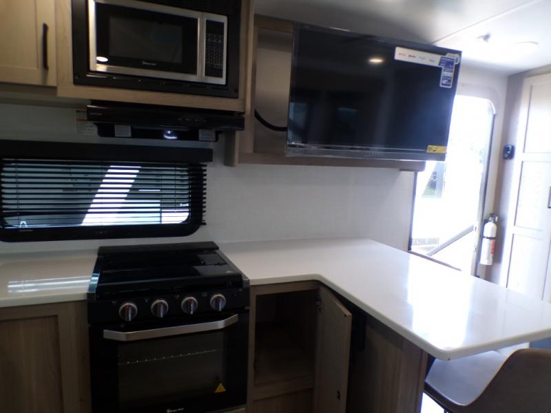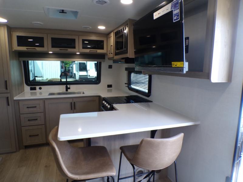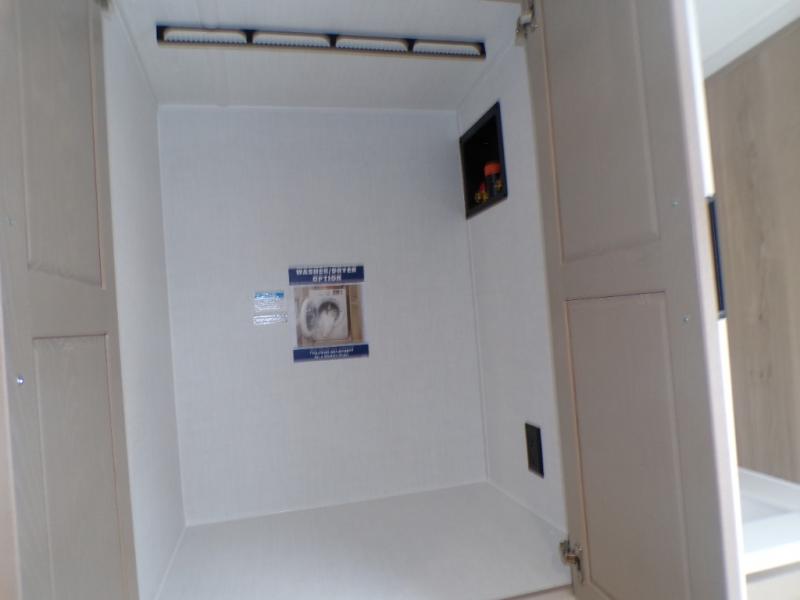 This front kitchen travel trailer is sure to make all your camping wishes come true. It's perfect for a couple since there is a master bedroom with a 60" x 80" queen bed, plus a theater seat in the main living area. If you're needing additional sleeping spaces, just choose the optional hide-a-bed sofa in place of the theater seat. The generous counter space in the kitchen will give you plenty of space to prep meals, and there is a bartop with stools where you can dine together. Along with the queen bed slide, the bedroom also includes a dresser, a TV option, plus a wardrobe with washer and dryer prep if you choose to add these appliances. And don't overlook the full rear bath to freshen up each day!