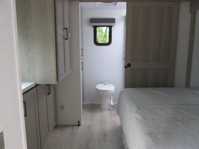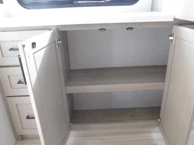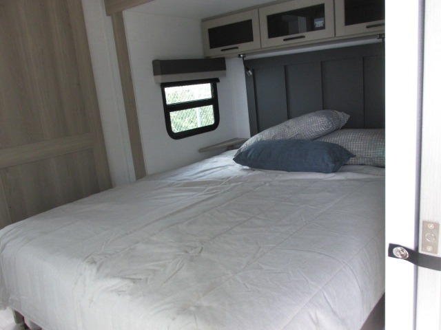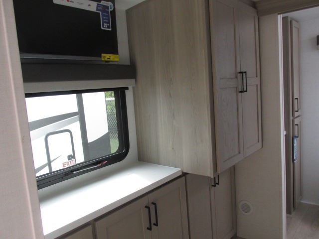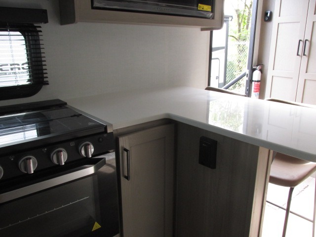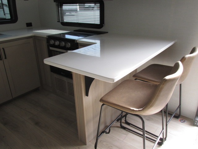 This front kitchen travel trailer is sure to make all your camping wishes come true. It's perfect for a couple since there is a master bedroom with a 60" x 80" queen bed, plus a theater seat in the main living area. If you're needing additional sleeping spaces, just choose the optional hide-a-bed sofa in place of the theater seat. The generous counter space in the kitchen will give you plenty of space to prep meals, and there is a bartop with stools where you can dine together. Along with the queen bed slide, the bedroom also includes a dresser, a TV option, plus a wardrobe with washer and dryer prep if you choose to add these appliances. And don't overlook the full rear bath to freshen up each day!