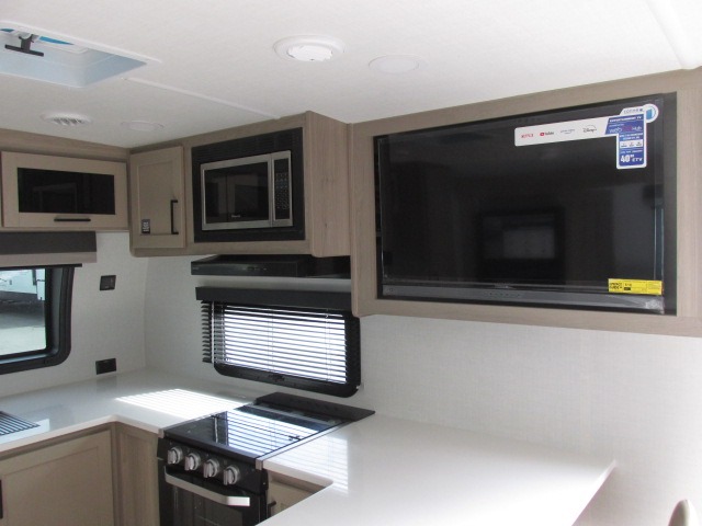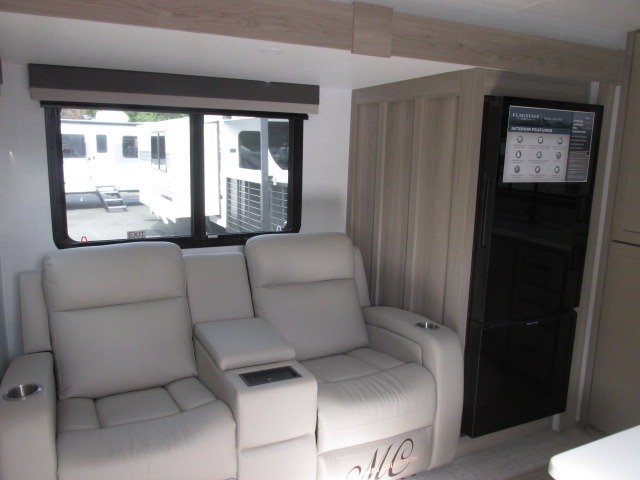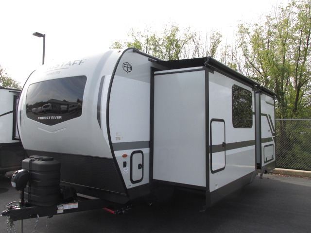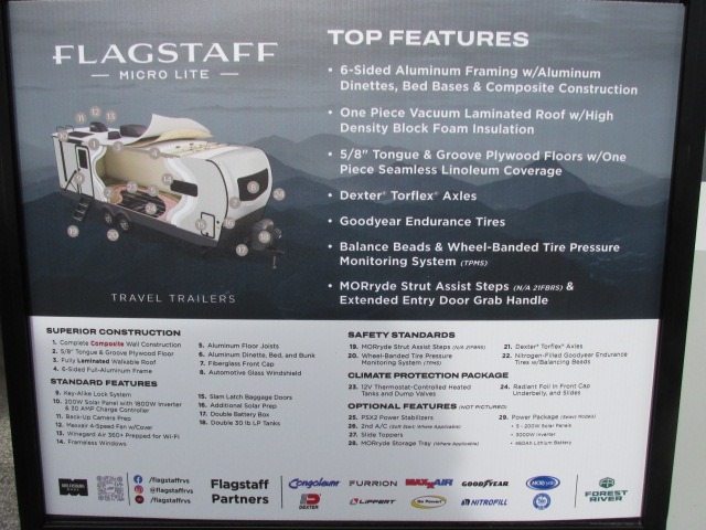 With any Flagstaff Micro Lite travel trailer by Forest River you will enjoy lightweight towing, durable construction, and added interior comforts to make each trip memorable! Each model features RoadTech tire pressure monitoring, Dexter Torflex axles, and nitrogen-filled Goodyear endurance tires for smooth towing from home to campground. The 6-sided aluminum framed construction provides a strong foundation so you can enjoy your RV for years to come, plus the radiant foil in the front cap, underbelly and slides help insulate your trailer. Additional exterior features include a 200W solar panel, back-up camera prep, frameless windows, and slam baggage doors. Each model includes the Great Expectations Package with roller shades, solid surface kitchen countertops, and hidden hinge cabinet doors. There is also an exterior hot/cold water port, outside speakers, a power tongue jack and stabilizer jacks, plus many more conveniences.