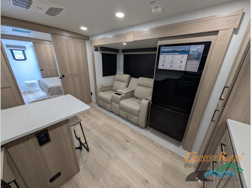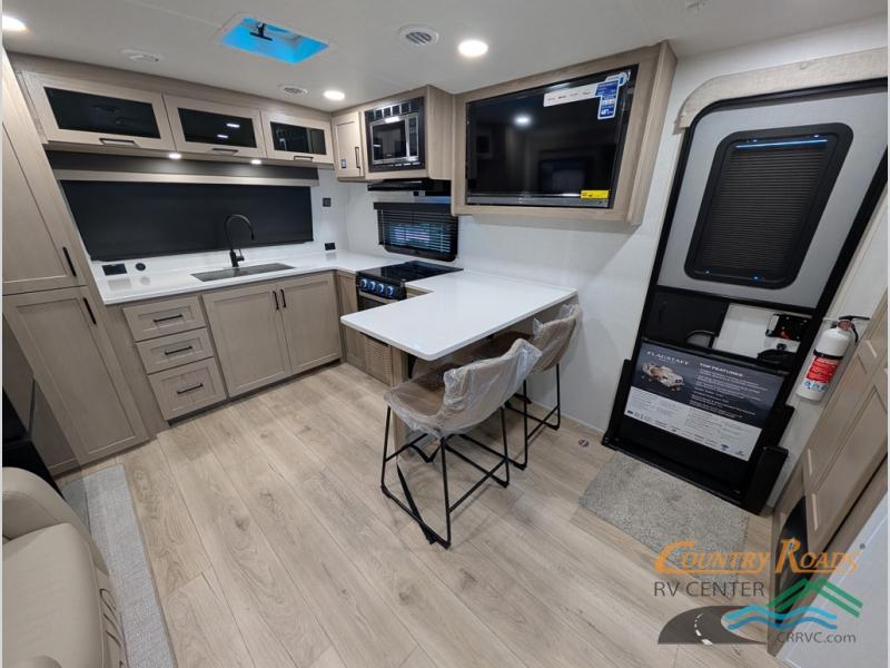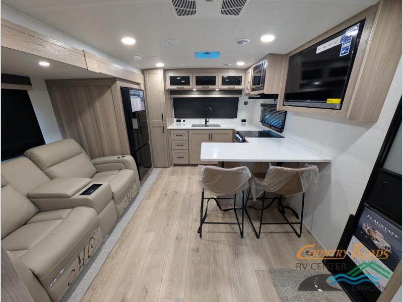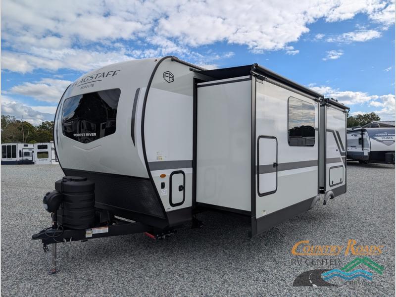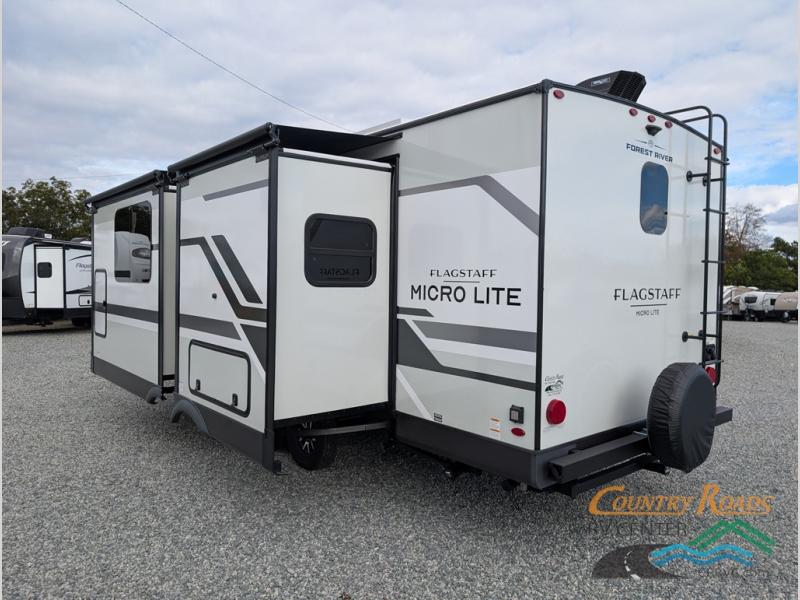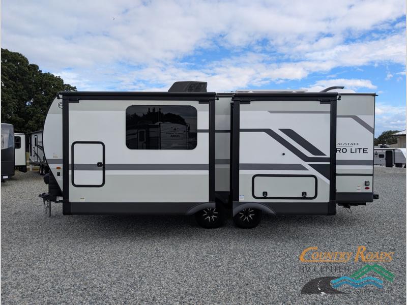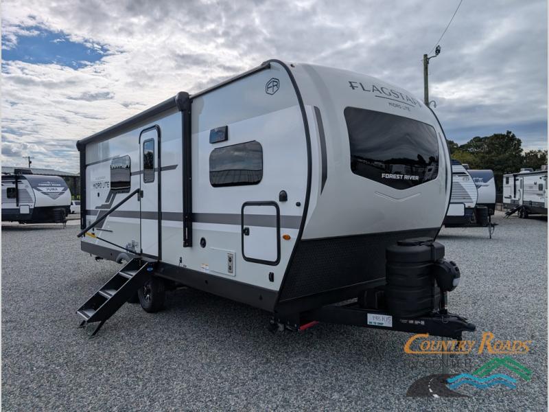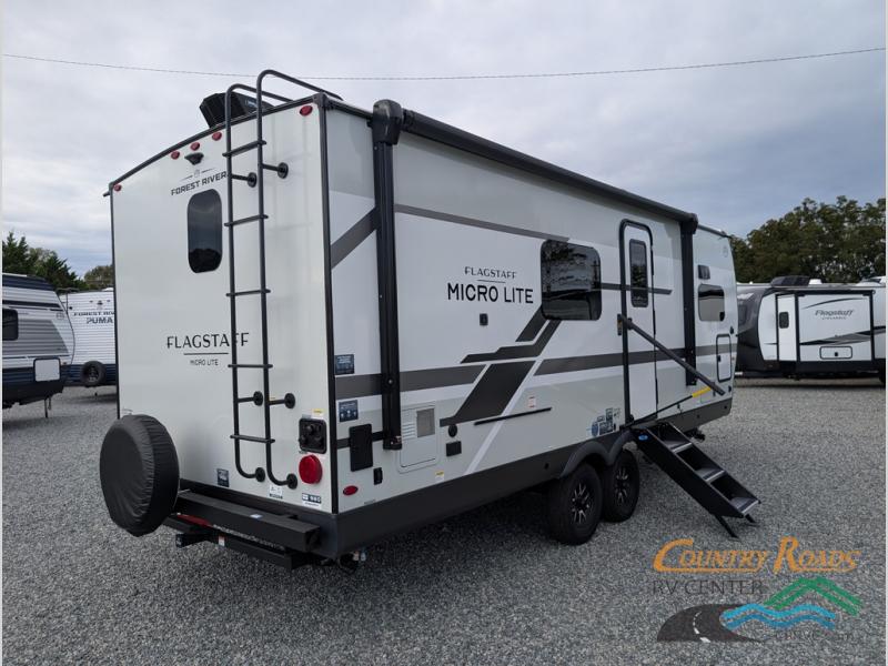 With any Flagstaff Micro Lite travel trailer by Forest River you will enjoy lightweight towing, durable construction, and added interior comforts to make each trip memorable! Each model features RoadTech tire pressure monitoring, Dexter Torflex axles, and nitrogen-filled Goodyear endurance tires for smooth towing from home to campground. The 6-sided aluminum framed construction provides a strong foundation so you can enjoy your RV for years to come, plus the radiant foil in the front cap, underbelly and slides help insulate your trailer. Additional exterior features include a 200W solar panel, back-up camera prep, frameless windows, and slam baggage doors. Each model includes the Great Expectations Package with roller shades, solid surface kitchen countertops, and hidden hinge cabinet doors. There is also an exterior hot/cold water port, outside speakers, a power tongue jack and stabilizer jacks, plus many more conveniences.
