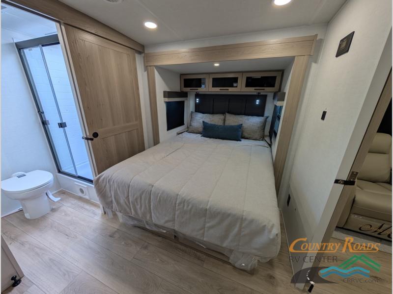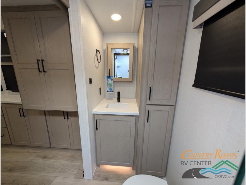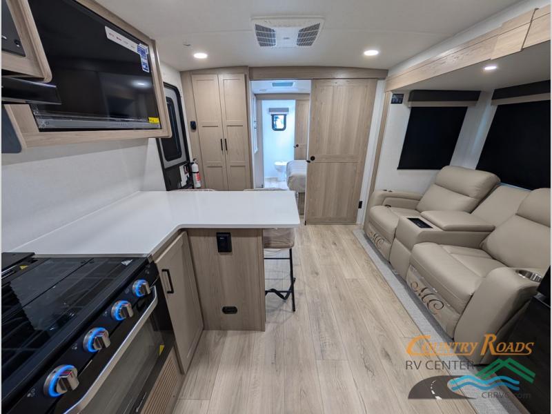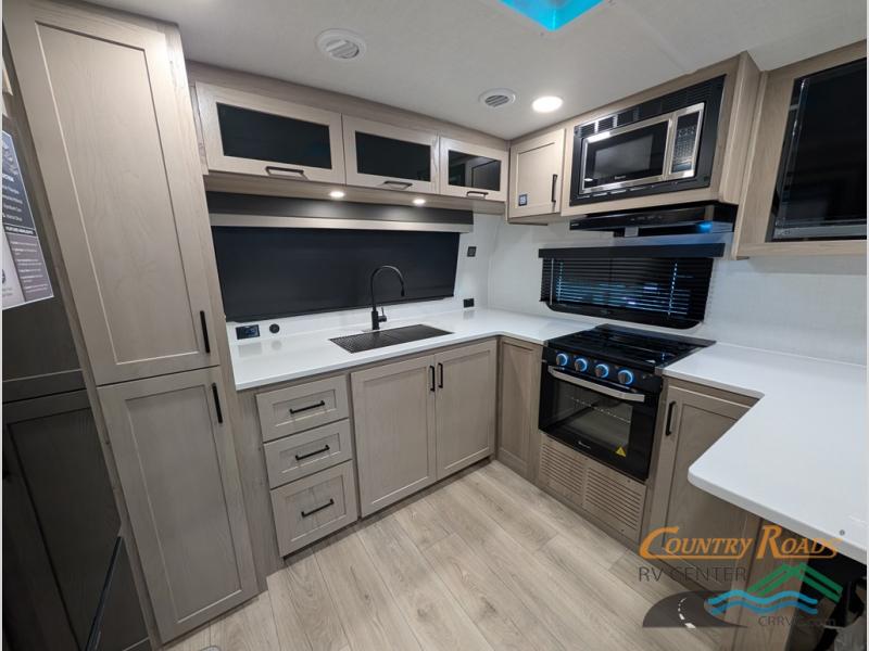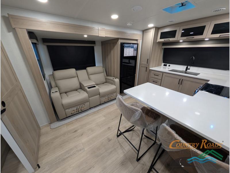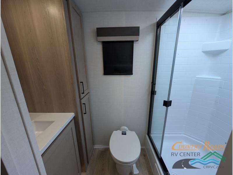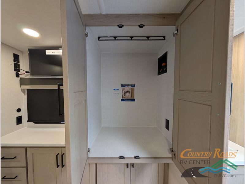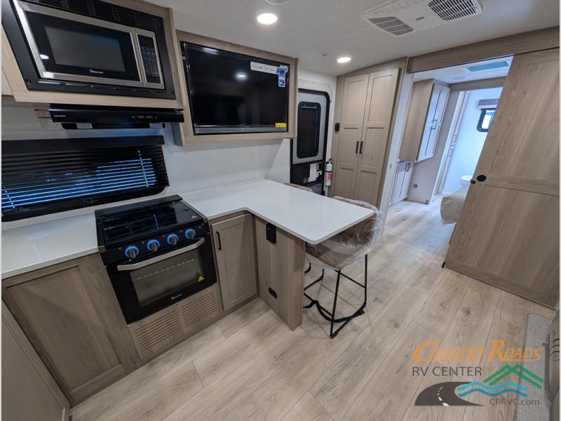 This front kitchen travel trailer is sure to make all your camping wishes come true. It's perfect for a couple since there is a master bedroom with a 60" x 80" queen bed, plus a theater seat in the main living area. If you're needing additional sleeping spaces, just choose the optional hide-a-bed sofa in place of the theater seat. The generous counter space in the kitchen will give you plenty of space to prep meals, and there is a bartop with stools where you can dine together. Along with the queen bed slide, the bedroom also includes a dresser, a TV option, plus a wardrobe with washer and dryer prep if you choose to add these appliances. And don't overlook the full rear bath to freshen up each day!
