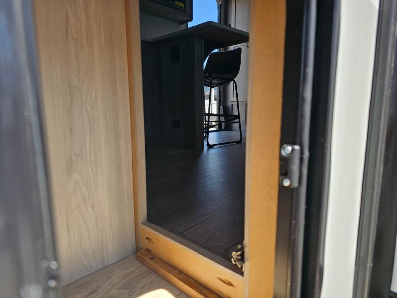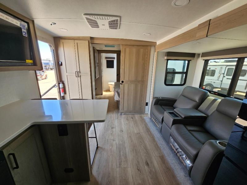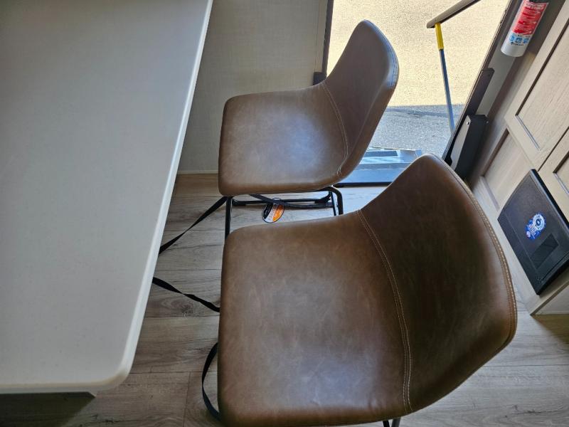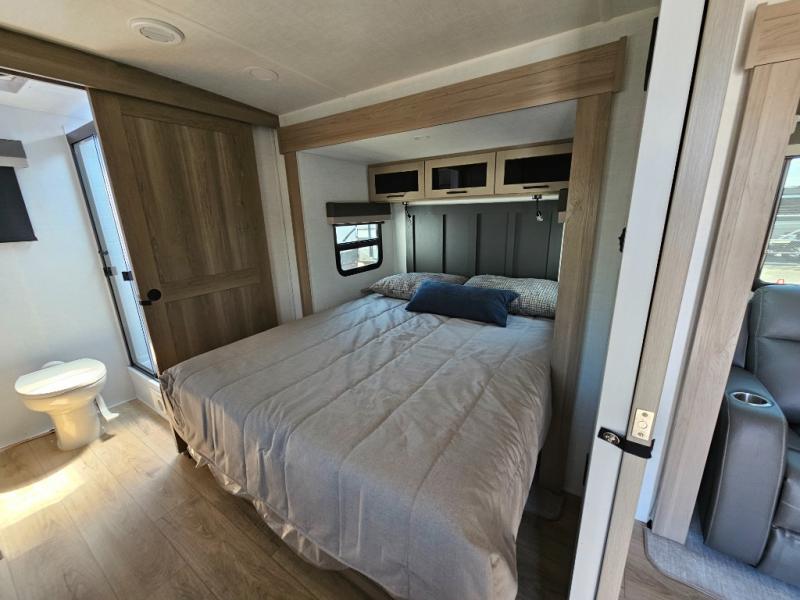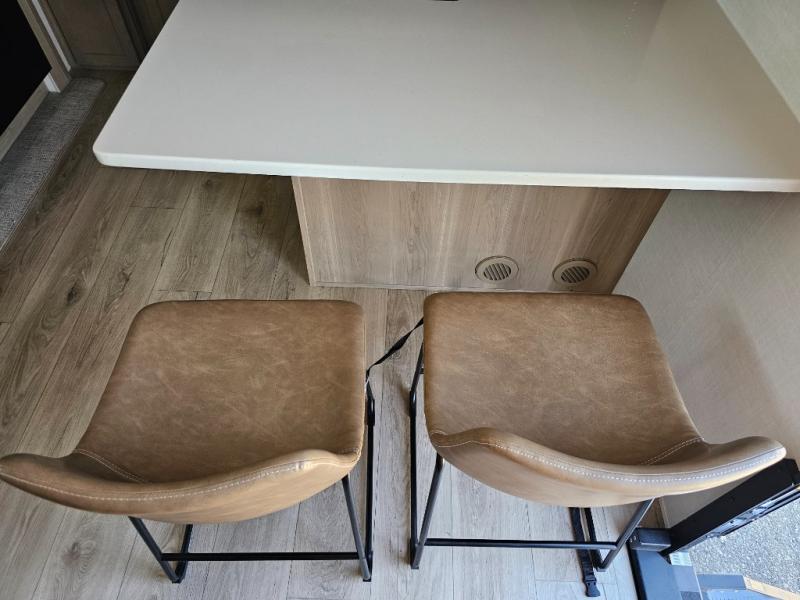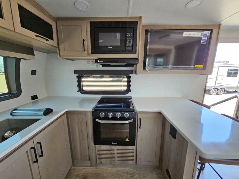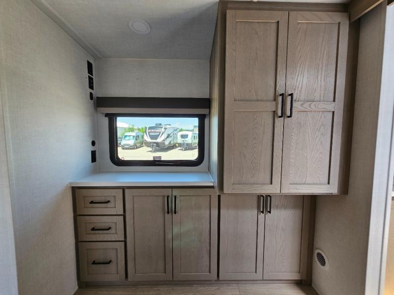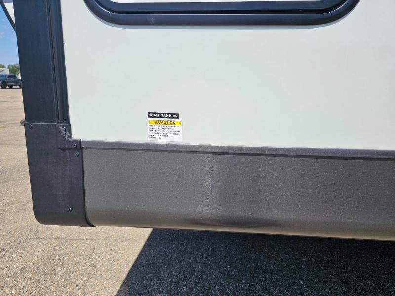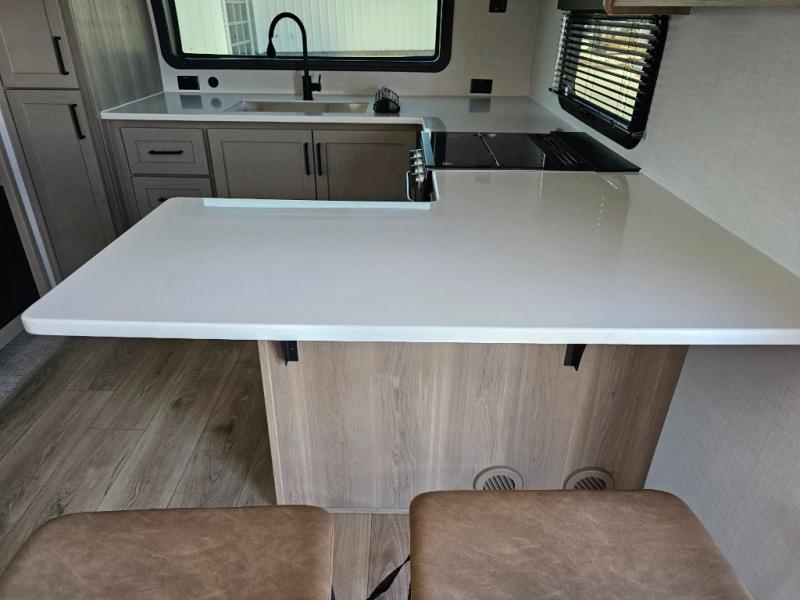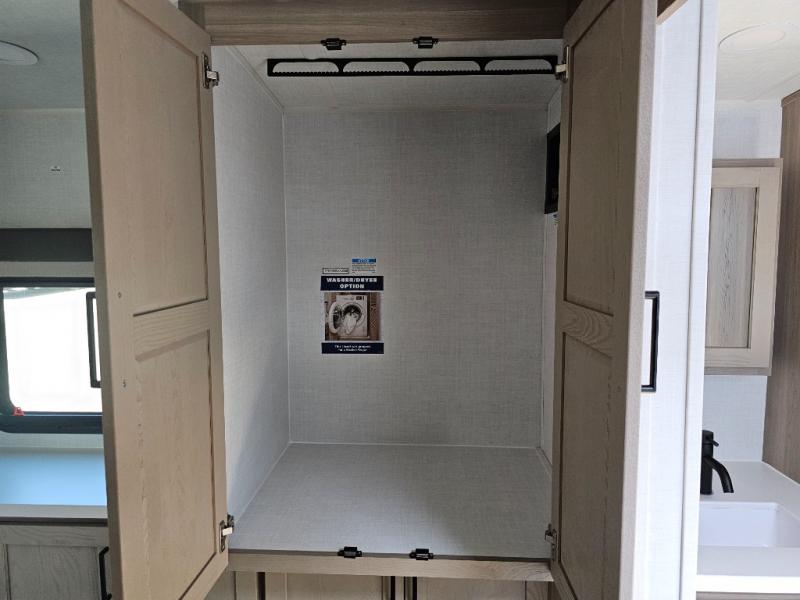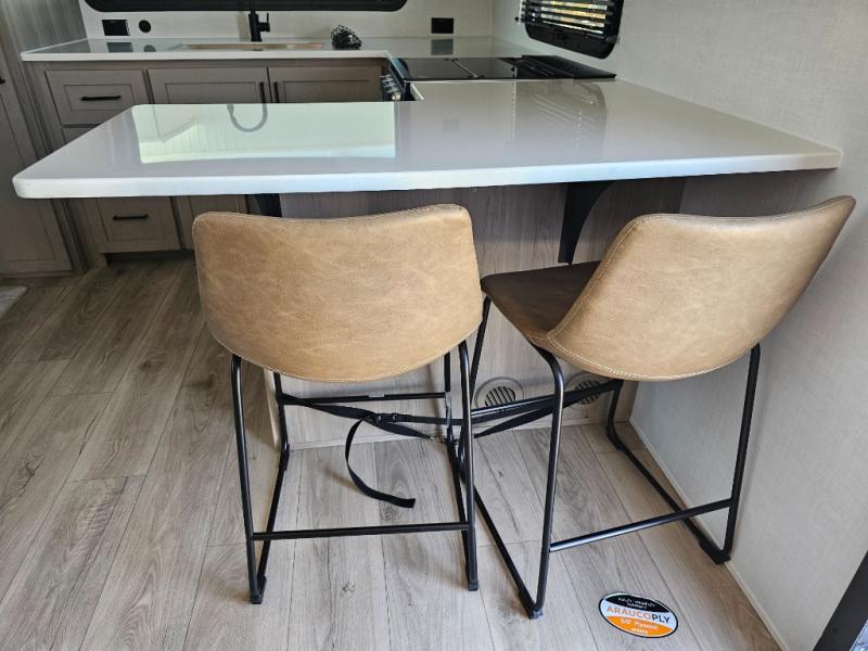 This front kitchen travel trailer is sure to make all your camping wishes come true. It's perfect for a couple since there is a master bedroom with a 60" x 80" queen bed, plus a theater seat in the main living area. If you're needing additional sleeping spaces, just choose the optional hide-a-bed sofa in place of the theater seat. The generous counter space in the kitchen will give you plenty of space to prep meals, and there is a bartop with stools where you can dine together. Along with the queen bed slide, the bedroom also includes a dresser, a TV option, plus a wardrobe with washer and dryer prep if you choose to add these appliances. And don't overlook the full rear bath to freshen up each day!