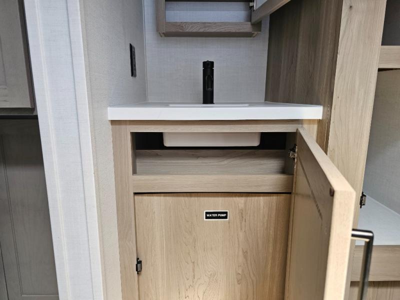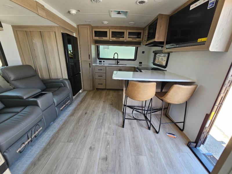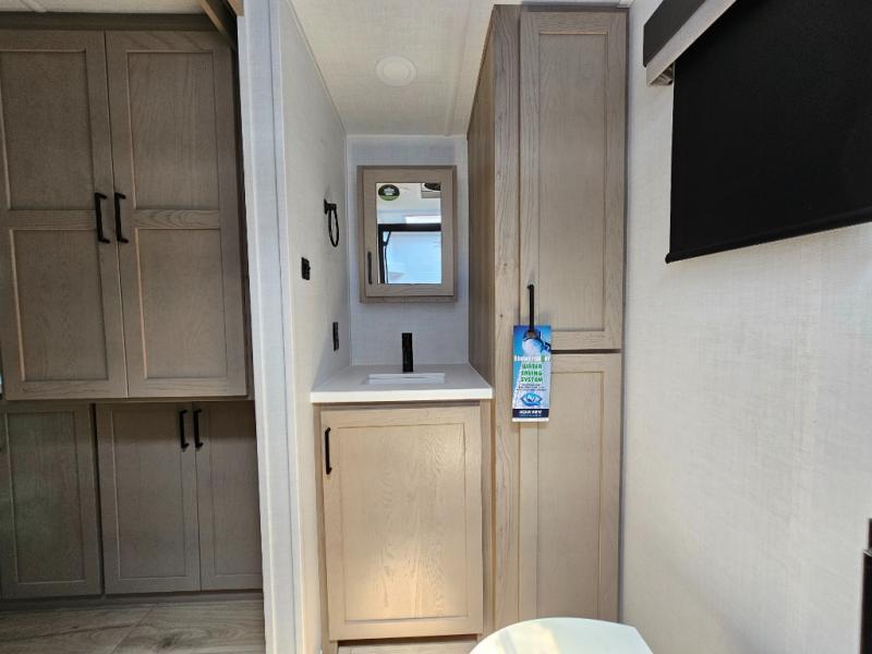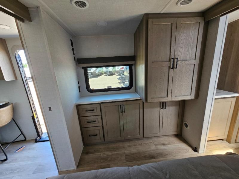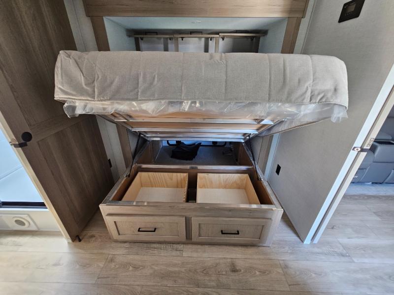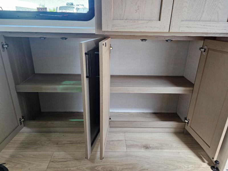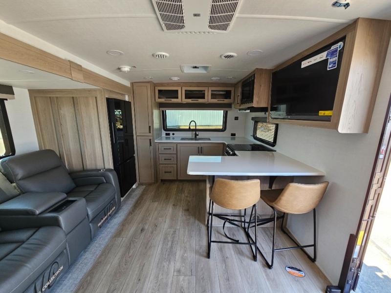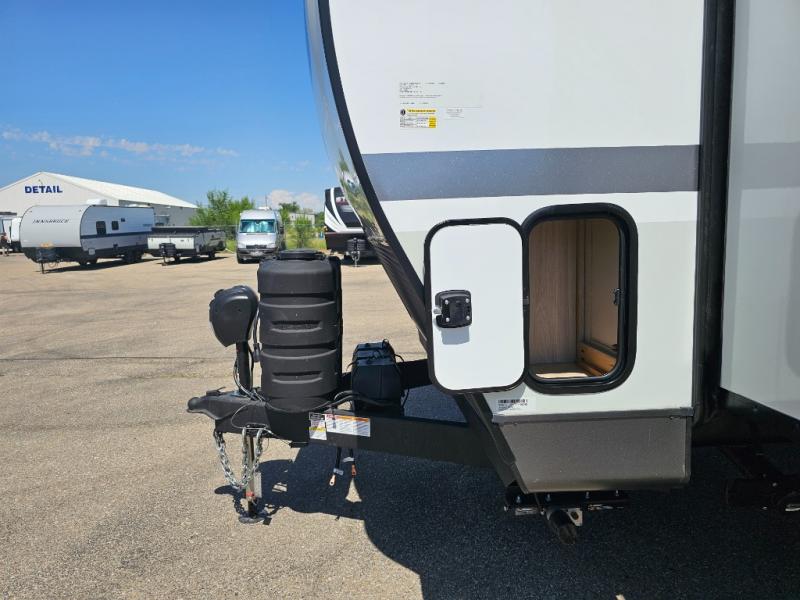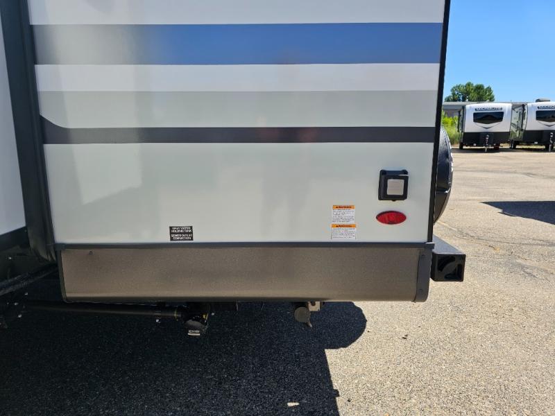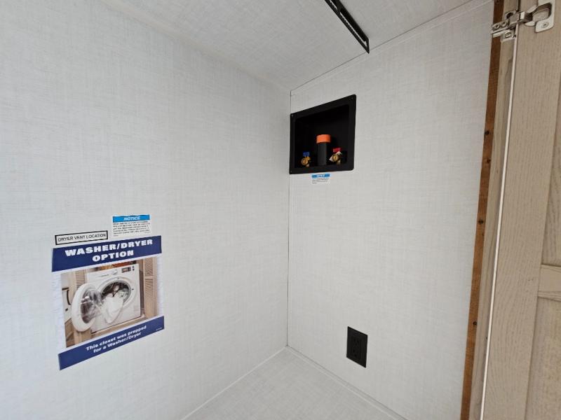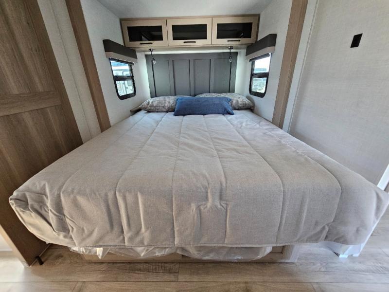 This front kitchen travel trailer is sure to make all your camping wishes come true. It's perfect for a couple since there is a master bedroom with a 60" x 80" queen bed, plus a theater seat in the main living area. If you're needing additional sleeping spaces, just choose the optional hide-a-bed sofa in place of the theater seat. The generous counter space in the kitchen will give you plenty of space to prep meals, and there is a bartop with stools where you can dine together. Along with the queen bed slide, the bedroom also includes a dresser, a TV option, plus a wardrobe with washer and dryer prep if you choose to add these appliances. And don't overlook the full rear bath to freshen up each day!