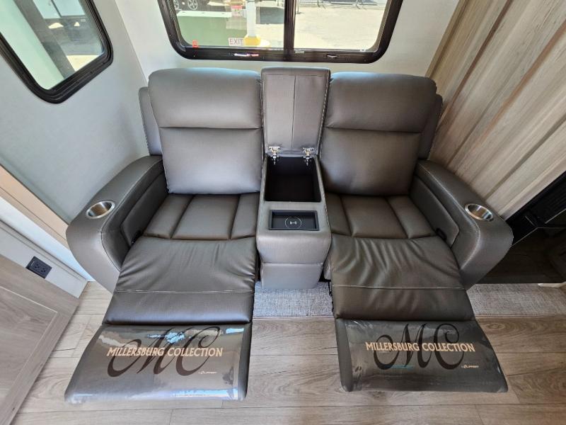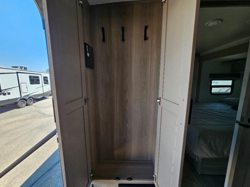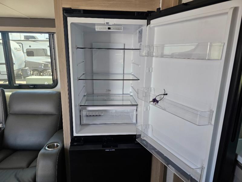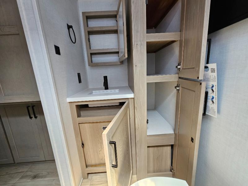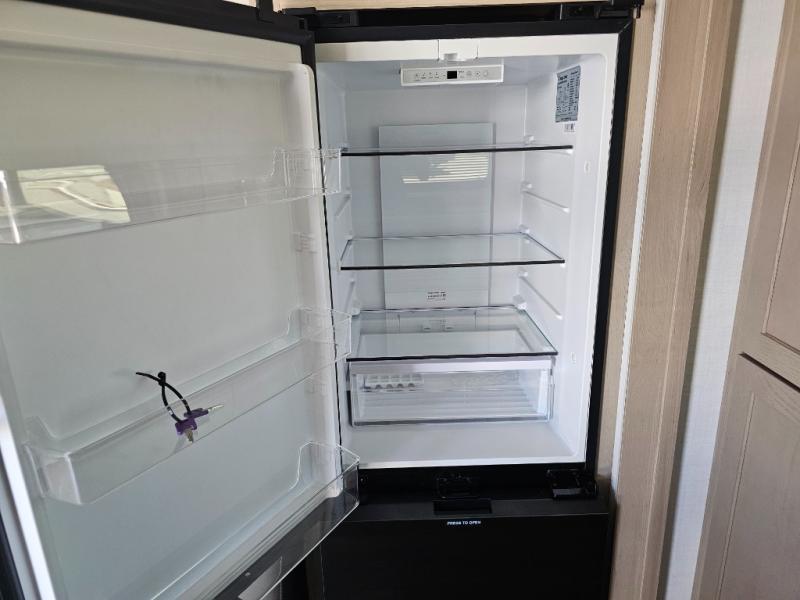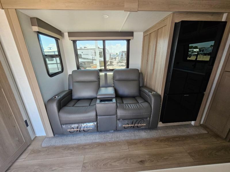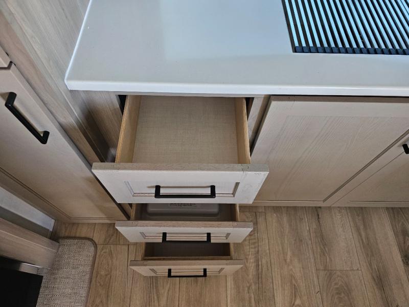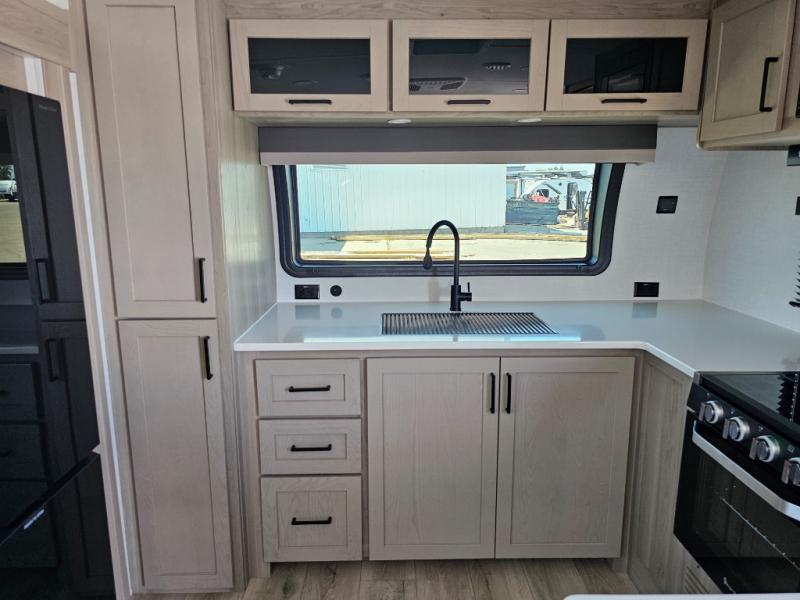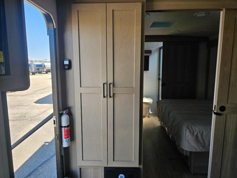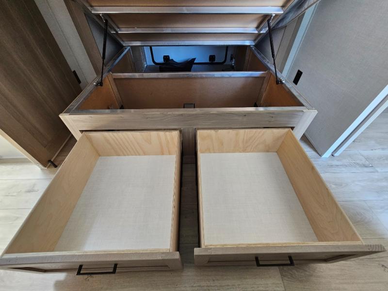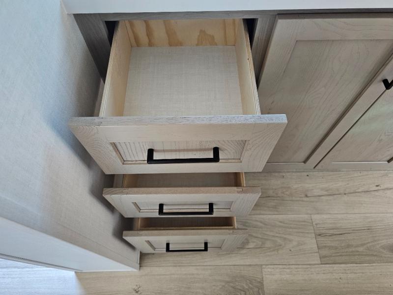 This front kitchen travel trailer is sure to make all your camping wishes come true. It's perfect for a couple since there is a master bedroom with a 60" x 80" queen bed, plus a theater seat in the main living area. If you're needing additional sleeping spaces, just choose the optional hide-a-bed sofa in place of the theater seat. The generous counter space in the kitchen will give you plenty of space to prep meals, and there is a bartop with stools where you can dine together. Along with the queen bed slide, the bedroom also includes a dresser, a TV option, plus a wardrobe with washer and dryer prep if you choose to add these appliances. And don't overlook the full rear bath to freshen up each day!