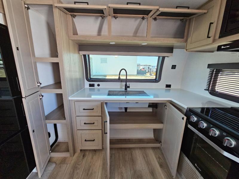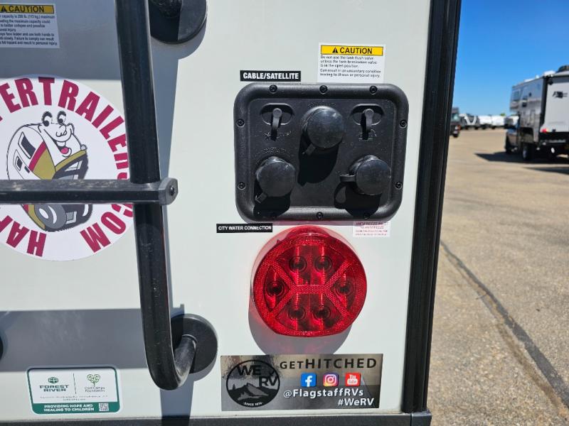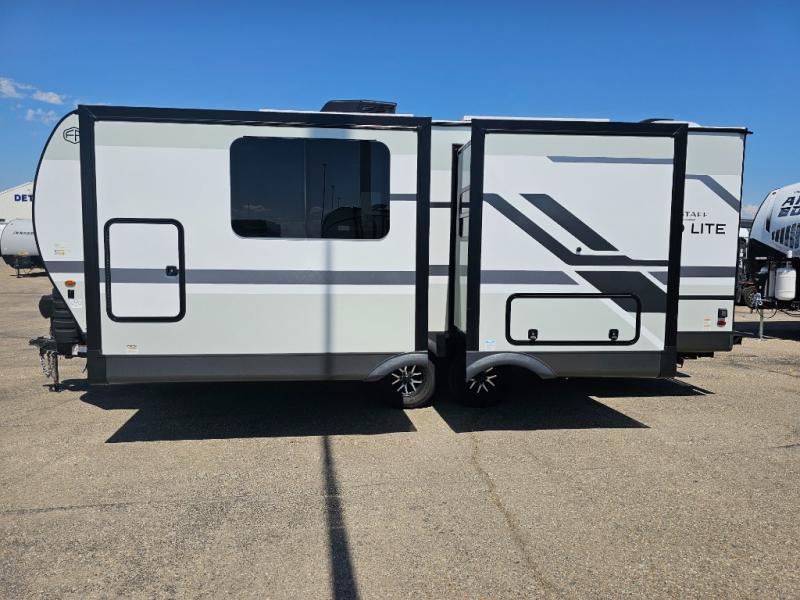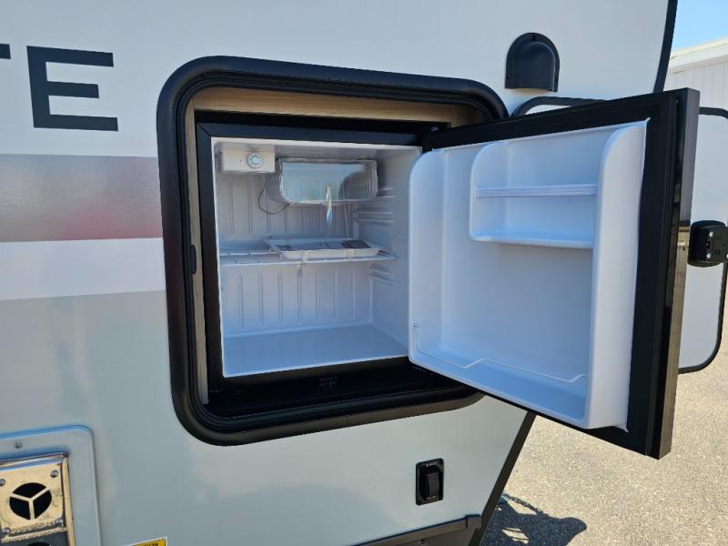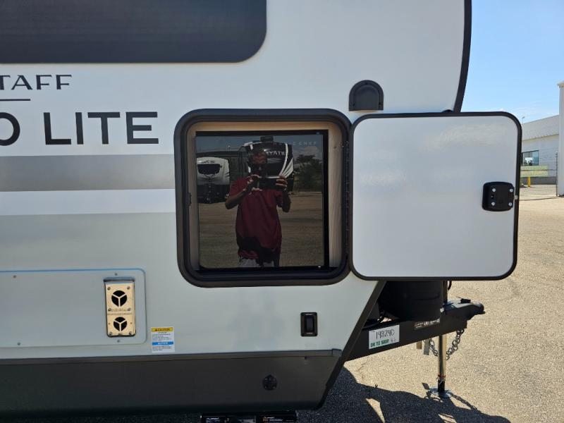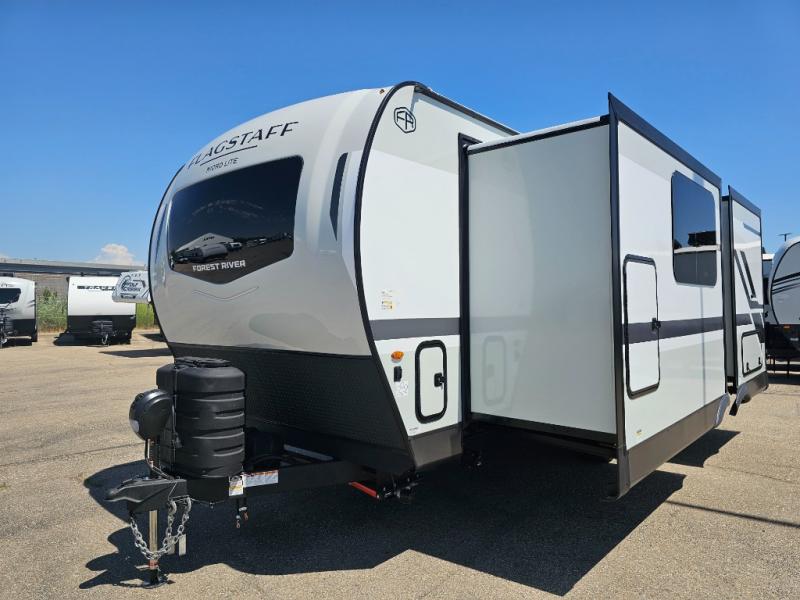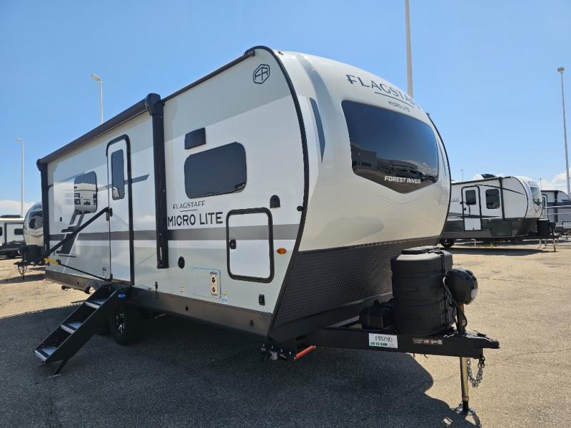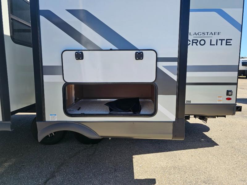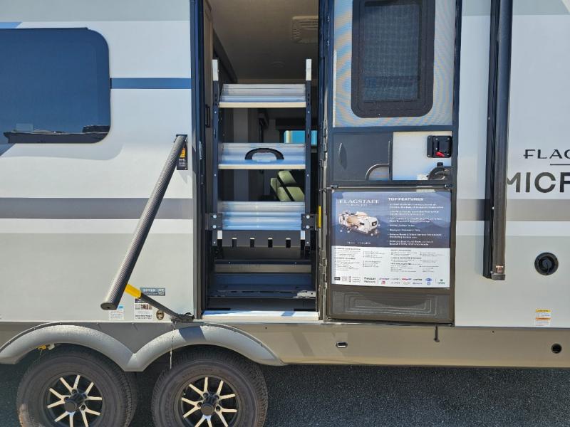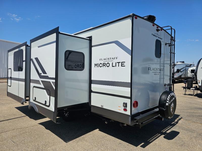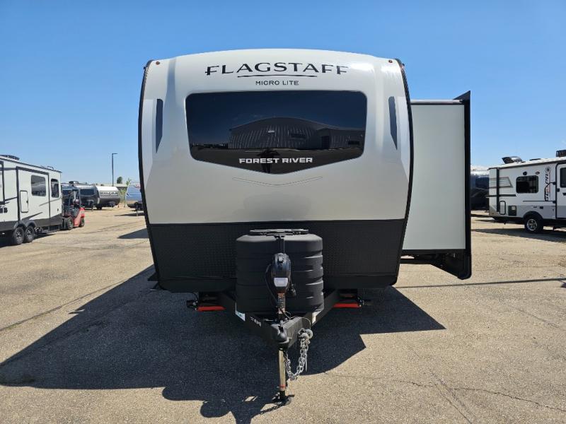 With any Flagstaff Micro Lite travel trailer by Forest River you will enjoy lightweight towing, durable construction, and added interior comforts to make each trip memorable! Each model features RoadTech tire pressure monitoring, Dexter Torflex axles, and nitrogen-filled Goodyear endurance tires for smooth towing from home to campground. The 6-sided aluminum framed construction provides a strong foundation so you can enjoy your RV for years to come, plus the radiant foil in the front cap, underbelly and slides help insulate your trailer. Additional exterior features include a 200W solar panel, back-up camera prep, frameless windows, and slam baggage doors. Each model includes the Great Expectations Package with roller shades, solid surface kitchen countertops, and hidden hinge cabinet doors. There is also an exterior hot/cold water port, outside speakers, a power tongue jack and stabilizer jacks, plus many more conveniences.