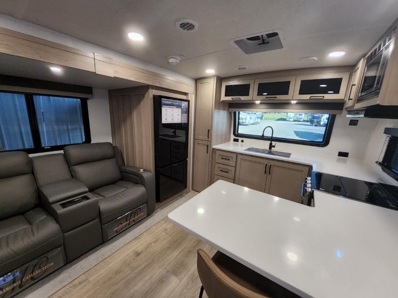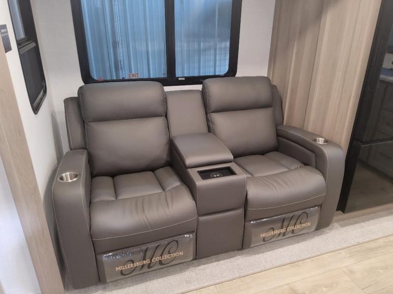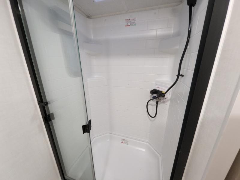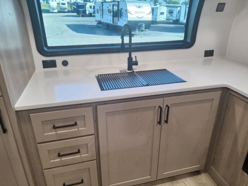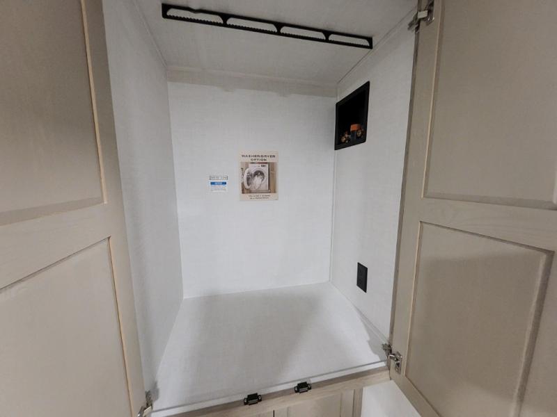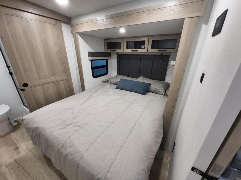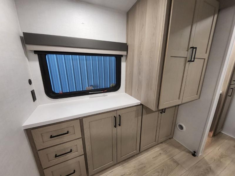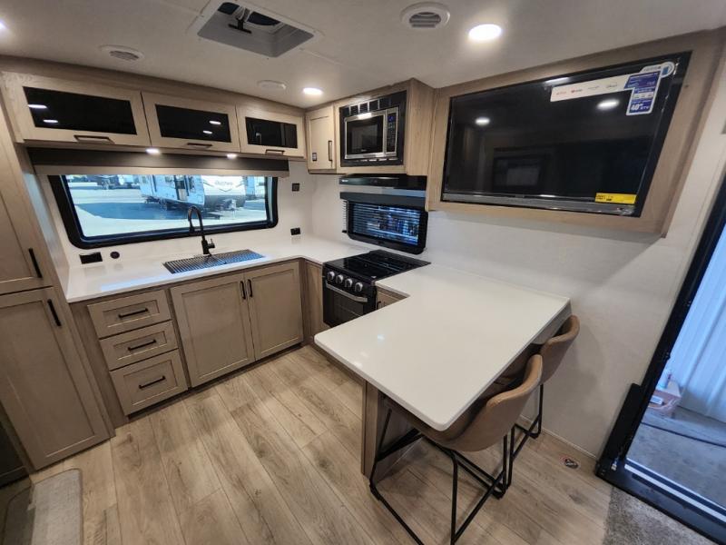 This front kitchen travel trailer is sure to make all your camping wishes come true. It's perfect for a couple since there is a master bedroom with a 60" x 80" queen bed, plus a theater seat in the main living area. If you're needing additional sleeping spaces, just choose the optional hide-a-bed sofa in place of the theater seat. The generous counter space in the kitchen will give you plenty of space to prep meals, and there is a bartop with stools where you can dine together. Along with the queen bed slide, the bedroom also includes a dresser, a TV option, plus a wardrobe with washer and dryer prep if you choose to add these appliances. And don't overlook the full rear bath to freshen up each day!