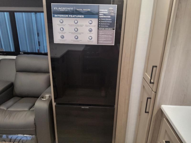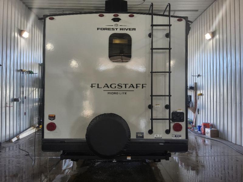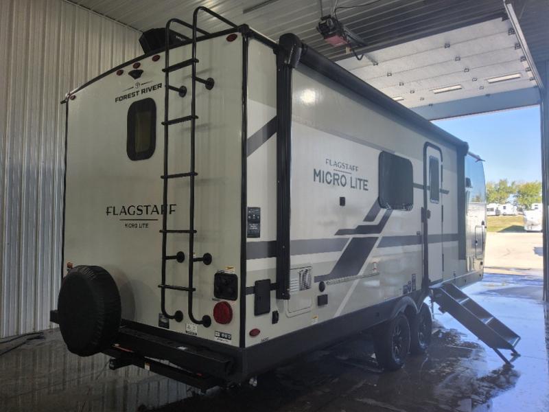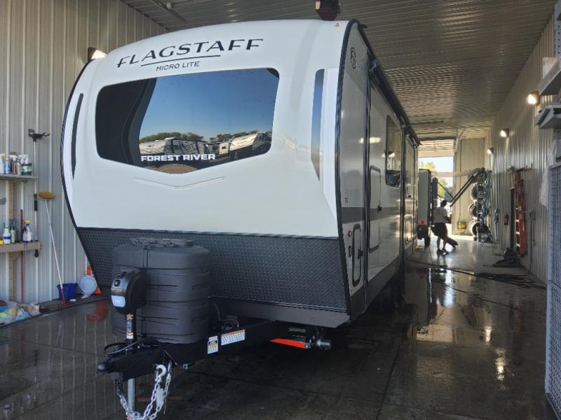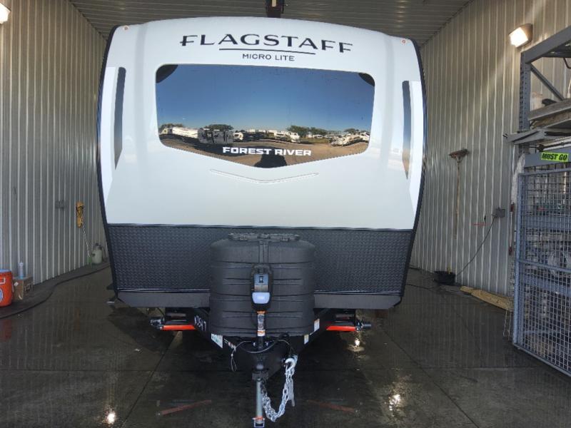 With any Flagstaff Micro Lite travel trailer by Forest River you will enjoy lightweight towing, durable construction, and added interior comforts to make each trip memorable! Each model features RoadTech tire pressure monitoring, Dexter Torflex axles, and nitrogen-filled Goodyear endurance tires for smooth towing from home to campground. The 6-sided aluminum framed construction provides a strong foundation so you can enjoy your RV for years to come, plus the radiant foil in the front cap, underbelly and slides help insulate your trailer. Additional exterior features include a 200W solar panel, back-up camera prep, frameless windows, and slam baggage doors. Each model includes the Great Expectations Package with roller shades, solid surface kitchen countertops, and hidden hinge cabinet doors. There is also an exterior hot/cold water port, outside speakers, a power tongue jack and stabilizer jacks, plus many more conveniences.