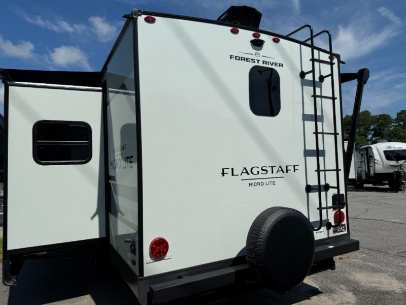 With any Flagstaff Micro Lite travel trailer by Forest River you will enjoy lightweight towing, durable construction, and added interior comforts to make each trip memorable! Each model features RoadTech tire pressure monitoring, Dexter Torflex axles, and nitrogen-filled Goodyear endurance tires for smooth towing from home to campground. The 6-sided aluminum framed construction provides a strong foundation so you can enjoy your RV for years to come, plus the radiant foil in the front cap, underbelly and slides help insulate your trailer. Additional exterior features include a 200W solar panel, back-up camera prep, frameless windows, and slam baggage doors. Each model includes the Great Expectations Package with roller shades, solid surface kitchen countertops, and hidden hinge cabinet doors. There is also an exterior hot/cold water port, outside speakers, a power tongue jack and stabilizer jacks, plus many more conveniences.