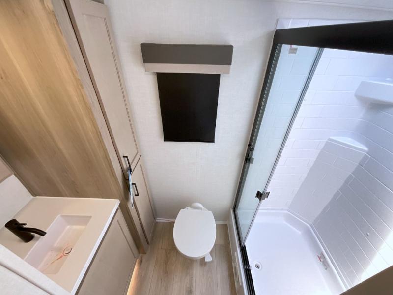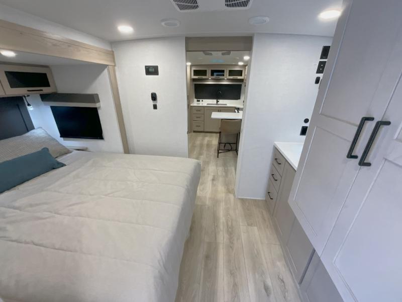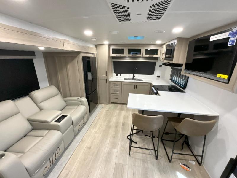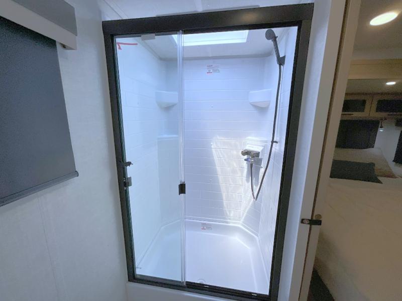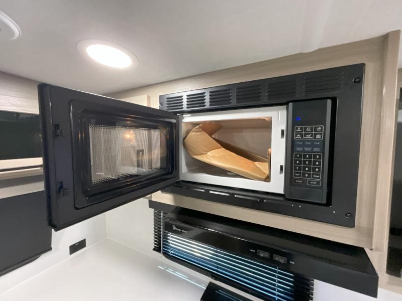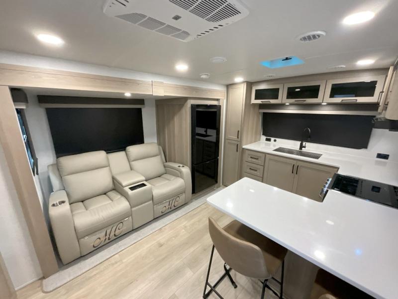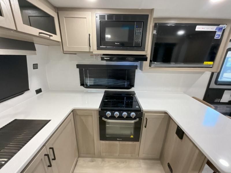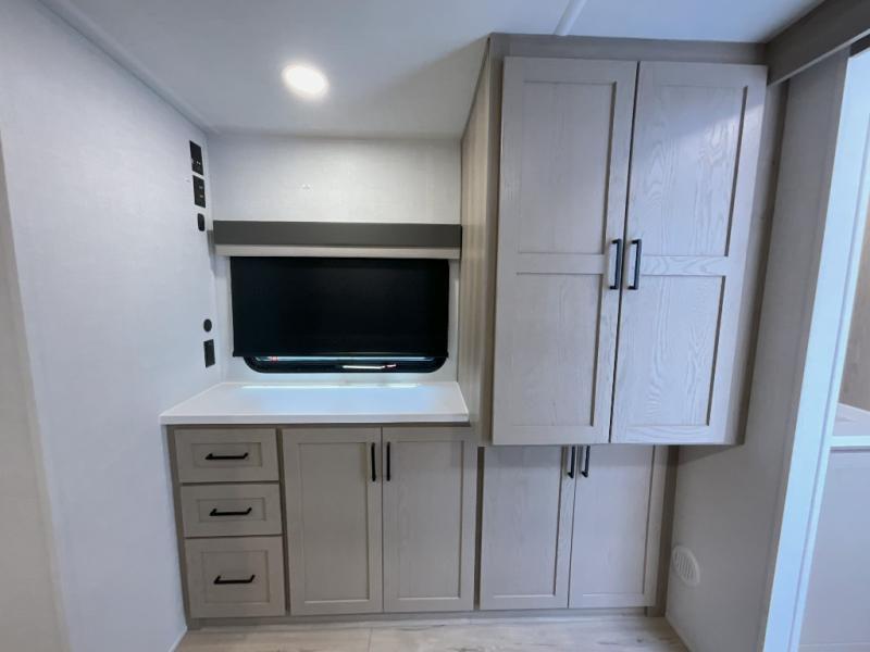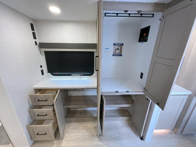 This front kitchen travel trailer is sure to make all your camping wishes come true. It's perfect for a couple since there is a master bedroom with a 60" x 80" queen bed, plus a theater seat in the main living area. If you're needing additional sleeping spaces, just choose the optional hide-a-bed sofa in place of the theater seat. The generous counter space in the kitchen will give you plenty of space to prep meals, and there is a bartop with stools where you can dine together. Along with the queen bed slide, the bedroom also includes a dresser, a TV option, plus a wardrobe with washer and dryer prep if you choose to add these appliances. And don't overlook the full rear bath to freshen up each day!