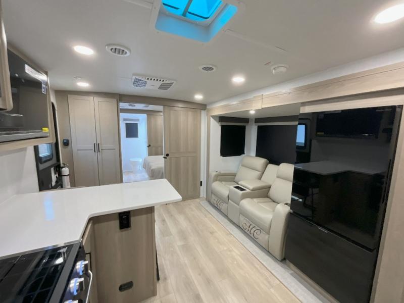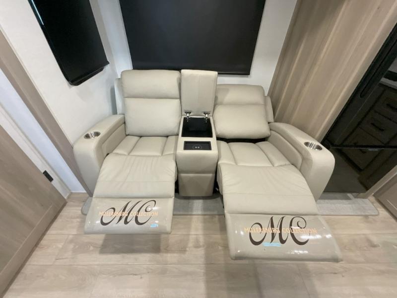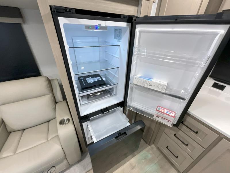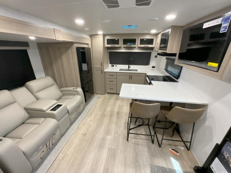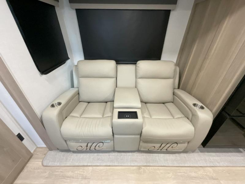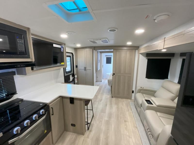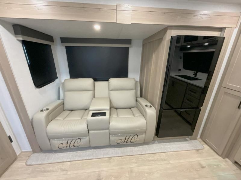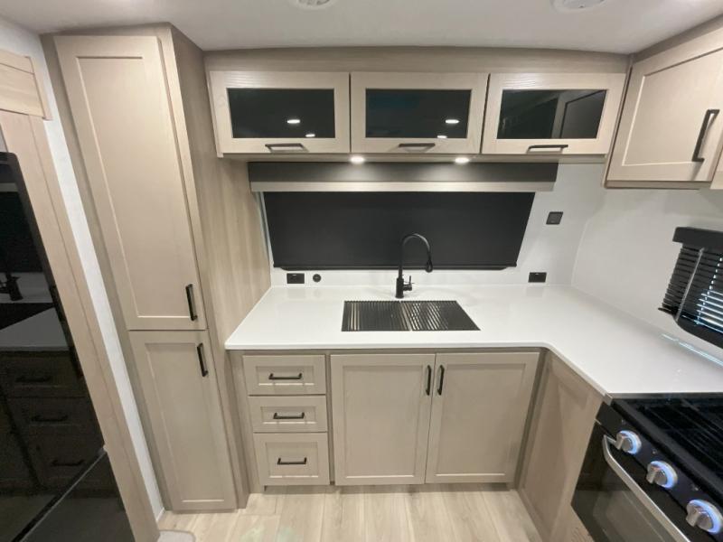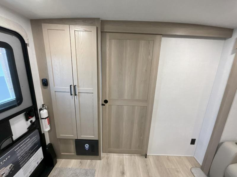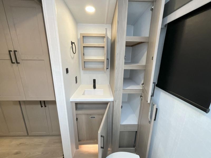 This front kitchen travel trailer is sure to make all your camping wishes come true. It's perfect for a couple since there is a master bedroom with a 60" x 80" queen bed, plus a theater seat in the main living area. If you're needing additional sleeping spaces, just choose the optional hide-a-bed sofa in place of the theater seat. The generous counter space in the kitchen will give you plenty of space to prep meals, and there is a bartop with stools where you can dine together. Along with the queen bed slide, the bedroom also includes a dresser, a TV option, plus a wardrobe with washer and dryer prep if you choose to add these appliances. And don't overlook the full rear bath to freshen up each day!