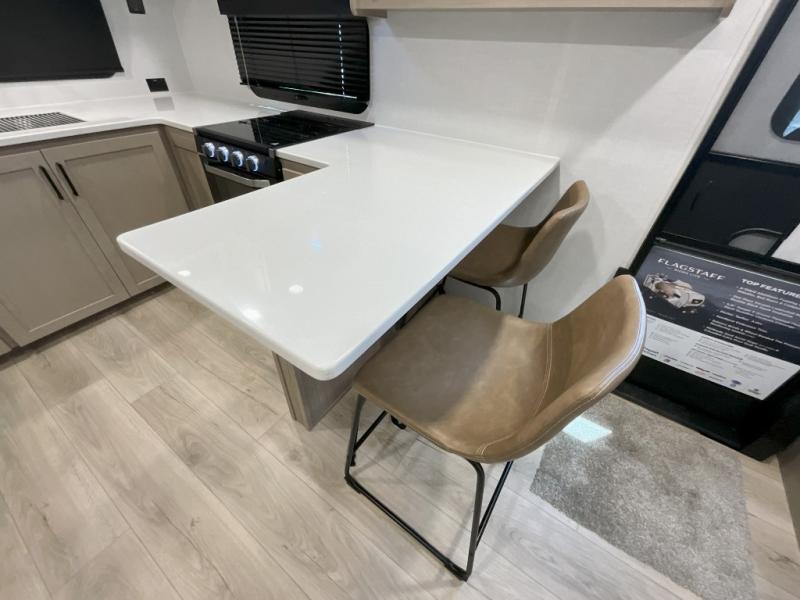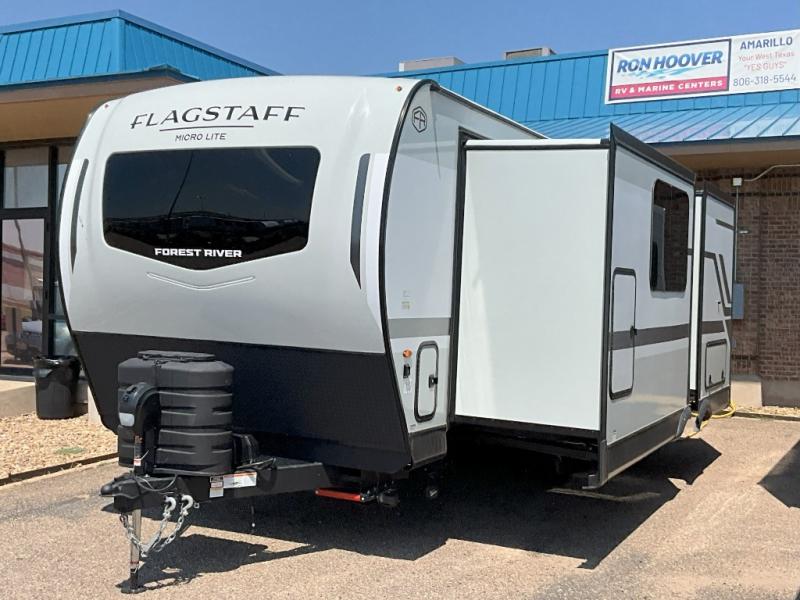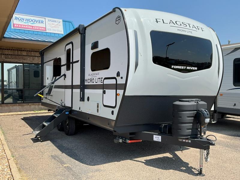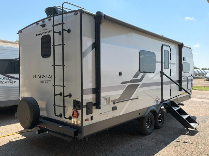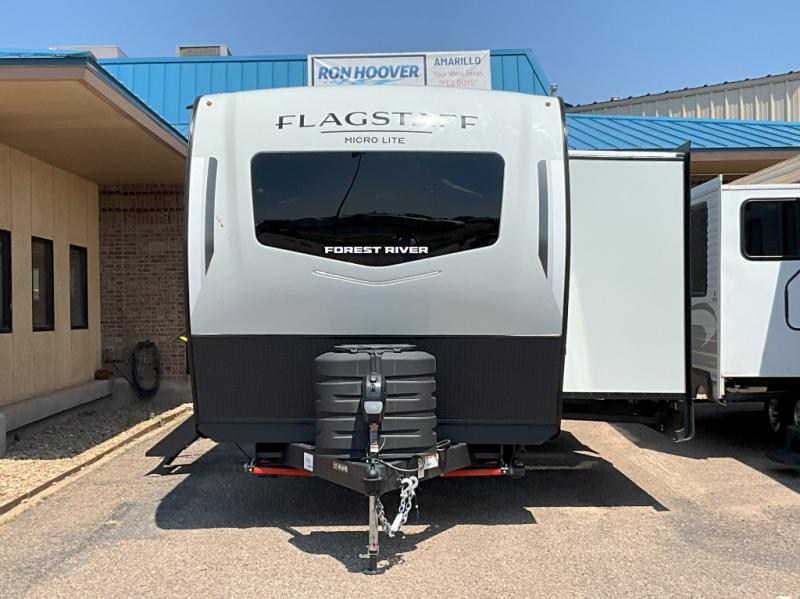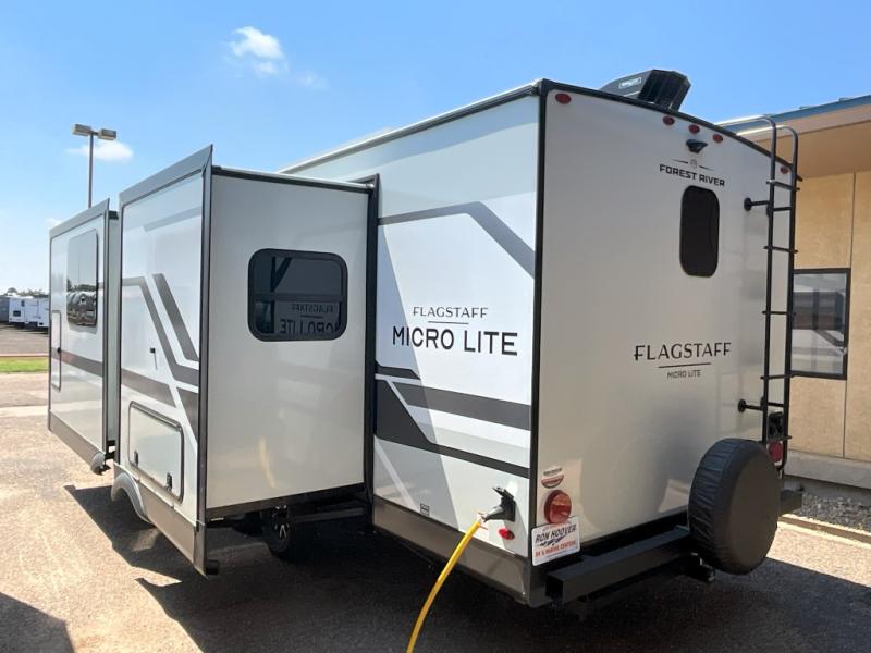 With any Flagstaff Micro Lite travel trailer by Forest River you will enjoy lightweight towing, durable construction, and added interior comforts to make each trip memorable! Each model features RoadTech tire pressure monitoring, Dexter Torflex axles, and nitrogen-filled Goodyear endurance tires for smooth towing from home to campground. The 6-sided aluminum framed construction provides a strong foundation so you can enjoy your RV for years to come, plus the radiant foil in the front cap, underbelly and slides help insulate your trailer. Additional exterior features include a 200W solar panel, back-up camera prep, frameless windows, and slam baggage doors. Each model includes the Great Expectations Package with roller shades, solid surface kitchen countertops, and hidden hinge cabinet doors. There is also an exterior hot/cold water port, outside speakers, a power tongue jack and stabilizer jacks, plus many more conveniences.
