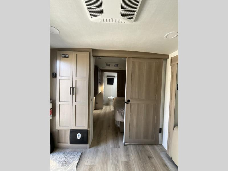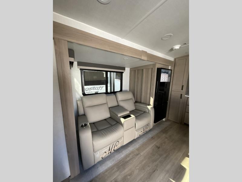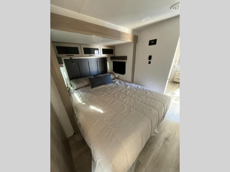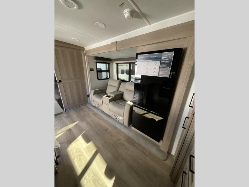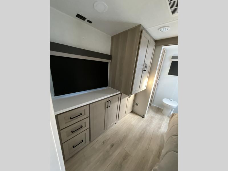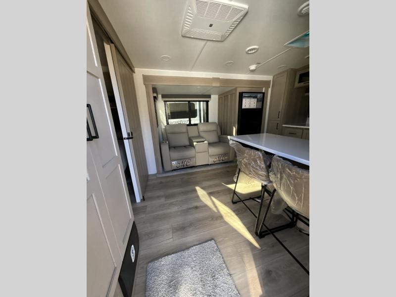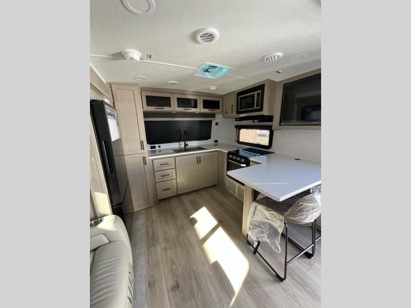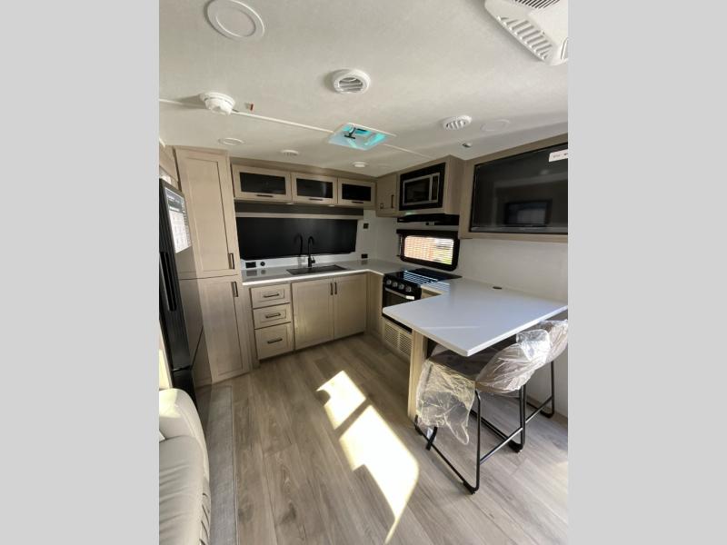 This front kitchen travel trailer is sure to make all your camping wishes come true. It's perfect for a couple since there is a master bedroom with a 60" x 80" queen bed, plus a theater seat in the main living area. If you're needing additional sleeping spaces, just choose the optional hide-a-bed sofa in place of the theater seat. The generous counter space in the kitchen will give you plenty of space to prep meals, and there is a bartop with stools where you can dine together. Along with the queen bed slide, the bedroom also includes a dresser, a TV option, plus a wardrobe with washer and dryer prep if you choose to add these appliances. And don't overlook the full rear bath to freshen up each day!
