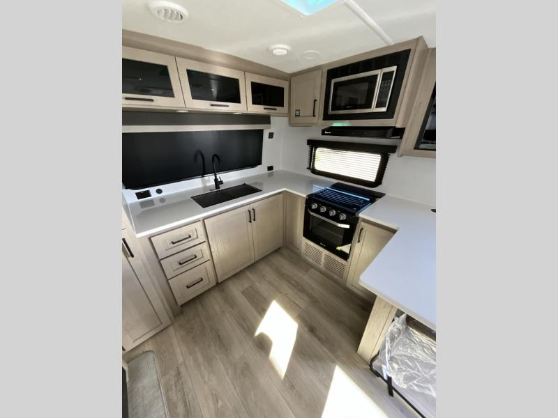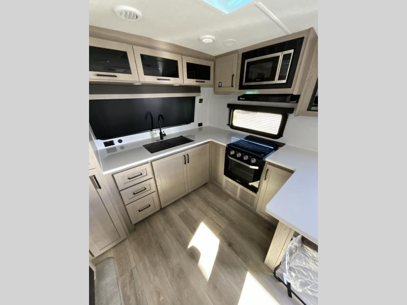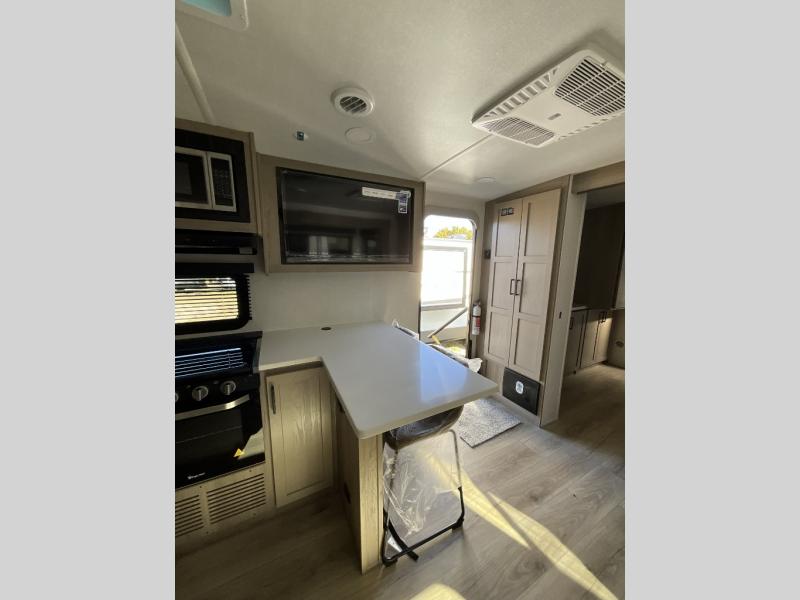 With any Flagstaff Micro Lite travel trailer by Forest River you will enjoy lightweight towing, durable construction, and added interior comforts to make each trip memorable! Each model features RoadTech tire pressure monitoring, Dexter Torflex axles, and nitrogen-filled Goodyear endurance tires for smooth towing from home to campground. The 6-sided aluminum framed construction provides a strong foundation so you can enjoy your RV for years to come, plus the radiant foil in the front cap, underbelly and slides help insulate your trailer. Additional exterior features include a 200W solar panel, back-up camera prep, frameless windows, and slam baggage doors. Each model includes the Great Expectations Package with roller shades, solid surface kitchen countertops, and hidden hinge cabinet doors. There is also an exterior hot/cold water port, outside speakers, a power tongue jack and stabilizer jacks, plus many more conveniences.