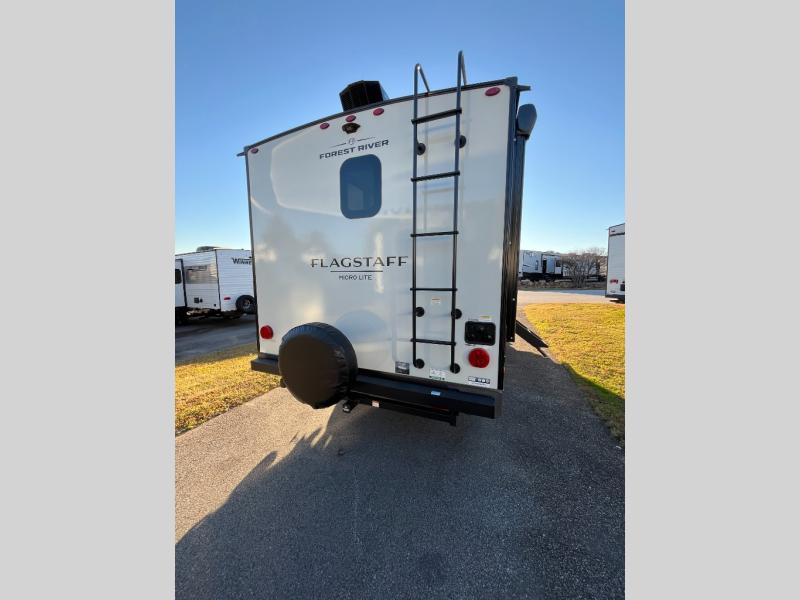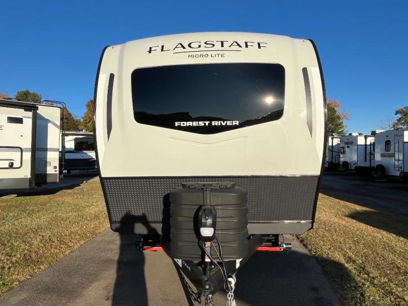 With any Flagstaff Micro Lite travel trailer by Forest River you will enjoy lightweight towing, durable construction, and added interior comforts to make each trip memorable! Each model features RoadTech tire pressure monitoring, Dexter Torflex axles, and nitrogen-filled Goodyear endurance tires for smooth towing from home to campground. The 6-sided aluminum framed construction provides a strong foundation so you can enjoy your RV for years to come, plus the radiant foil in the front cap, underbelly and slides help insulate your trailer. Additional exterior features include a 200W solar panel, back-up camera prep, frameless windows, and slam baggage doors. Each model includes the Great Expectations Package with roller shades, solid surface kitchen countertops, and hidden hinge cabinet doors. There is also an exterior hot/cold water port, outside speakers, a power tongue jack and stabilizer jacks, plus many more conveniences.