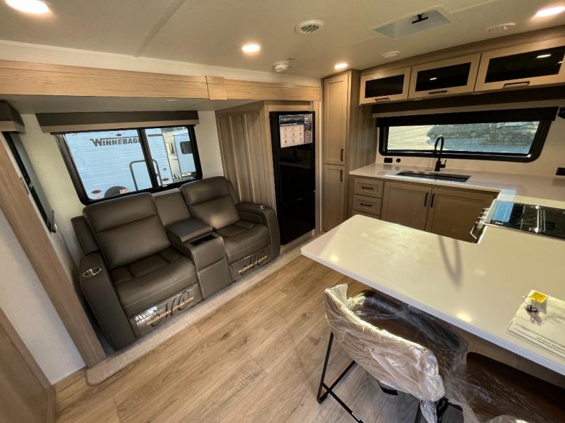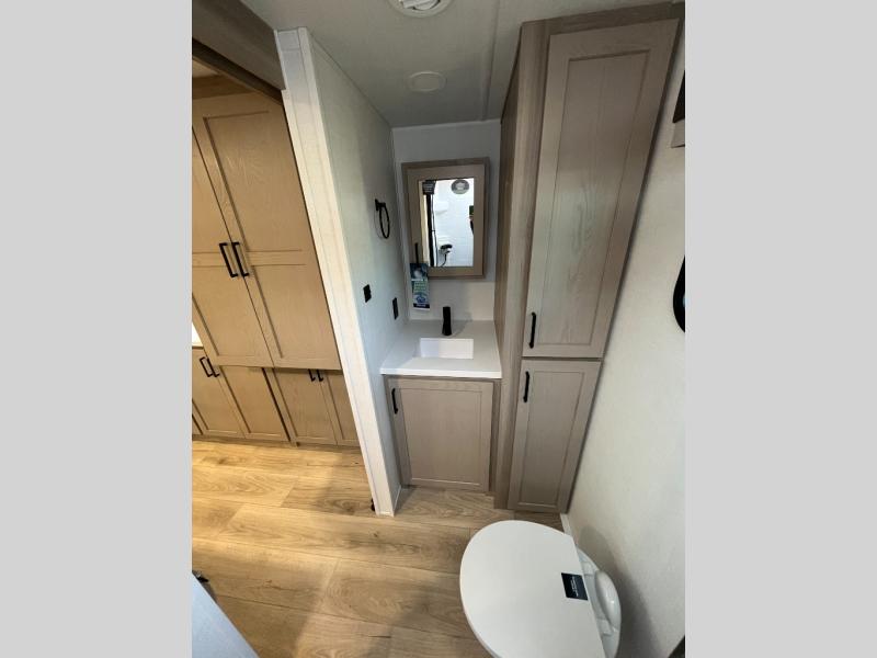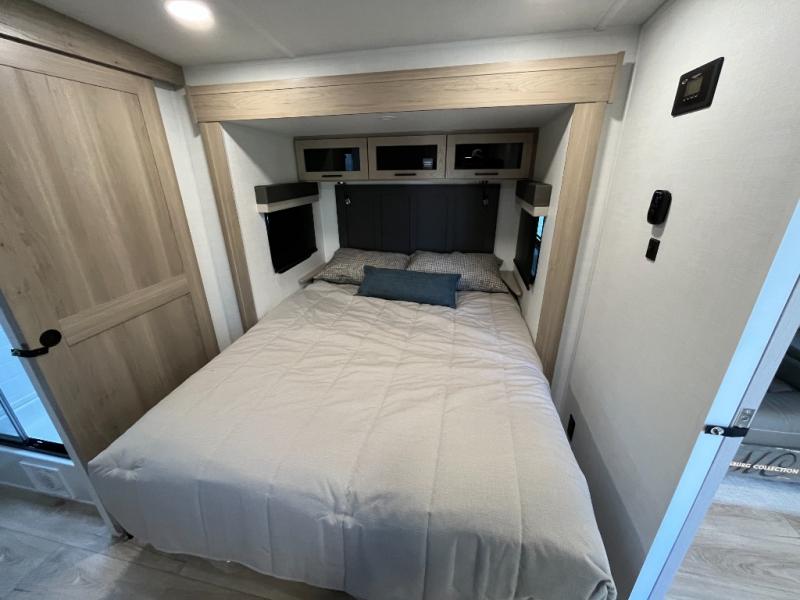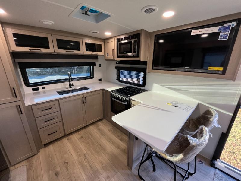 This front kitchen travel trailer is sure to make all your camping wishes come true. It's perfect for a couple since there is a master bedroom with a 60" x 80" queen bed, plus a theater seat in the main living area. If you're needing additional sleeping spaces, just choose the optional hide-a-bed sofa in place of the theater seat. The generous counter space in the kitchen will give you plenty of space to prep meals, and there is a bartop with stools where you can dine together. Along with the queen bed slide, the bedroom also includes a dresser, a TV option, plus a wardrobe with washer and dryer prep if you choose to add these appliances. And don't overlook the full rear bath to freshen up each day!