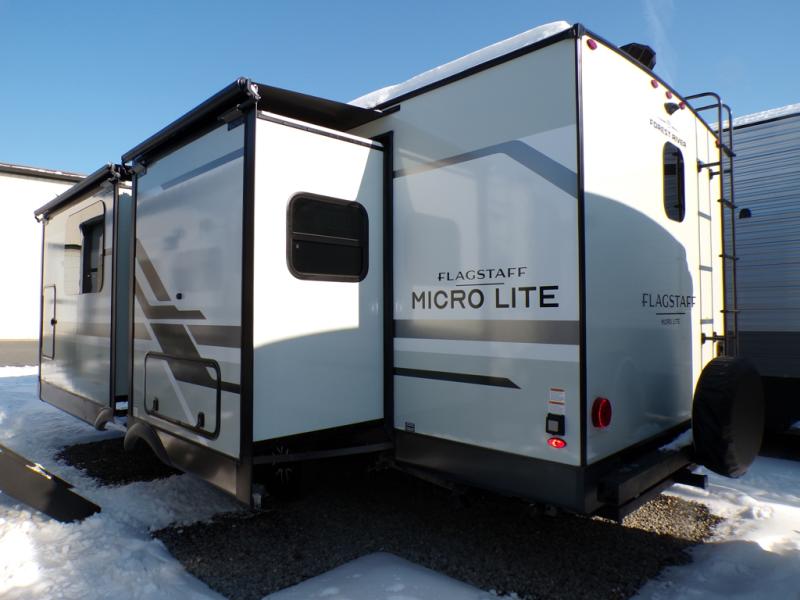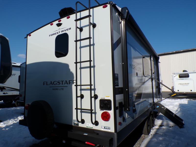 With any Flagstaff Micro Lite travel trailer by Forest River you will enjoy lightweight towing, durable construction, and added interior comforts to make each trip memorable! Each model features RoadTech tire pressure monitoring, Dexter Torflex axles, and nitrogen-filled Goodyear endurance tires for smooth towing from home to campground. The 6-sided aluminum framed construction provides a strong foundation so you can enjoy your RV for years to come, plus the radiant foil in the front cap, underbelly and slides help insulate your trailer. Additional exterior features include a 200W solar panel, back-up camera prep, frameless windows, and slam baggage doors. Each model includes the Great Expectations Package with roller shades, solid surface kitchen countertops, and hidden hinge cabinet doors. There is also an exterior hot/cold water port, outside speakers, a power tongue jack and stabilizer jacks, plus many more conveniences.