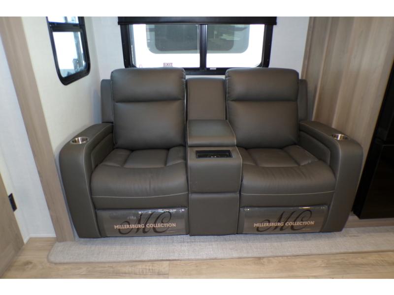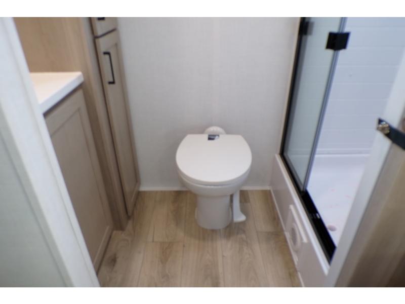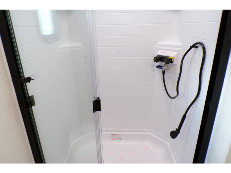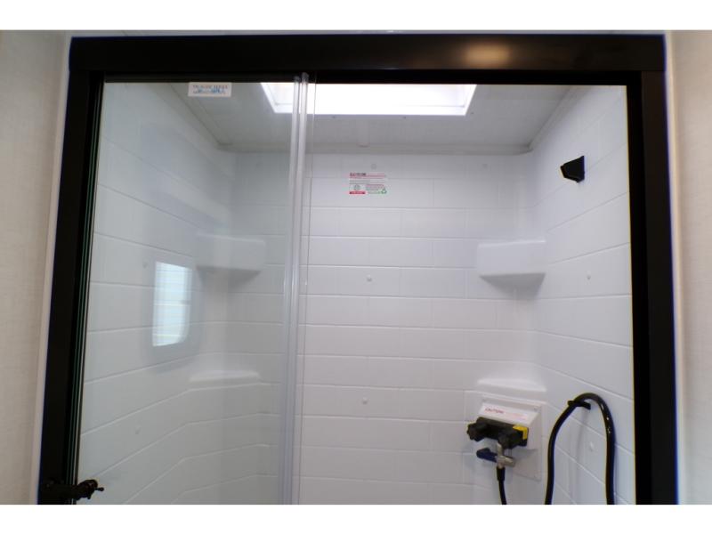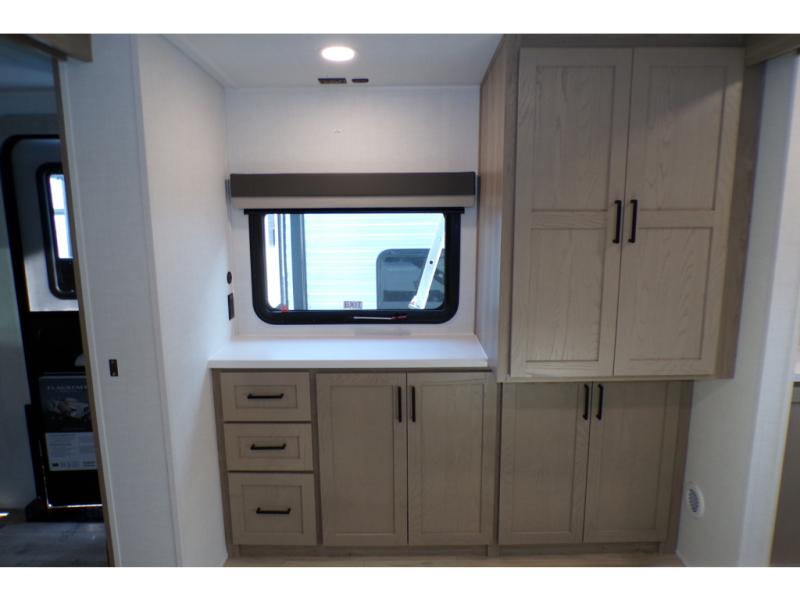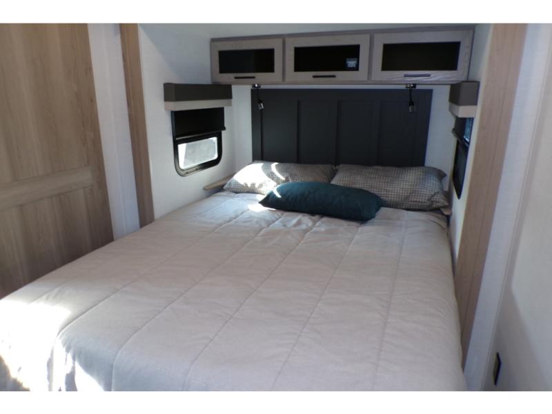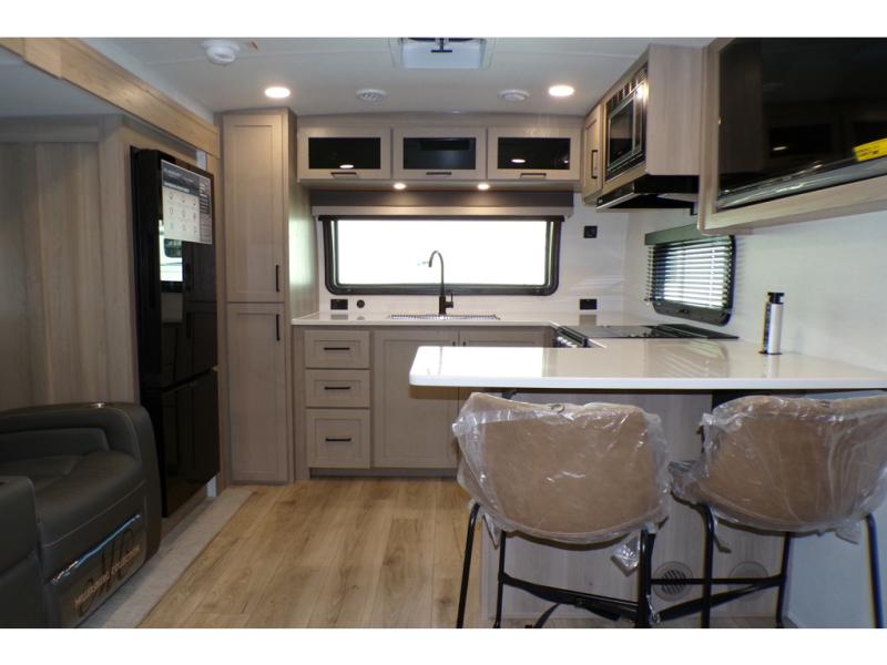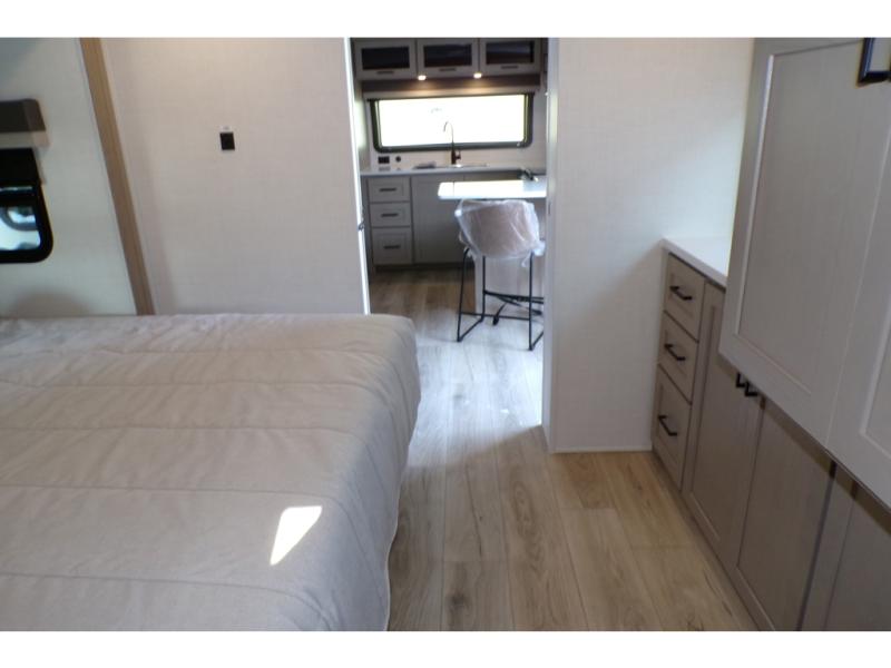 This front kitchen travel trailer is sure to make all your camping wishes come true. It's perfect for a couple since there is a master bedroom with a 60" x 80" queen bed, plus a theater seat in the main living area. If you're needing additional sleeping spaces, just choose the optional hide-a-bed sofa in place of the theater seat. The generous counter space in the kitchen will give you plenty of space to prep meals, and there is a bartop with stools where you can dine together. Along with the queen bed slide, the bedroom also includes a dresser, a TV option, plus a wardrobe with washer and dryer prep if you choose to add these appliances. And don't overlook the full rear bath to freshen up each day!