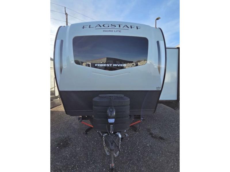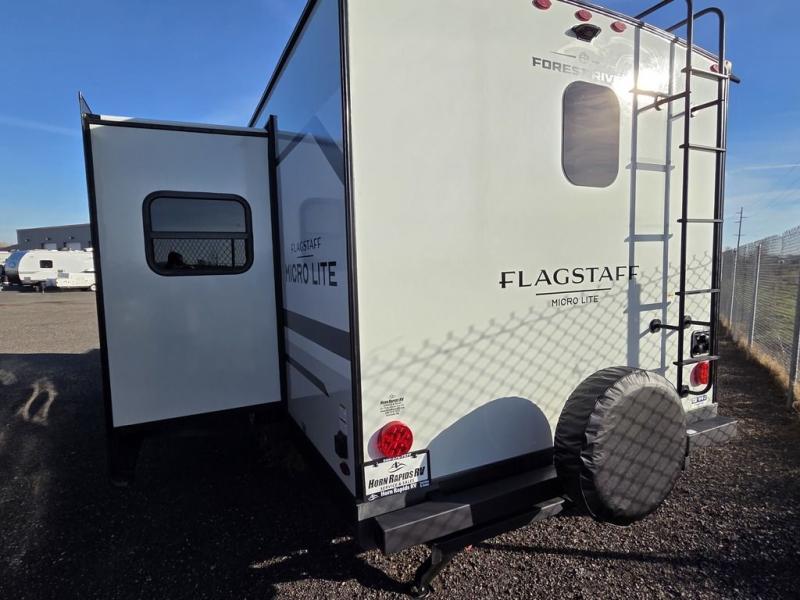 With any Flagstaff Micro Lite travel trailer by Forest River you will enjoy lightweight towing, durable construction, and added interior comforts to make each trip memorable! Each model features RoadTech tire pressure monitoring, Dexter Torflex axles, and nitrogen-filled Goodyear endurance tires for smooth towing from home to campground. The 6-sided aluminum framed construction provides a strong foundation so you can enjoy your RV for years to come, plus the radiant foil in the front cap, underbelly and slides help insulate your trailer. Additional exterior features include a 200W solar panel, back-up camera prep, frameless windows, and slam baggage doors. Each model includes the Great Expectations Package with roller shades, solid surface kitchen countertops, and hidden hinge cabinet doors. There is also an exterior hot/cold water port, outside speakers, a power tongue jack and stabilizer jacks, plus many more conveniences.