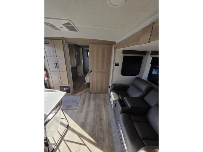 This front kitchen travel trailer is sure to make all your camping wishes come true. It's perfect for a couple since there is a master bedroom with a 60" x 80" queen bed, plus a theater seat in the main living area. If you're needing additional sleeping spaces, just choose the optional hide-a-bed sofa in place of the theater seat. The generous counter space in the kitchen will give you plenty of space to prep meals, and there is a bartop with stools where you can dine together. Along with the queen bed slide, the bedroom also includes a dresser, a TV option, plus a wardrobe with washer and dryer prep if you choose to add these appliances. And don't overlook the full rear bath to freshen up each day!