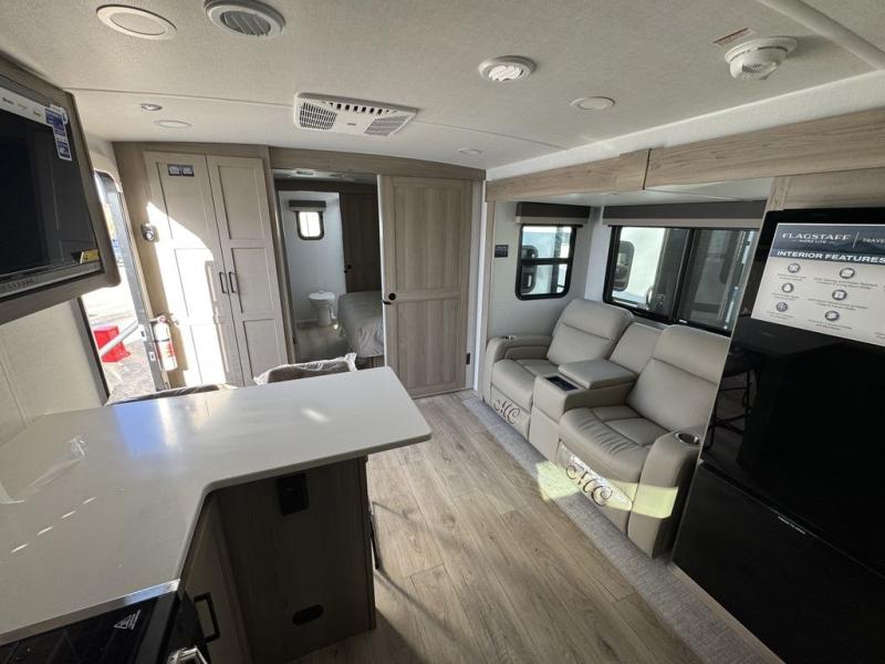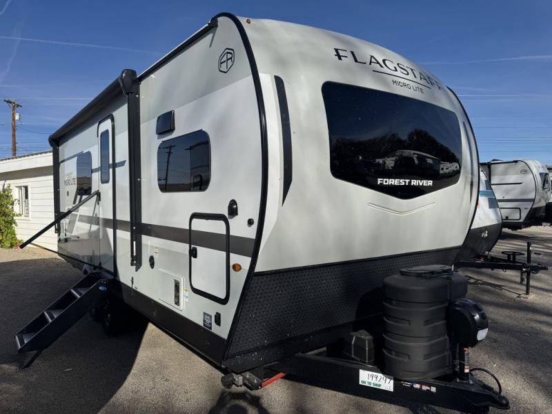 With any Flagstaff Micro Lite travel trailer by Forest River you will enjoy lightweight towing, durable construction, and added interior comforts to make each trip memorable! Each model features RoadTech tire pressure monitoring, Dexter Torflex axles, and nitrogen-filled Goodyear endurance tires for smooth towing from home to campground. The 6-sided aluminum framed construction provides a strong foundation so you can enjoy your RV for years to come, plus the radiant foil in the front cap, underbelly and slides help insulate your trailer. Additional exterior features include a 200W solar panel, back-up camera prep, frameless windows, and slam baggage doors. Each model includes the Great Expectations Package with roller shades, solid surface kitchen countertops, and hidden hinge cabinet doors. There is also an exterior hot/cold water port, outside speakers, a power tongue jack and stabilizer jacks, plus many more conveniences.