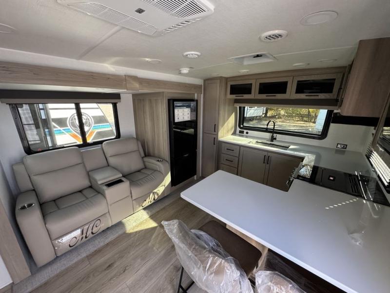 This front kitchen travel trailer is sure to make all your camping wishes come true. It's perfect for a couple since there is a master bedroom with a 60" x 80" queen bed, plus a theater seat in the main living area. If you're needing additional sleeping spaces, just choose the optional hide-a-bed sofa in place of the theater seat. The generous counter space in the kitchen will give you plenty of space to prep meals, and there is a bartop with stools where you can dine together. Along with the queen bed slide, the bedroom also includes a dresser, a TV option, plus a wardrobe with washer and dryer prep if you choose to add these appliances. And don't overlook the full rear bath to freshen up each day!