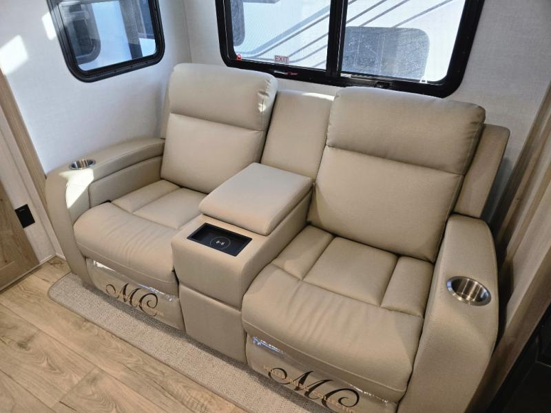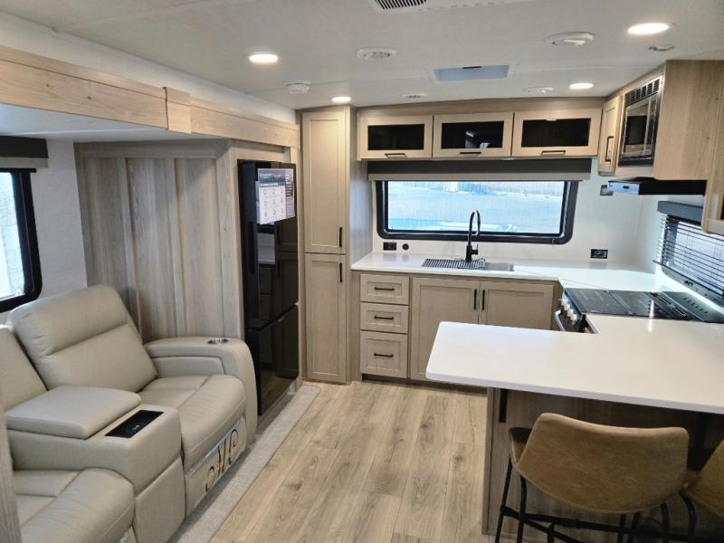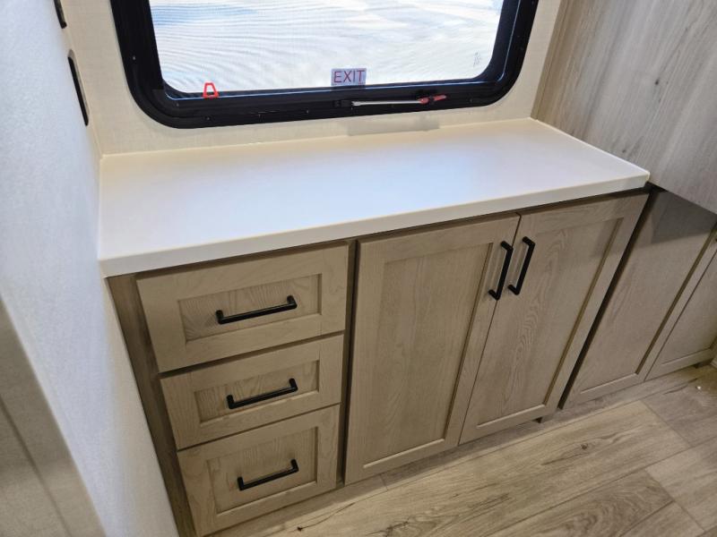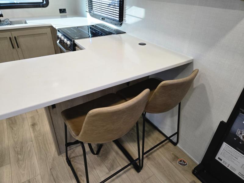 This front kitchen travel trailer is sure to make all your camping wishes come true. It's perfect for a couple since there is a master bedroom with a 60" x 80" queen bed, plus a theater seat in the main living area. If you're needing additional sleeping spaces, just choose the optional hide-a-bed sofa in place of the theater seat. The generous counter space in the kitchen will give you plenty of space to prep meals, and there is a bartop with stools where you can dine together. Along with the queen bed slide, the bedroom also includes a dresser, a TV option, plus a wardrobe with washer and dryer prep if you choose to add these appliances. And don't overlook the full rear bath to freshen up each day!