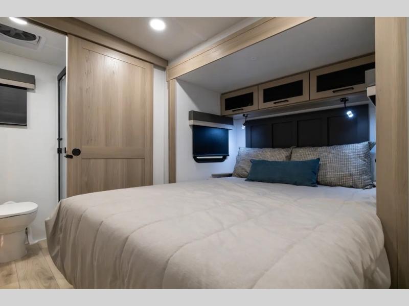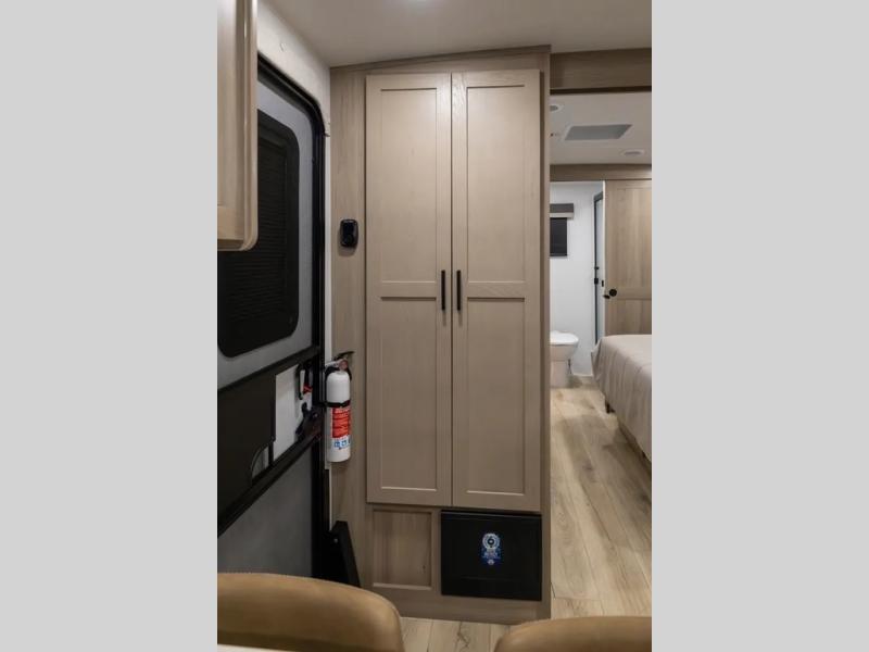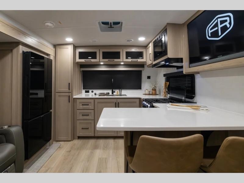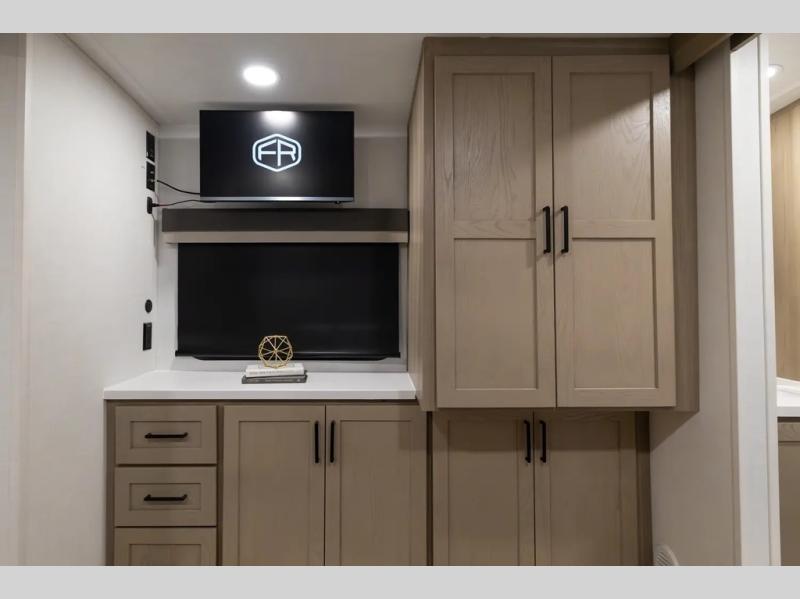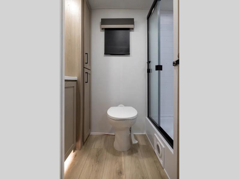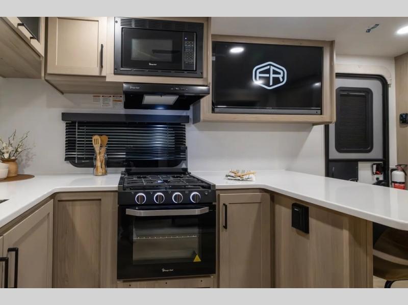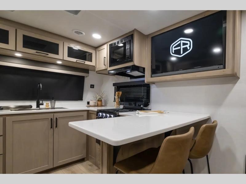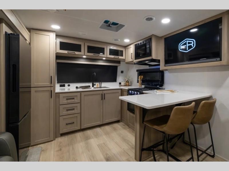 This front kitchen travel trailer is sure to make all your camping wishes come true. It's perfect for a couple since there is a master bedroom with a 60" x 80" queen bed, plus a theater seat in the main living area. If you're needing additional sleeping spaces, just choose the optional hide-a-bed sofa in place of the theater seat. The generous counter space in the kitchen will give you plenty of space to prep meals, and there is a bartop with stools where you can dine together. Along with the queen bed slide, the bedroom also includes a dresser, a TV option, plus a wardrobe with washer and dryer prep if you choose to add these appliances. And don't overlook the full rear bath to freshen up each day!