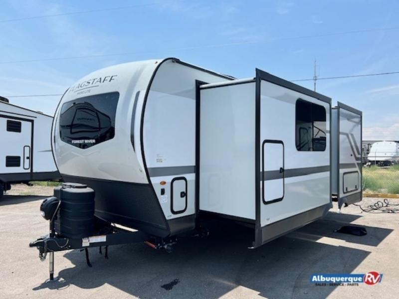With any Flagstaff Micro Lite travel trailer by Forest River you will enjoy lightweight towing, durable construction, and added interior comforts to make each trip memorable! Each model features RoadTech tire pressure monitoring, Dexter Torflex axles, and nitrogen-filled Goodyear endurance tires for smooth towing from home to campground. The 6-sided aluminum framed construction provides a strong foundation so you can enjoy your RV for years to come, plus the radiant foil in the front cap, underbelly and slides help insulate your trailer. Additional exterior features include a 200W solar panel, back-up camera prep, frameless windows, and slam baggage doors. Each model includes the Great Expectations Package with roller shades, solid surface kitchen countertops, and hidden hinge cabinet doors. There is also an exterior hot/cold water port, outside speakers, a power tongue jack and stabilizer jacks, plus many more conveniences.