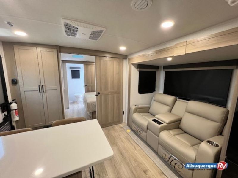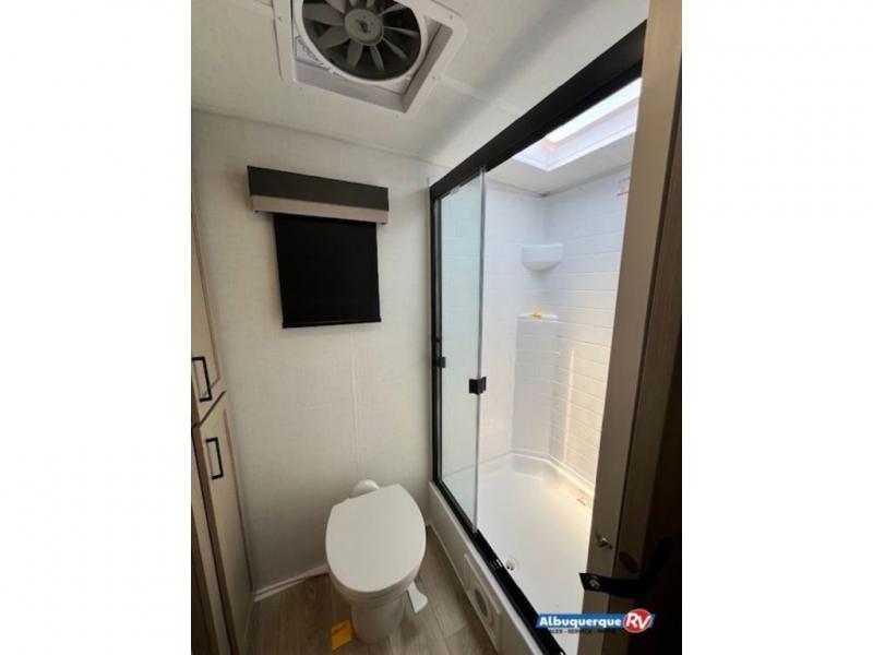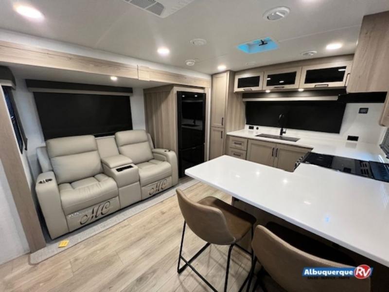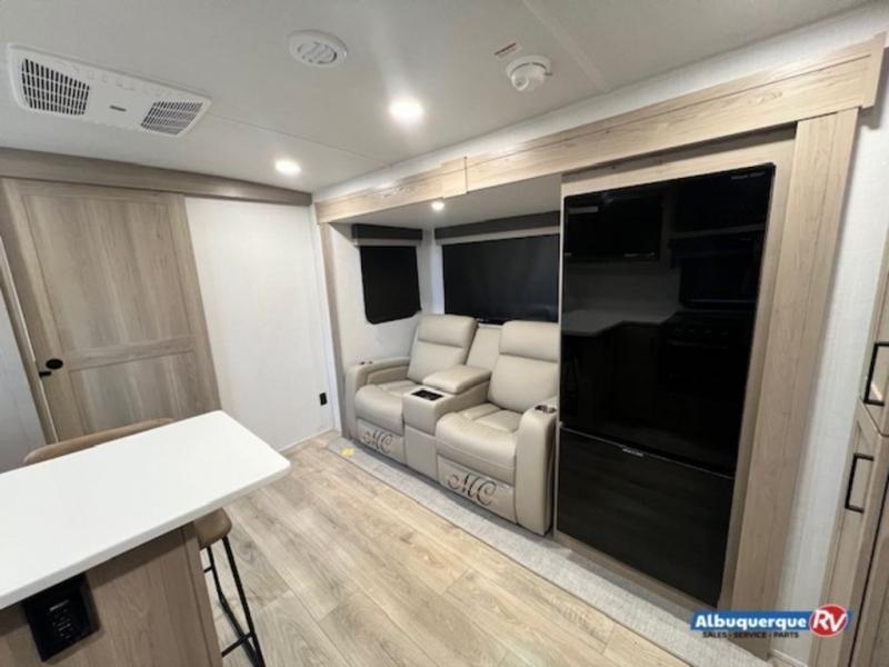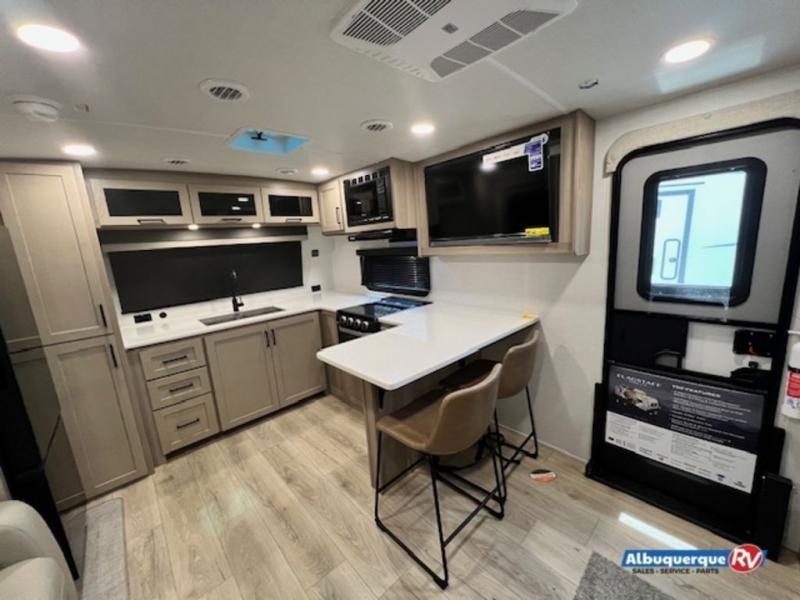 This front kitchen travel trailer is sure to make all your camping wishes come true. It's perfect for a couple since there is a master bedroom with a 60" x 80" queen bed, plus a theater seat in the main living area. If you're needing additional sleeping spaces, just choose the optional hide-a-bed sofa in place of the theater seat. The generous counter space in the kitchen will give you plenty of space to prep meals, and there is a bartop with stools where you can dine together. Along with the queen bed slide, the bedroom also includes a dresser, a TV option, plus a wardrobe with washer and dryer prep if you choose to add these appliances. And don't overlook the full rear bath to freshen up each day!