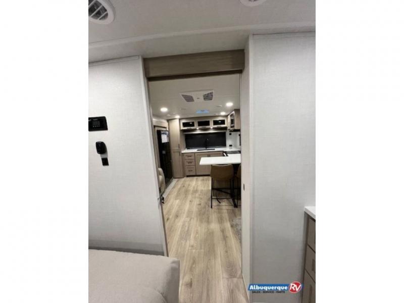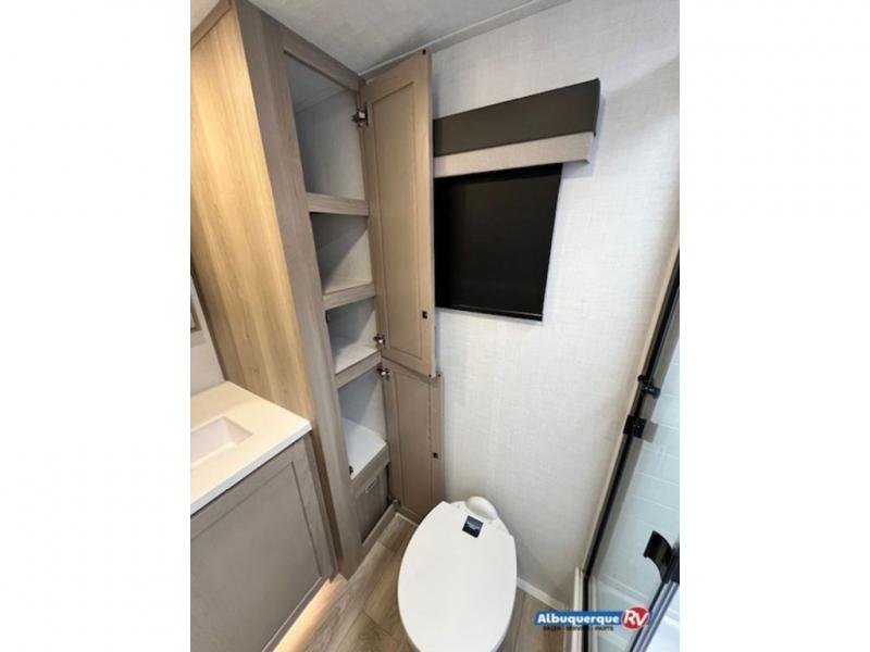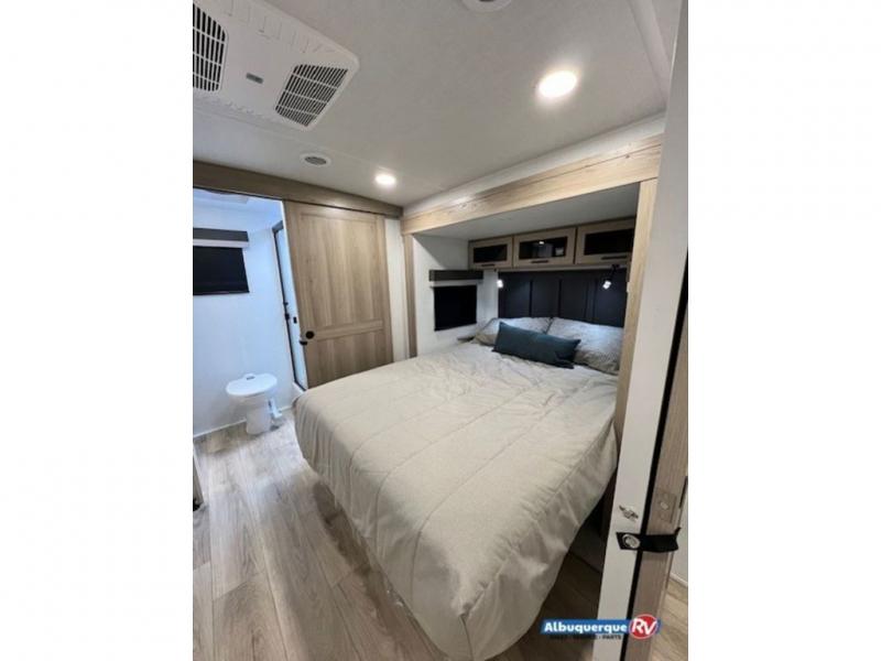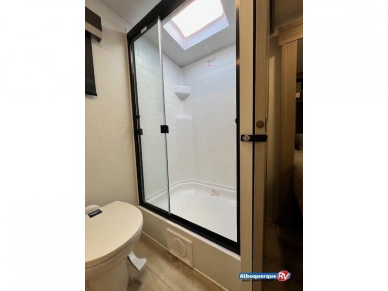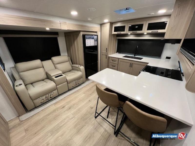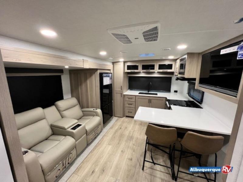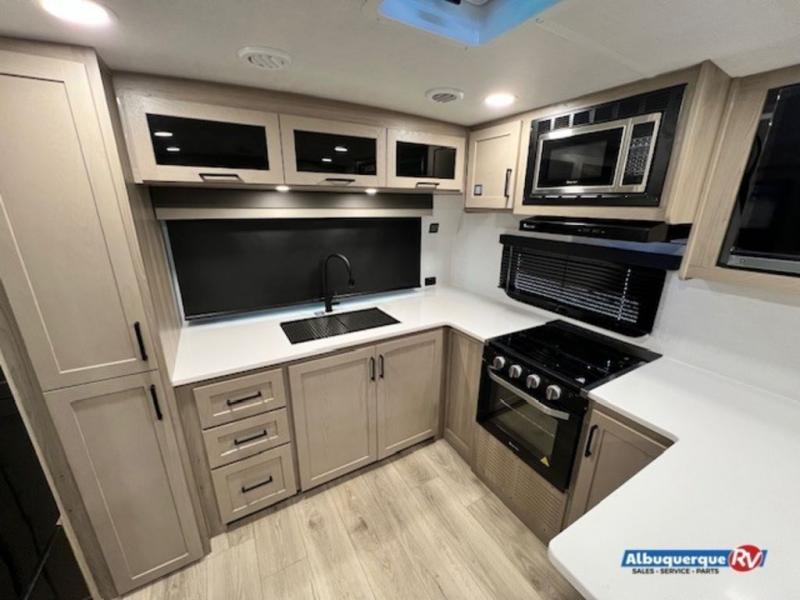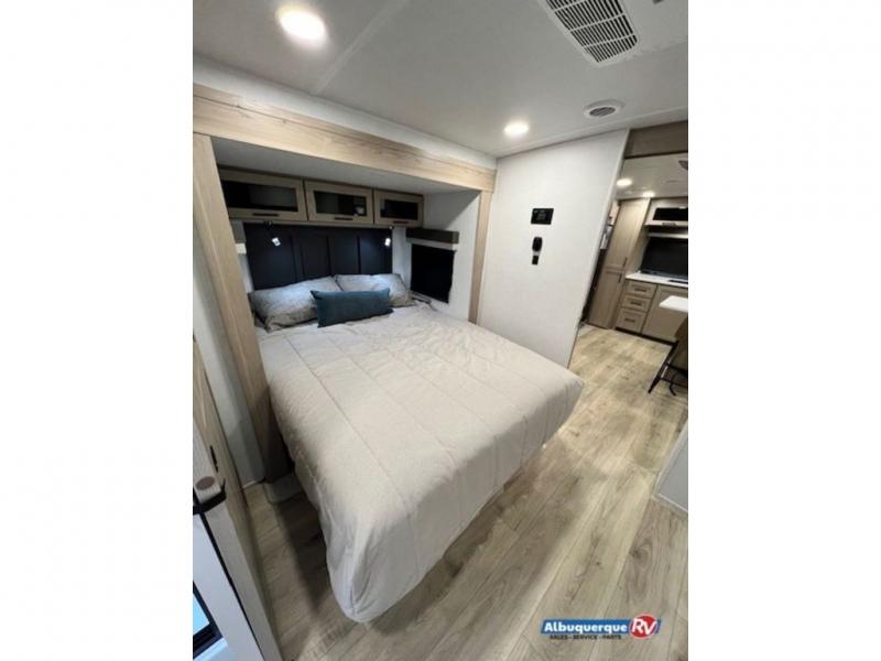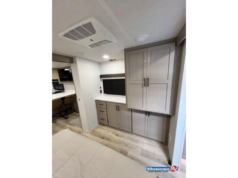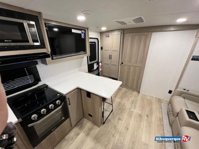 This front kitchen travel trailer is sure to make all your camping wishes come true. It's perfect for a couple since there is a master bedroom with a 60" x 80" queen bed, plus a theater seat in the main living area. If you're needing additional sleeping spaces, just choose the optional hide-a-bed sofa in place of the theater seat. The generous counter space in the kitchen will give you plenty of space to prep meals, and there is a bartop with stools where you can dine together. Along with the queen bed slide, the bedroom also includes a dresser, a TV option, plus a wardrobe with washer and dryer prep if you choose to add these appliances. And don't overlook the full rear bath to freshen up each day!
