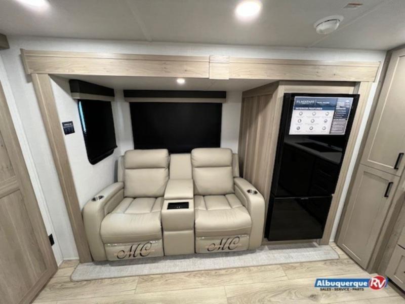 This front kitchen travel trailer is sure to make all your camping wishes come true. It's perfect for a couple since there is a master bedroom with a 60" x 80" queen bed, plus a theater seat in the main living area. If you're needing additional sleeping spaces, just choose the optional hide-a-bed sofa in place of the theater seat. The generous counter space in the kitchen will give you plenty of space to prep meals, and there is a bartop with stools where you can dine together. Along with the queen bed slide, the bedroom also includes a dresser, a TV option, plus a wardrobe with washer and dryer prep if you choose to add these appliances. And don't overlook the full rear bath to freshen up each day!