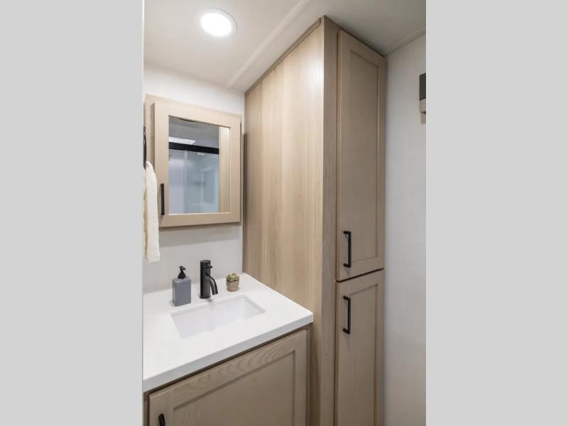 This front kitchen travel trailer is sure to make all your camping wishes come true. It's perfect for a couple since there is a master bedroom with a 60" x 80" queen bed, plus a theater seat in the main living area. If you're needing additional sleeping spaces, just choose the optional hide-a-bed sofa in place of the theater seat. The generous counter space in the kitchen will give you plenty of space to prep meals, and there is a bartop with stools where you can dine together. Along with the queen bed slide, the bedroom also includes a dresser, a TV option, plus a wardrobe with washer and dryer prep if you choose to add these appliances. And don't overlook the full rear bath to freshen up each day!