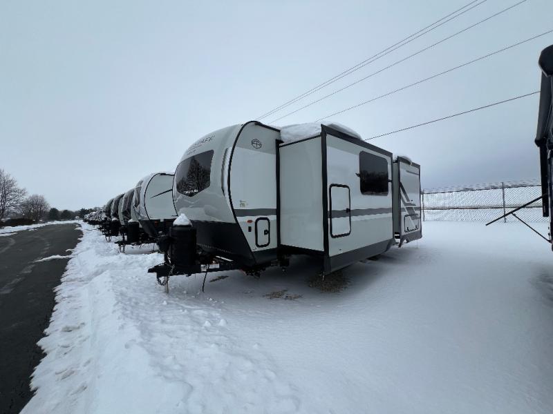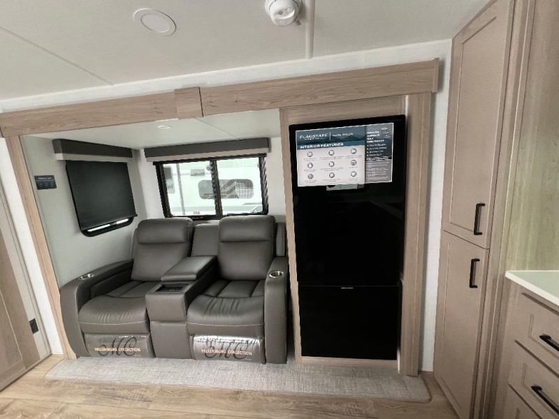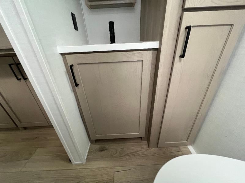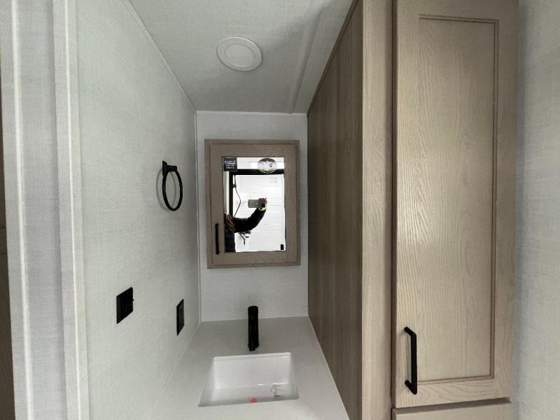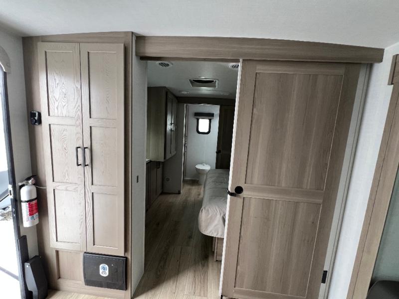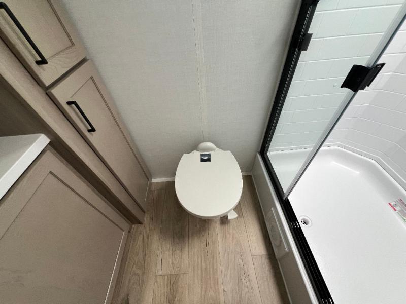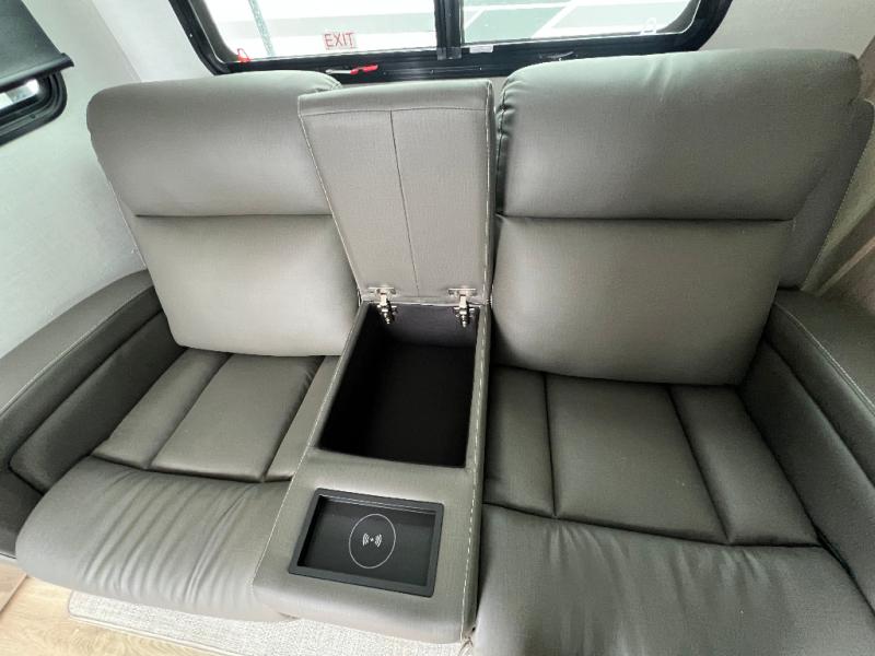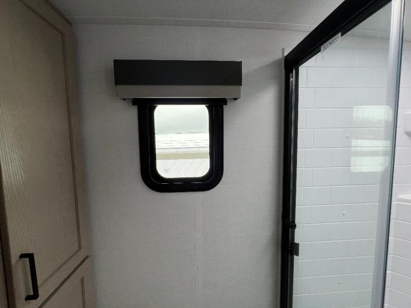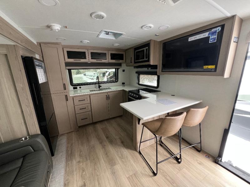 This front kitchen travel trailer is sure to make all your camping wishes come true. It's perfect for a couple since there is a master bedroom with a 60" x 80" queen bed, plus a theater seat in the main living area. If you're needing additional sleeping spaces, just choose the optional hide-a-bed sofa in place of the theater seat. The generous counter space in the kitchen will give you plenty of space to prep meals, and there is a bartop with stools where you can dine together. Along with the queen bed slide, the bedroom also includes a dresser, a TV option, plus a wardrobe with washer and dryer prep if you choose to add these appliances. And don't overlook the full rear bath to freshen up each day!