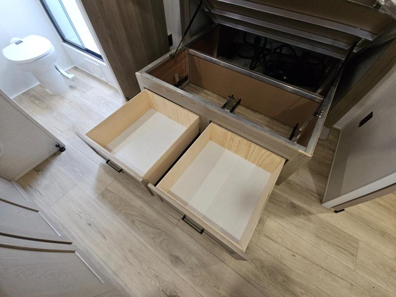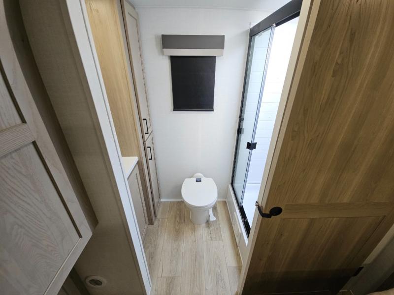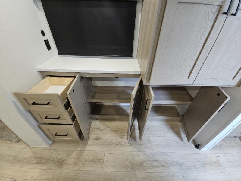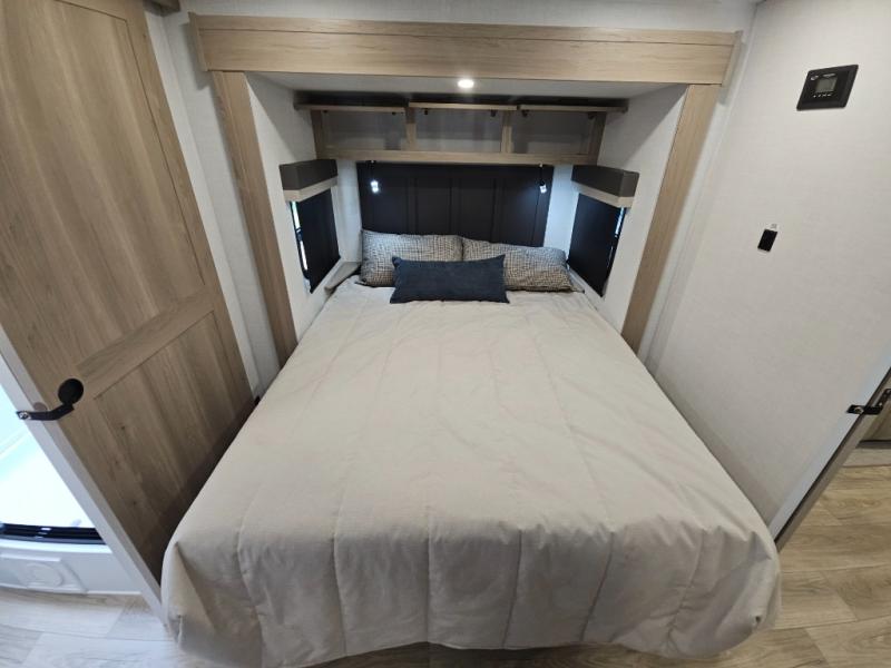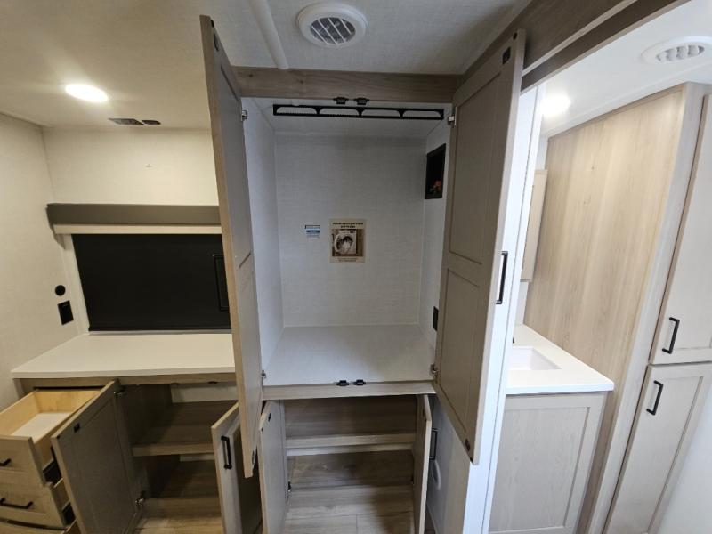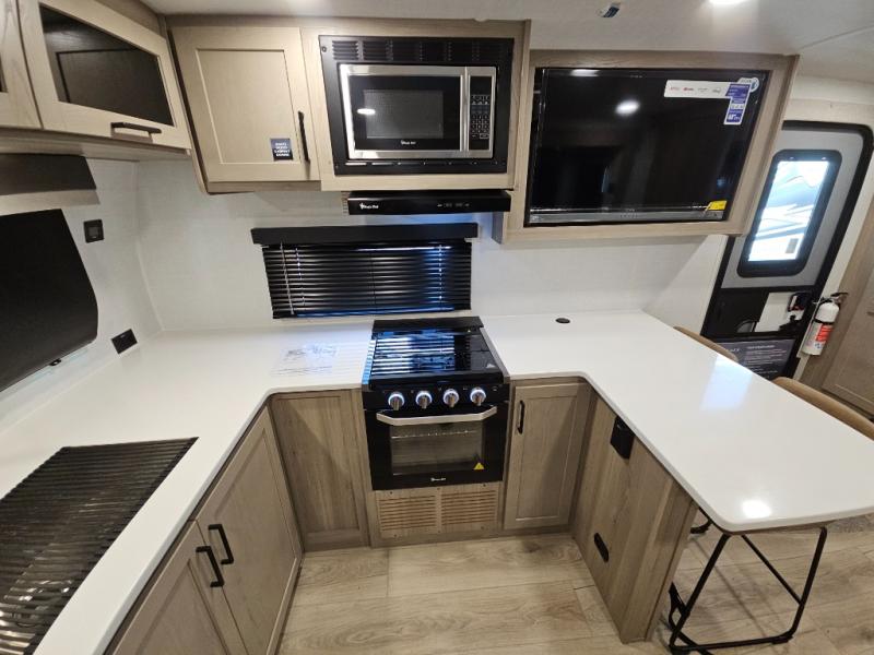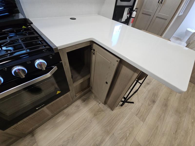 This front kitchen travel trailer is sure to make all your camping wishes come true. It's perfect for a couple since there is a master bedroom with a 60" x 80" queen bed, plus a theater seat in the main living area. If you're needing additional sleeping spaces, just choose the optional hide-a-bed sofa in place of the theater seat. The generous counter space in the kitchen will give you plenty of space to prep meals, and there is a bartop with stools where you can dine together. Along with the queen bed slide, the bedroom also includes a dresser, a TV option, plus a wardrobe with washer and dryer prep if you choose to add these appliances. And don't overlook the full rear bath to freshen up each day!