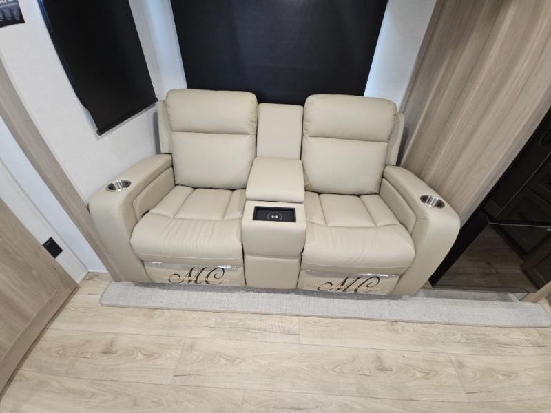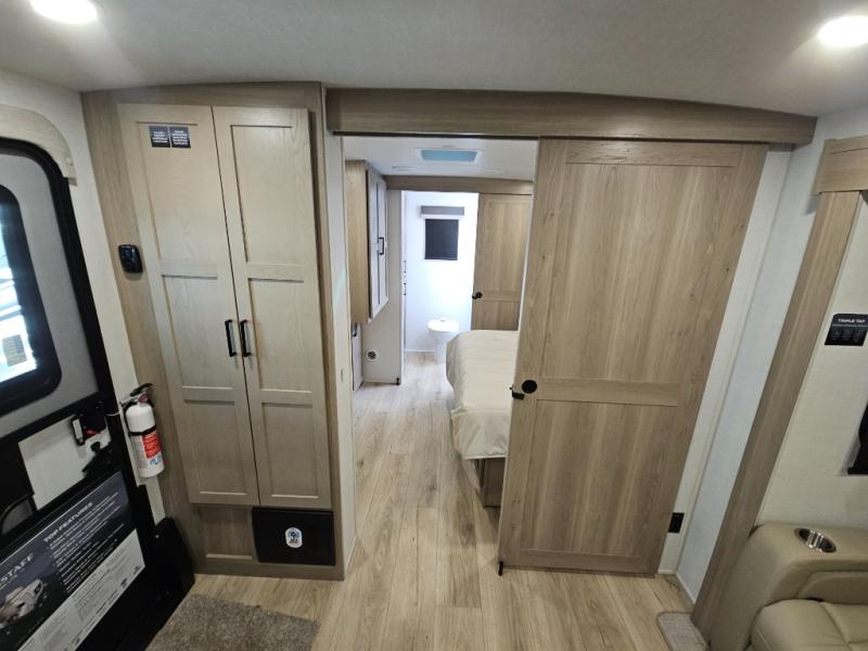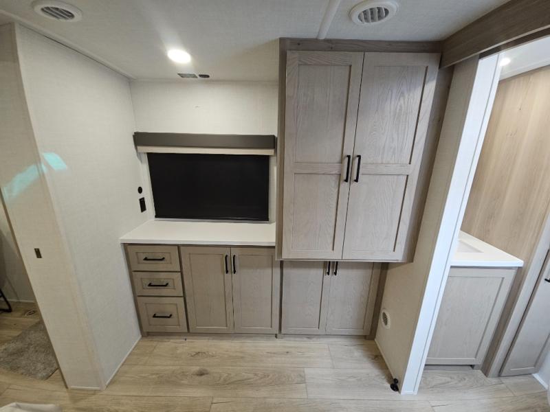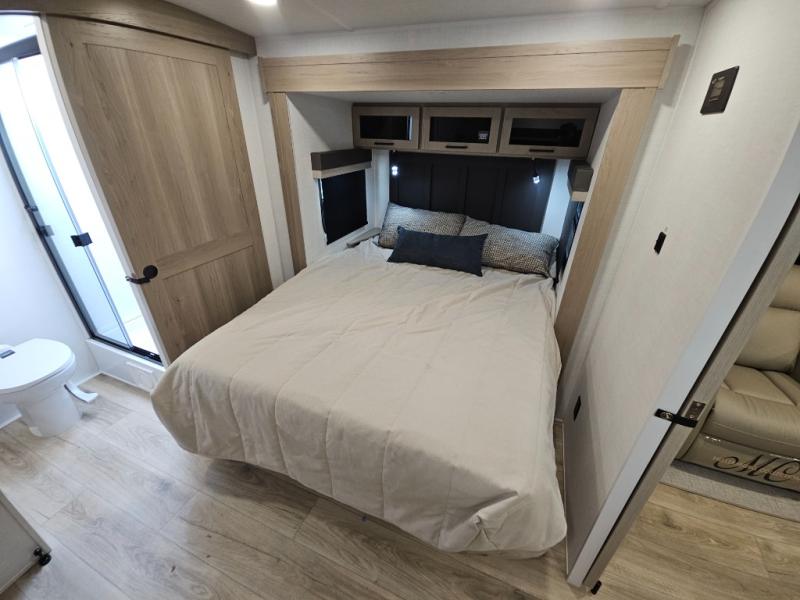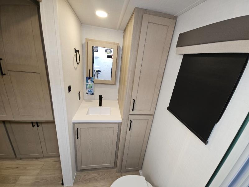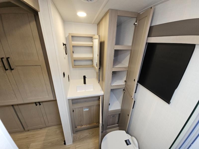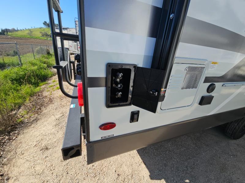 This front kitchen travel trailer is sure to make all your camping wishes come true. It's perfect for a couple since there is a master bedroom with a 60" x 80" queen bed, plus a theater seat in the main living area. If you're needing additional sleeping spaces, just choose the optional hide-a-bed sofa in place of the theater seat. The generous counter space in the kitchen will give you plenty of space to prep meals, and there is a bartop with stools where you can dine together. Along with the queen bed slide, the bedroom also includes a dresser, a TV option, plus a wardrobe with washer and dryer prep if you choose to add these appliances. And don't overlook the full rear bath to freshen up each day!