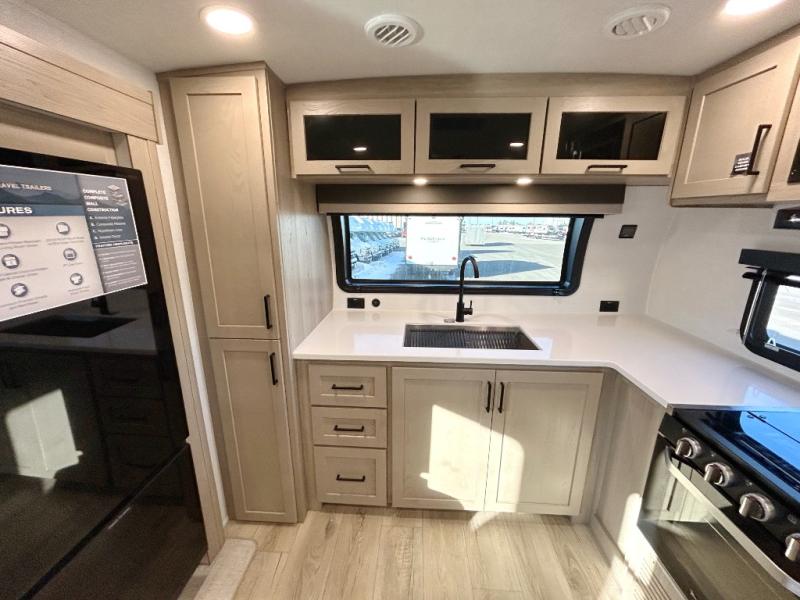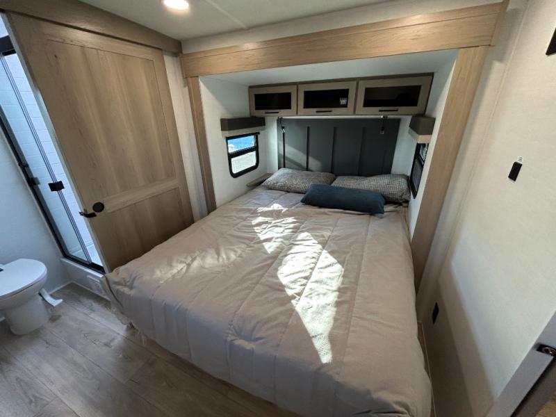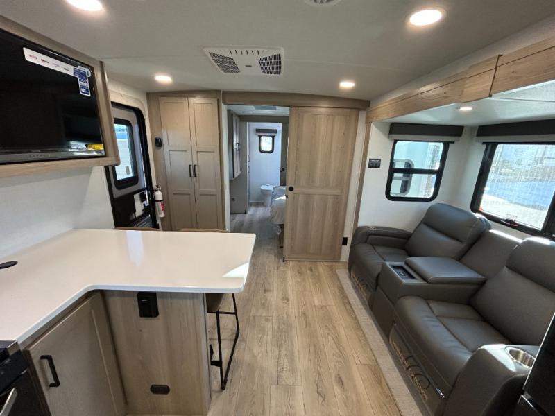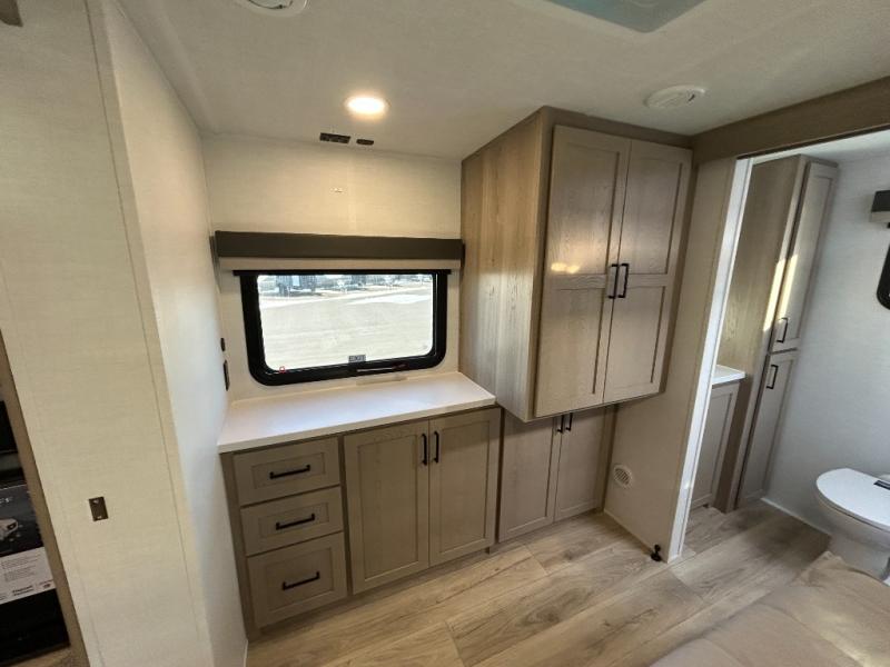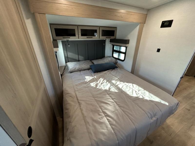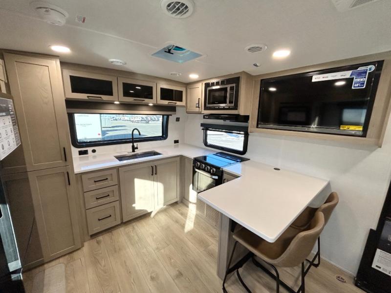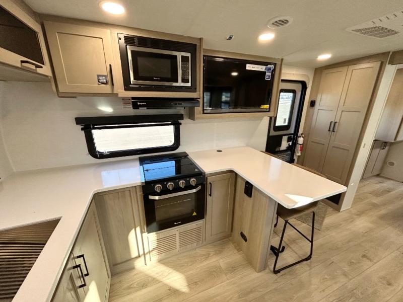 This front kitchen travel trailer is sure to make all your camping wishes come true. It's perfect for a couple since there is a master bedroom with a 60" x 80" queen bed, plus a theater seat in the main living area. If you're needing additional sleeping spaces, just choose the optional hide-a-bed sofa in place of the theater seat. The generous counter space in the kitchen will give you plenty of space to prep meals, and there is a bartop with stools where you can dine together. Along with the queen bed slide, the bedroom also includes a dresser, a TV option, plus a wardrobe with washer and dryer prep if you choose to add these appliances. And don't overlook the full rear bath to freshen up each day!